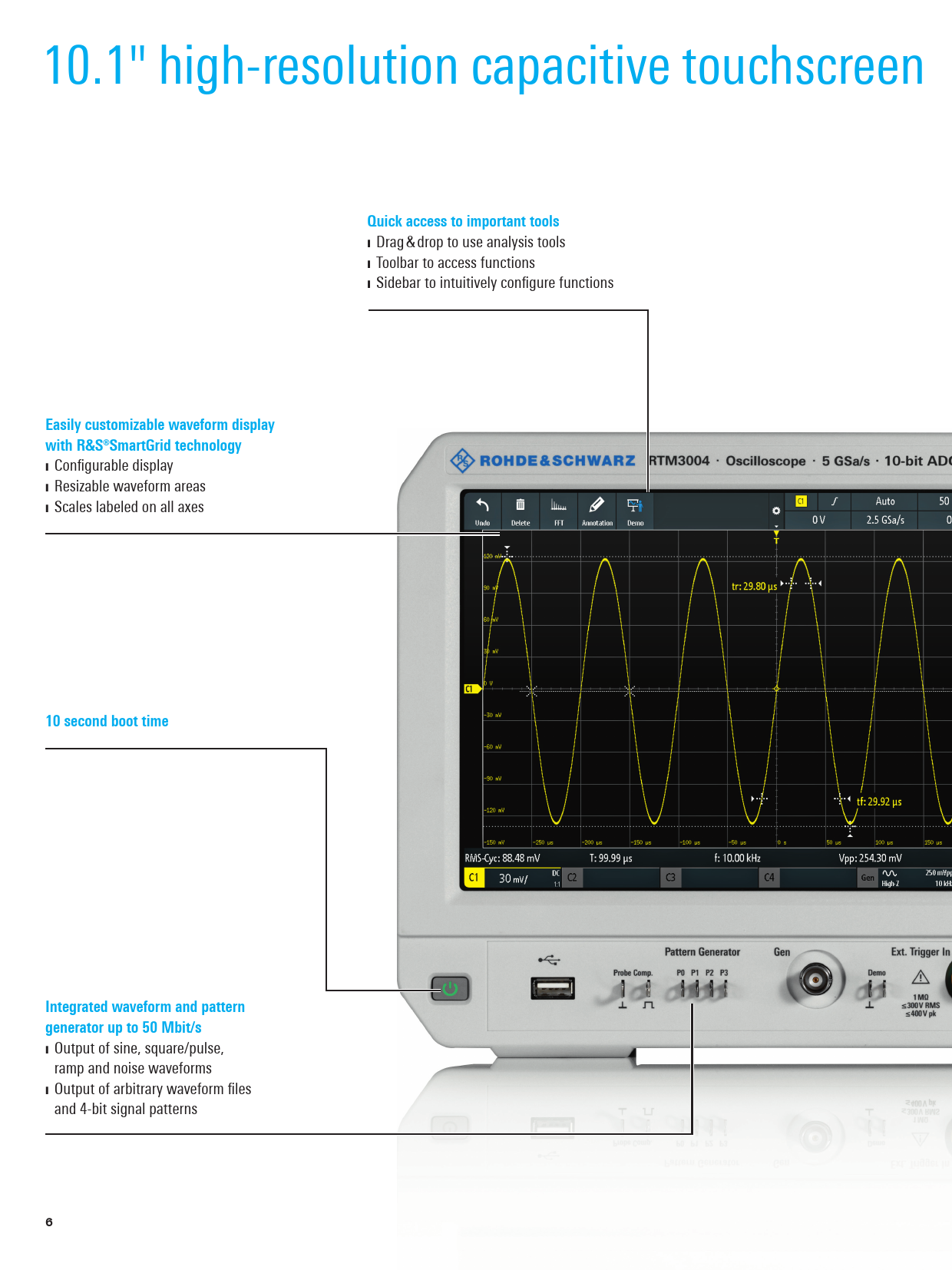 10.1" high-resolution capacitive touchscreen with gesture support Quick access to important tools ❙ Drag & drop to use analysis tools ❙ Toolbar to access functions ❙ Sidebar to intuitively configure functions Easily customizable waveform display with R&S®SmartGrid technology ❙ Configurable display ❙ Resizable waveform areas ❙ Scales labeled on all axes 10 second boot timeIntegrated waveform and pattern generator up to 50 Mbit/s ❙ Output of sine, square/pulse, ramp and noise waveforms ❙ Output of arbitrary waveform files and 4-bit signal patterns 6 RTM3000_bro_en_5214-9144-12_v0402.indd 6 01.03.2018 08:46:03