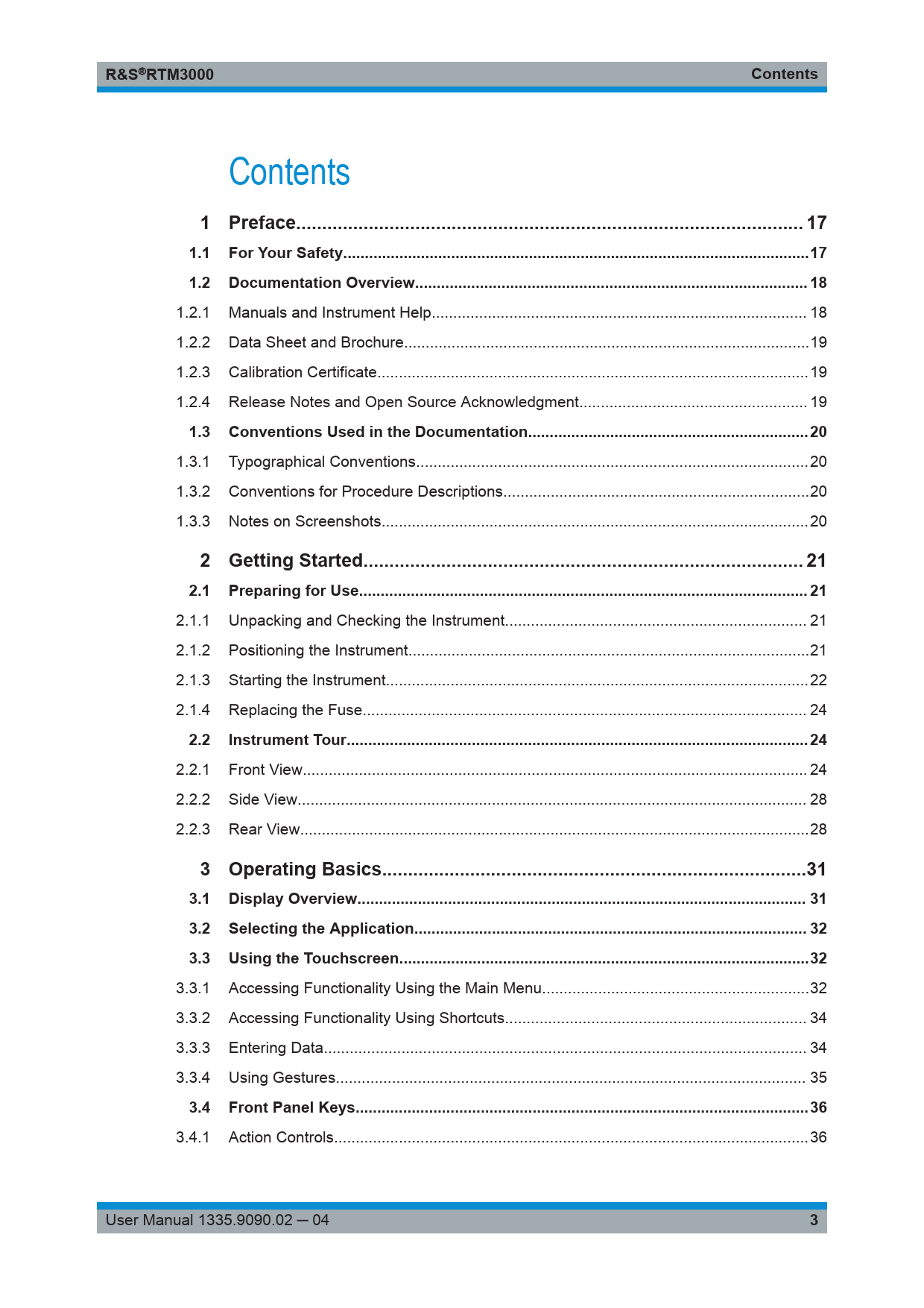 link to page 17 link to page 17 link to page 18 link to page 18 link to page 19 link to page 19 link to page 19 link to page 20 link to page 20 link to page 20 link to page 20 link to page 21 link to page 21 link to page 21 link to page 21 link to page 22 link to page 24 link to page 24 link to page 24 link to page 28 link to page 28 link to page 31 link to page 31 link to page 32 link to page 32 link to page 32 link to page 34 link to page 34 link to page 35 link to page 36 link to page 36 R&S ® RTM3000Contents Contents 1 Preface.. 171.1For Your Safety..171.2Documentation Overview... 18 1.2.1 Manuals and Instrument Help... 18 1.2.2 Data Sheet and Brochure..19 1.2.3 Calibration Certificate..19 1.2.4 Release Notes and Open Source Acknowledgment... 19 1.3Conventions Used in the Documentation...20 1.3.1 Typographical Conventions...20 1.3.2 Conventions for Procedure Descriptions...20 1.3.3 Notes on Screenshots...20 2 Getting Started... 212.1Preparing for Use.. 21 2.1.1 Unpacking and Checking the Instrument.. 21 2.1.2 Positioning the Instrument...21 2.1.3 Starting the Instrument..22 2.1.4 Replacing the Fuse... 24 2.2Instrument Tour...24 2.2.1 Front View... 24 2.2.2 Side View.. 28 2.2.3 Rear View..28 3 Operating Basics..313.1Display Overview.. 313.2Selecting the Application... 323.3Using the Touchscreen...32 3.3.1 Accessing Functionality Using the Main Menu..32 3.3.2 Accessing Functionality Using Shortcuts.. 34 3.3.3 Entering Data.. 34 3.3.4 Using Gestures... 35 3.4Front Panel Keys...36 3.4.1 Action Controls..36 User Manual 1335.9090.02 ─ 04 3 Document Outline Cover Contents 1 Preface 1.1 For Your Safety 1.2 Documentation Overview 1.2.1 Manuals and Instrument Help 1.2.2 Data Sheet and Brochure 1.2.3 Calibration Certificate 1.2.4 Release Notes and Open Source Acknowledgment 1.3 Conventions Used in the Documentation 1.3.1 Typographical Conventions 1.3.2 Conventions for Procedure Descriptions 1.3.3 Notes on Screenshots 2 Getting Started 2.1 Preparing for Use 2.1.1 Unpacking and Checking the Instrument 2.1.2 Positioning the Instrument 2.1.3 Starting the Instrument 2.1.4 Replacing the Fuse 2.2 Instrument Tour 2.2.1 Front View 2.2.1.1 Input Connectors 2.2.1.2 Other Connectors on the Front Panel 2.2.2 Side View 2.2.3 Rear View 3 Operating Basics 3.1 Display Overview 3.2 Selecting the Application 3.3 Using the Touchscreen 3.3.1 Accessing Functionality Using the Main Menu 3.3.2 Accessing Functionality Using Shortcuts 3.3.3 Entering Data 3.3.4 Using Gestures 3.4 Front Panel Keys 3.4.1 Action Controls 3.4.2 Analysis Controls 3.5 Using the Toolbar 3.6 Quick Access 3.7 Menu History 3.8 Getting Help 4 Waveform Setup 4.1 Connecting Probes and Displaying a Signal 4.2 Adjusting Passive Probes 4.3 Vertical Setup 4.3.1 VERTICAL Controls 4.3.2 Short Menu for Analog Channels 4.3.3 Vertical Settings 4.3.4 Probe Settings for Probes with BNC Connector 4.3.5 Probe Settings for Probes with Rohde & Schwarz Interface 4.3.5.1 Active Broadband Single-Ended Probes 4.3.5.2 Active Broadband Differential Probes 4.3.5.3 Current Probes 4.3.5.4 High-Voltage Differential Probes 4.3.5.5 Power Rail Probes 4.3.6 Threshold Settings 4.3.7 Label Settings 4.4 Horizontal Setup 4.4.1 HORIZONTAL Controls 4.4.2 Shortcuts for Horizontal Settings 4.4.3 Horizontal Settings 4.5 Acquisition Setup 4.5.1 Shortcuts for Acquisition Settings 4.5.2 Acquisition Settings 5 Trigger 5.1 Trigger Controls 5.2 Shortcuts for Trigger Settings 5.3 General Trigger Settings 5.4 Edge Trigger 5.5 Edge A/B Trigger 5.6 Width Trigger 5.7 Video Trigger 5.8 Pattern Trigger 5.9 Runt Trigger 5.10 Rise Time Trigger 5.11 Timeout Trigger 5.12 Trigger Out Signal 6 Waveform Analysis 6.1 Zoom 6.1.1 Zooming in 6.1.2 Modifying the Zoom 6.1.3 Zoom Settings 6.2 Mathematics 6.2.1 Configuring Math Waveforms 6.2.2 Math Waveform Settings 6.2.3 Saving and Loading Formularies 6.3 Reference Waveforms 6.3.1 Using References 6.3.2 Settings for Reference Waveforms 6.4 History and Segmented Memory (Option R&S RTM-K15) 6.4.1 Segmented Memory 6.4.2 Activating the History 6.4.3 History Settings 6.4.4 Segment Table and History Player 6.4.5 Exporting History Data 6.4.5.1 Saving History to File 6.4.5.2 File Organization and Content 6.5 Search 6.5.1 Search Conditions and Results 6.5.2 General Search Settings 6.5.3 Edge Search 6.5.4 Width Search 6.5.5 Peak Search 6.5.6 Rise/Fall Time Search 6.5.7 Runt Setup 6.5.8 Data2Clock 6.5.9 Pattern Search 6.5.10 Window Search 7 Measurements 7.1 Quick Measurements 7.2 Automatic Measurements 7.2.1 Measurement Results 7.2.2 Measurement Types 7.2.2.1 Horizontal Measurements (Time) 7.2.2.2 Vertical Measurements (Amplitude) 7.2.2.3 Counting 7.2.3 Settings for Automatic Measurements 7.3 Cursor Measurements 7.3.1 Cursor Settings 8 Applications 8.1 Mask Testing 8.1.1 About Masks and Mask Testing 8.1.2 Using Masks 8.1.3 Mask Window 8.1.4 Mask Menu 8.2 FFT Analysis 8.2.1 FFT Display 8.2.2 Performing FFT Analysis 8.2.3 FFT Setup 8.2.3.1 Short Menu for FFT 8.2.3.2 FFT Settings in the Spectrum Window 8.2.3.3 FFT Menu 8.3 Spectrum Analysis and Spectrogram (Option R&S RTM-K18) 8.3.1 FFT Menu with R&S RTM-K18 8.3.2 Spectrum Mode 8.3.3 Spectrogram 8.3.4 Peak List and Markers 8.3.4.1 Marker Menu 8.3.4.2 Peak Setup 8.3.4.3 R-Marker Settings 8.3.5 Display Settings for Spectrum and Spectrogram 8.4 XY-Diagram 8.5 Digital Voltmeter 8.5.1 Using the Meter 8.5.2 Meter Settings 8.6 Trigger Counter 9 Documenting Results 9.1 Saving and Loading Instrument Settings 9.2 Saving Waveform Data 9.2.1 Waveform Export Settings 9.2.2 Waveform File Formats 9.2.2.1 CSV Format 9.2.2.2 TXT Format 9.2.2.3 BIN Format 9.2.2.4 FLT Format 9.2.2.5 TRF Format 9.3 Annotations 9.4 Screenshots 9.5 Quick Save with OneTouch 9.6 Export and Import 10 General Instrument Setup 10.1 Instrument Settings 10.2 Display Settings 10.3 Reset 10.4 Locking the Touchscreen 10.5 Performing a Self-Alignment 10.6 Setting the Data, Time and Language 10.7 Options 10.7.1 Activating Options 10.8 Updating the Firmware 11 Network Connect
