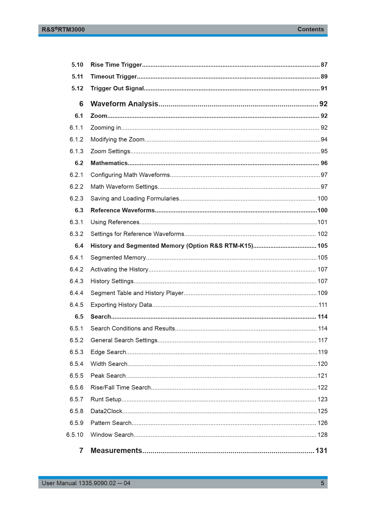 link to page 87 link to page 89 link to page 91 link to page 92 link to page 92 link to page 92 link to page 94 link to page 95 link to page 96 link to page 97 link to page 97 link to page 100 link to page 100 link to page 101 link to page 102 link to page 105 link to page 105 link to page 107 link to page 107 link to page 109 link to page 111 link to page 114 link to page 114 link to page 117 link to page 119 link to page 120 link to page 121 link to page 122 link to page 123 link to page 125 link to page 126 link to page 128 link to page 131 R&S ® RTM3000Contents5.10Rise Time Trigger.. 875.11Timeout Trigger... 895.12Trigger Out Signal... 916 Waveform Analysis.. 926.1Zoom.. 92 6.1.1 Zooming in.. 92 6.1.2 Modifying the Zoom...94 6.1.3 Zoom Settings... 95 6.2Mathematics.. 96 6.2.1 Configuring Math Waveforms..97 6.2.2 Math Waveform Settings... 97 6.2.3 Saving and Loading Formularies.. 100 6.3Reference Waveforms...100 6.3.1 Using References..101 6.3.2 Settings for Reference Waveforms... 102 6.4History and Segmented Memory (Option R&SRTM-K15)... 105 6.4.1 Segmented Memory..105 6.4.2 Activating the History.. 107 6.4.3 History Settings... 107 6.4.4 Segment Table and History Player..109 6.4.5 Exporting History Data...111 6.5Search.. 114 6.5.1 Search Conditions and Results... 114 6.5.2 General Search Settings... 117 6.5.3 Edge Search..119 6.5.4 Width Search...120 6.5.5 Peak Search..121 6.5.6 Rise/Fall Time Search... 122 6.5.7 Runt Setup.. 123 6.5.8 Data2Clock..125 6.5.9 Pattern Search.. 126 6.5.10 Window Search... 128 7 Measurements..131 User Manual 1335.9090.02 ─ 04 5 Document Outline Cover Contents 1 Preface 1.1 For Your Safety 1.2 Documentation Overview 1.2.1 Manuals and Instrument Help 1.2.2 Data Sheet and Brochure 1.2.3 Calibration Certificate 1.2.4 Release Notes and Open Source Acknowledgment 1.3 Conventions Used in the Documentation 1.3.1 Typographical Conventions 1.3.2 Conventions for Procedure Descriptions 1.3.3 Notes on Screenshots 2 Getting Started 2.1 Preparing for Use 2.1.1 Unpacking and Checking the Instrument 2.1.2 Positioning the Instrument 2.1.3 Starting the Instrument 2.1.4 Replacing the Fuse 2.2 Instrument Tour 2.2.1 Front View 2.2.1.1 Input Connectors 2.2.1.2 Other Connectors on the Front Panel 2.2.2 Side View 2.2.3 Rear View 3 Operating Basics 3.1 Display Overview 3.2 Selecting the Application 3.3 Using the Touchscreen 3.3.1 Accessing Functionality Using the Main Menu 3.3.2 Accessing Functionality Using Shortcuts 3.3.3 Entering Data 3.3.4 Using Gestures 3.4 Front Panel Keys 3.4.1 Action Controls 3.4.2 Analysis Controls 3.5 Using the Toolbar 3.6 Quick Access 3.7 Menu History 3.8 Getting Help 4 Waveform Setup 4.1 Connecting Probes and Displaying a Signal 4.2 Adjusting Passive Probes 4.3 Vertical Setup 4.3.1 VERTICAL Controls 4.3.2 Short Menu for Analog Channels 4.3.3 Vertical Settings 4.3.4 Probe Settings for Probes with BNC Connector 4.3.5 Probe Settings for Probes with Rohde & Schwarz Interface 4.3.5.1 Active Broadband Single-Ended Probes 4.3.5.2 Active Broadband Differential Probes 4.3.5.3 Current Probes 4.3.5.4 High-Voltage Differential Probes 4.3.5.5 Power Rail Probes 4.3.6 Threshold Settings 4.3.7 Label Settings 4.4 Horizontal Setup 4.4.1 HORIZONTAL Controls 4.4.2 Shortcuts for Horizontal Settings 4.4.3 Horizontal Settings 4.5 Acquisition Setup 4.5.1 Shortcuts for Acquisition Settings 4.5.2 Acquisition Settings 5 Trigger 5.1 Trigger Controls 5.2 Shortcuts for Trigger Settings 5.3 General Trigger Settings 5.4 Edge Trigger 5.5 Edge A/B Trigger 5.6 Width Trigger 5.7 Video Trigger 5.8 Pattern Trigger 5.9 Runt Trigger 5.10 Rise Time Trigger 5.11 Timeout Trigger 5.12 Trigger Out Signal 6 Waveform Analysis 6.1 Zoom 6.1.1 Zooming in 6.1.2 Modifying the Zoom 6.1.3 Zoom Settings 6.2 Mathematics 6.2.1 Configuring Math Waveforms 6.2.2 Math Waveform Settings 6.2.3 Saving and Loading Formularies 6.3 Reference Waveforms 6.3.1 Using References 6.3.2 Settings for Reference Waveforms 6.4 History and Segmented Memory (Option R&S RTM-K15) 6.4.1 Segmented Memory 6.4.2 Activating the History 6.4.3 History Settings 6.4.4 Segment Table and History Player 6.4.5 Exporting History Data 6.4.5.1 Saving History to File 6.4.5.2 File Organization and Content 6.5 Search 6.5.1 Search Conditions and Results 6.5.2 General Search Settings 6.5.3 Edge Search 6.5.4 Width Search 6.5.5 Peak Search 6.5.6 Rise/Fall Time Search 6.5.7 Runt Setup 6.5.8 Data2Clock 6.5.9 Pattern Search 6.5.10 Window Search 7 Measurements 7.1 Quick Measurements 7.2 Automatic Measurements 7.2.1 Measurement Results 7.2.2 Measurement Types 7.2.2.1 Horizontal Measurements (Time) 7.2.2.2 Vertical Measurements (Amplitude) 7.2.2.3 Counting 7.2.3 Settings for Automatic Measurements 7.3 Cursor Measurements 7.3.1 Cursor Settings 8 Applications 8.1 Mask Testing 8.1.1 About Masks and Mask Testing 8.1.2 Using Masks 8.1.3 Mask Window 8.1.4 Mask Menu 8.2 FFT Analysis 8.2.1 FFT Display 8.2.2 Performing FFT Analysis 8.2.3 FFT Setup 8.2.3.1 Short Menu for FFT 8.2.3.2 FFT Settings in the Spectrum Window 8.2.3.3 FFT Menu 8.3 Spectrum Analysis and Spectrogram (Option R&S RTM-K18) 8.3.1 FFT Menu with R&S RTM-K18 8.3.2 Spectrum Mode 8.3.3 Spectrogram 8.3.4 Peak List and Markers 8.3.4.1 Marker Menu 8.3.4.2 Peak Setup 8.3.4.3 R-Marker Settings 8.3.5 Display Settings for Spectrum and Spectrogram 8.4 XY-Diagram 8.5 Digital Voltmeter 8.5.1 Using the Meter 8.5.2 Meter Settings 8.6 Trigger Counter 9 Documenting Results 9.1 Saving and Loading Instrument Settings 9.2 Saving Waveform Data 9.2.1 Waveform Export Settings 9.2.2 Waveform File Formats 9.2.2.1 CSV Format 9.2.2.2 TXT Format 9.2.2.3 BIN Format 9.2.2.4 FLT Format 9.2.2.5 TRF Format 9.3 Annotations 9.4 Screenshots 9.5 Quick Save with OneTouch 9.6 Export and Import 10 General Instrument Setup 10.1 Instrument Settings 10.2 Display Settings 10.3 Reset 10.4 Locking the Touchscreen 10.5 Performing a Self-Alignment 10.6 Setting the Data, Time and Language 10.7 Options 10.7.1 Activating Options 10.8 Updating the Fir