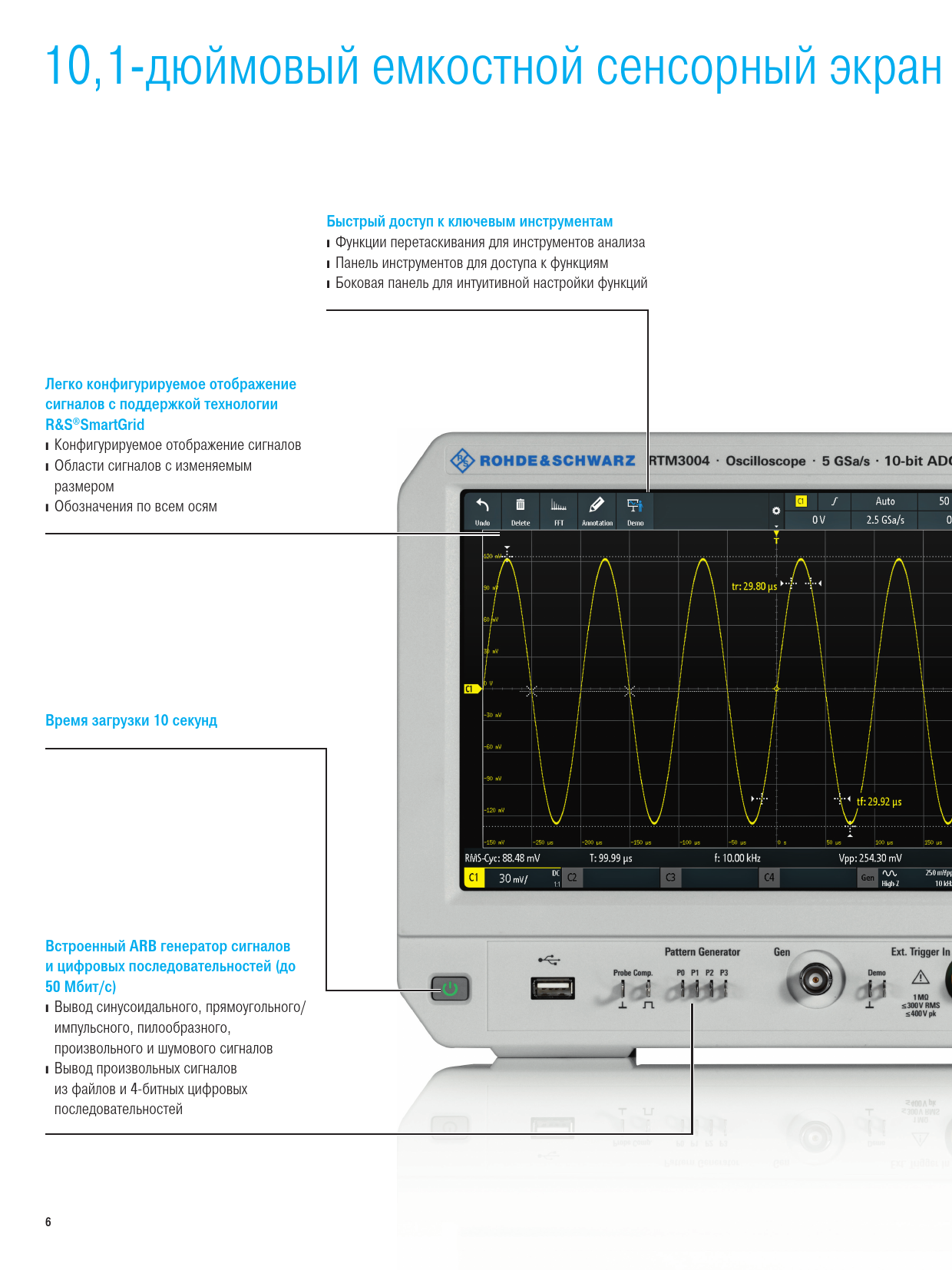 10,1-дюймовый емкостной сенсорный экран высокого разрешения с поддержкой жестов Быстрый доступ к ключевым инструментам ❙ Функции перетаскивания для инструментов анализа ❙ Панель инструментов для доступа к функциям ❙ Боковая панель для интуитивной настройки функций Легко конфигурируемое отображение сигналов с поддержкой технологии R&S®SmartGrid ❙Конфигурируемое отображение сигналов ❙Области сигналов с изменяемым размером ❙Обозначения по всем осям Время загрузки 10 секунд Встроенный ARB генератор сигналов и цифровых последовательностей ( до 50 Мбит/с ) ❙Вывод синусоидального, прямоугольного/ импульсного, пилообразного, произвольного и шумового сигналов ❙Вывод произвольных сигналов из файлов и 4-битных цифровых последовательностей 6 RTM3000_bro_ru_5214-9144-18_v0403.indd 6 15.03.2018 15:22:51