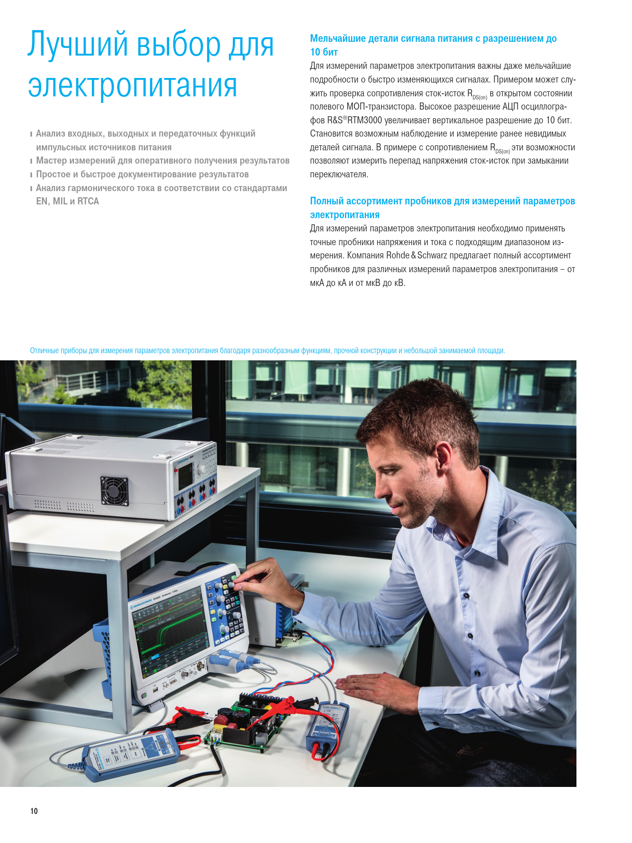 Лучший выбор для Мельчайшие детали сигнала питания с разрешением до 10 бит электропитания Для измерений параметров электропитания важны даже мельчайшие подробности о быстро изменяющихся сигналах. Примером может слу- жить проверка сопротивления сток-исток R в открытом состоянии DS(on) полевого МОП-транзистора. Высокое разрешение АЦП осциллогра- фов R&S®RTM3000 увеличивает вертикальное разрешение до 10 бит. ❙Анализ входных, выходных и передаточных функций Становится возможным наблюдение и измерение ранее невидимых импульсных источников питания деталей сигнала. В примере с сопротивлением R эти возможности DS(on) ❙Мастер измерений для оперативного получения результатов позволяют измерить перепад напряжения сток-исток при замыкании ❙Простое и быстрое документирование результатов переключателя. ❙Анализ гармонического тока в соответствии со стандартами EN, MIL и RTCA Полный ассортимент пробников для измерений параметров электропитания Для измерений параметров электропитания необходимо применять точные пробники напряжения и тока с подходящим диапазоном из- мерения. Компания Rohde & Schwarz предлагает полный ассортимент пробников для различных измерений параметров электропитания – от мкА до кА и от мкВ до кВ. Отличные приборы для измерения параметров электропитания благодаря разнообразным функциям, прочной конструкции и небольшой занимаемой площади. 10 RTM3000_bro_ru_5214-9144-18_v0403.indd 10 15.03.2018 15:22:58