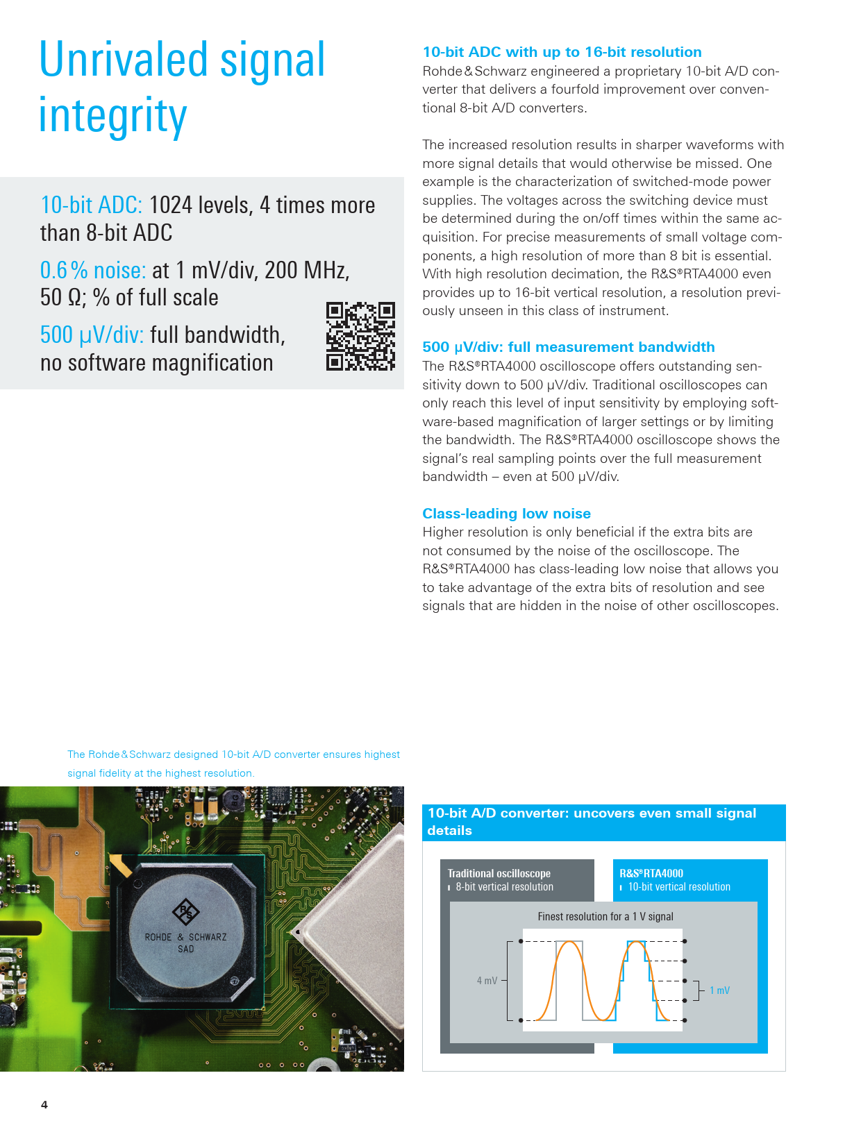 10-bit ADC with up to 16-bit resolution Unrivaled signal Rohde & Schwarz engineered a proprietary 10-bit A/D con- verter that delivers a fourfold improvement over conven- tional 8-bit A/D converters. integrity The increased resolution results in sharper waveforms with more signal details that would otherwise be missed. One example is the characterization of switched-mode power supplies. The voltages across the switching device must 10-bit ADC: 1024 levels, 4 times more be determined during the on/off times within the same ac- than 8-bit ADC quisition. For precise measurements of small voltage com- ponents, a high resolution of more than 8 bit is essential. 0.6 % noise: at 1 mV/div, 200 MHz, With high resolution decimation, the R&S®RTA4000 even provides up to 16-bit vertical resolution, a resolution previ- 50 Ω; % of full scale ously unseen in this class of instrument. 500 µV/div: full bandwidth, 500 µV/div: full measurement bandwidth no software magnification The R&S®RTA4000 oscilloscope offers outstanding sen- sitivity down to 500 µV/div. Traditional oscilloscopes can only reach this level of input sensitivity by employing soft- ware-based magnification of larger settings or by limiting the bandwidth. The R&S®RTA4000 oscilloscope shows the signal’s real sampling points over the full measurement bandwidth – even at 500 µV/div. Class-leading low noise Higher resolution is only beneficial if the extra bits are not consumed by the noise of the oscilloscope. The R&S®RTA4000 has class-leading low noise that allows you to take advantage of the extra bits of resolution and see signals that are hidden in the noise of other oscilloscopes. The Rohde & Schwarz designed 10-bit A/D converter ensures highest signal fidelity at the highest resolution. 10-bit A/D converter: uncovers even small signal detailsTraditional oscilloscope¸RTA4000 ❙ 8-bit vertical resolution ❙ 10-bit vertical resolution Finest resolution for a 1 V signal 4 mV 1 mV 4 RTA4000_bro_en_5215-1776-12_v0303.indd 4 01.03.2018 11:02:00