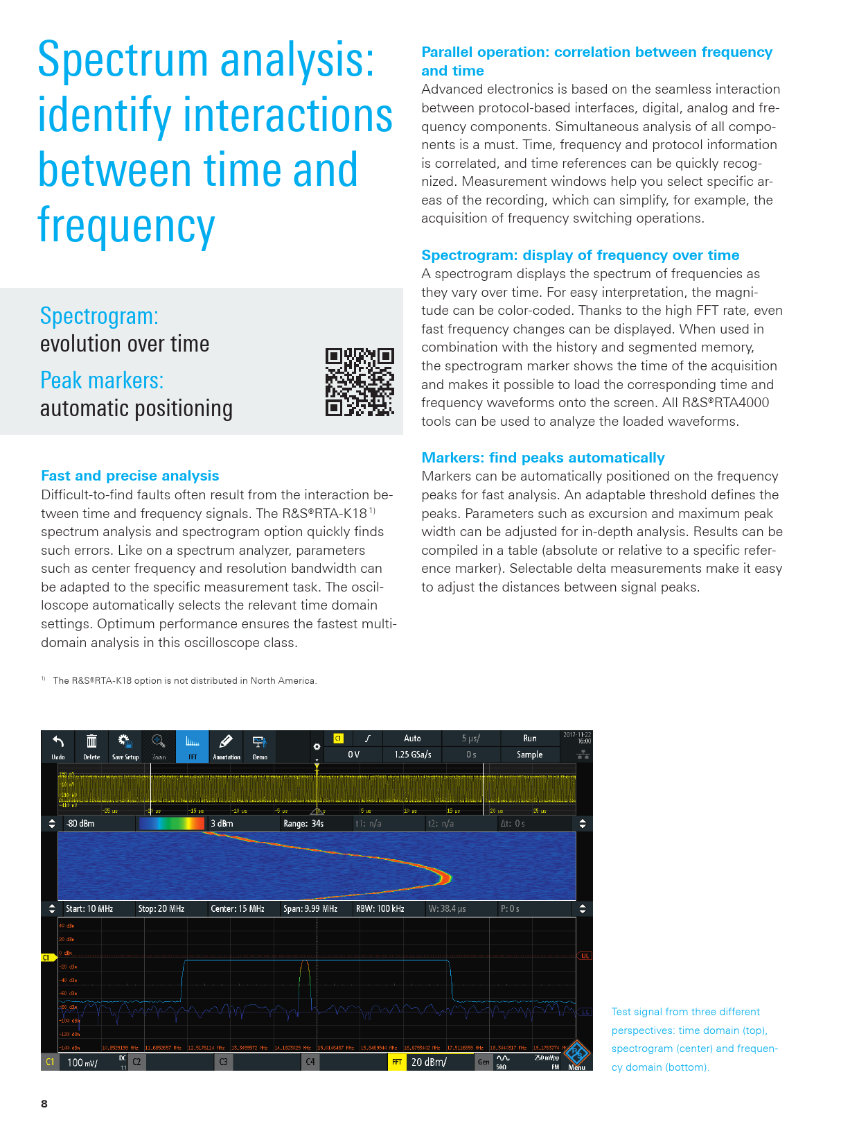Spectrum analysis: Parallel operation: correlation between frequencyand time identify interactions Advanced electronics is based on the seamless interaction between protocol-based interfaces, digital, analog and fre- quency components. Simultaneous analysis of all compo- between time and nents is a must. Time, frequency and protocol information is correlated, and time references can be quickly recog- nized. Measurement windows help you select specific ar- frequency eas of the recording, which can simplify, for example, the acquisition of frequency switching operations. Spectrogram: display of frequency over time A spectrogram displays the spectrum of frequencies as they vary over time. For easy interpretation, the magni- tude can be color-coded. Thanks to the high FFT rate, even Spectrogram: fast frequency changes can be displayed. When used in evolution over time combination with the history and segmented memory, the spectrogram marker shows the time of the acquisition Peak markers: and makes it possible to load the corresponding time and frequency waveforms onto the screen. All R&S®RTA4000 automatic positioning tools can be used to analyze the loaded waveforms. Markers: find peaks automaticallyFast and precise analysis Markers can be automatically positioned on the frequency Difficult-to-find faults often result from the interaction be- peaks for fast analysis. An adaptable threshold defines the tween time and frequency signals. The R&S®RTA-K18 1) peaks. Parameters such as excursion and maximum peak spectrum analysis and spectrogram option quickly finds width can be adjusted for in-depth analysis. Results can be such errors. Like on a spectrum analyzer, parameters compiled in a table (absolute or relative to a specific refer- such as center frequency and resolution bandwidth can ence marker). Selectable delta measurements make it easy be adapted to the specific measurement task. The oscil- to adjust the distances between signal peaks. loscope automatically selects the relevant time domain settings. Optimum performance ensures the fastest multi- domain analysis in this oscilloscope class. 1) The R&S®RTA-K18 option is not distributed in North America. Test signal from three different perspectives: time domain (top), spectrogram (center) and frequen- cy domain (bottom). 8 RTA4000_bro_en_5215-1776-12_v0303.indd 8 01.03.2018 11:02:03
