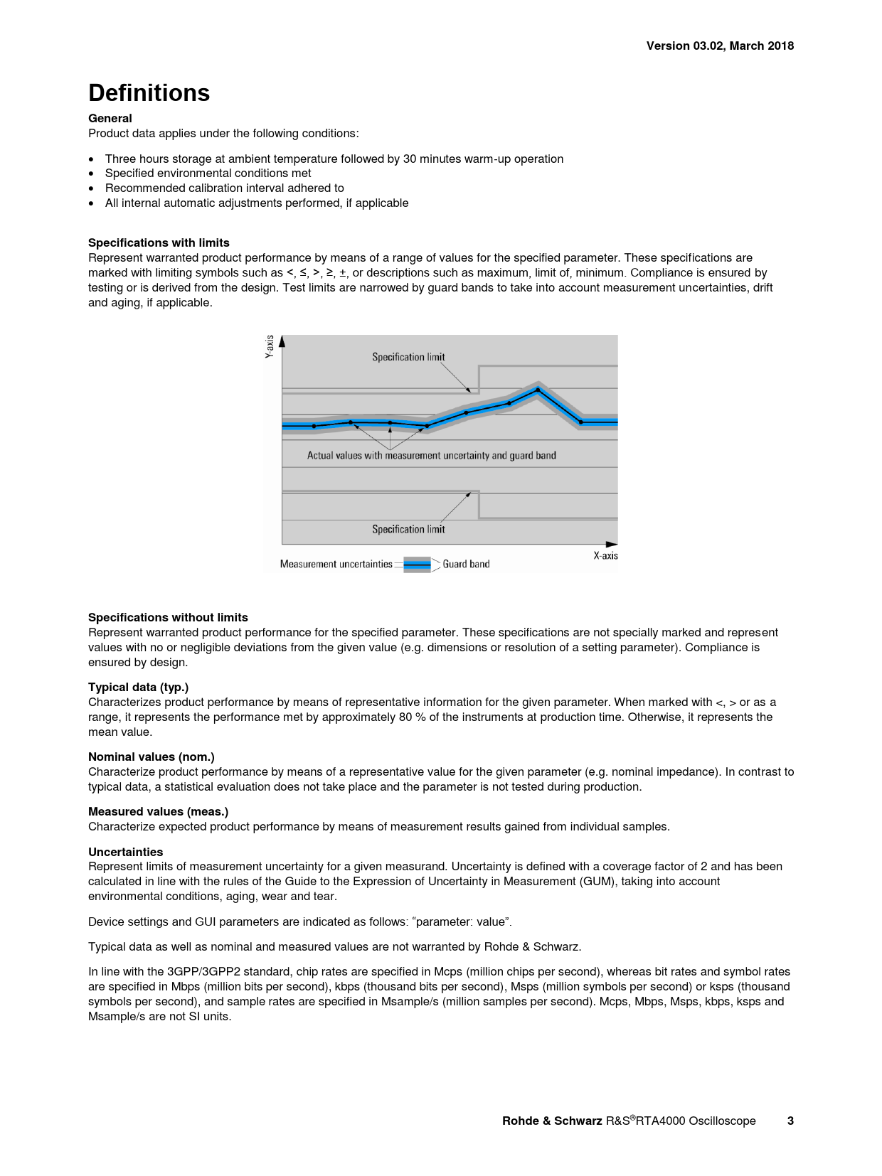 Version 03.02, March 2018Definitions General Product data applies under the following conditions: Three hours storage at ambient temperature followed by 30 minutes warm-up operation Specified environmental conditions met Recommended calibration interval adhered to All internal automatic adjustments performed, if applicable Specifications with limits Represent warranted product performance by means of a range of values for the specified parameter. These specifications are marked with limiting symbols such as <, ≤, >, ≥, ±, or descriptions such as maximum, limit of, minimum. Compliance is ensured by testing or is derived from the design. Test limits are narrowed by guard bands to take into account measurement uncertainties, drift and aging, if applicable. Specifications without limits Represent warranted product performance for the specified parameter. These specifications are not specially marked and represent values with no or negligible deviations from the given value (e.g. dimensions or resolution of a setting parameter). Compliance is ensured by design. Typical data (typ.) Characterizes product performance by means of representative information for the given parameter. When marked with <, > or as a range, it represents the performance met by approximately 80 % of the instruments at production time. Otherwise, it represents the mean value. Nominal values (nom.) Characterize product performance by means of a representative value for the given parameter (e.g. nominal impedance). In contrast to typical data, a statistical evaluation does not take place and the parameter is not tested during production. Measured values (meas.) Characterize expected product performance by means of measurement results gained from individual samples. Uncertainties Represent limits of measurement uncertainty for a given measurand. Uncertainty is defined with a coverage factor of 2 and has been calculated in line with the rules of the Guide to the Expression of Uncertainty in Measurement (GUM), taking into account environmental conditions, aging, wear and tear. Device settings and GUI parameters are indicated as follows: “parameter: value”. Typical data as well as nominal and measured values are not warranted by Rohde & Schwarz. In line with the 3GPP/3GPP2 standard, chip rates are specified in Mcps (million chips per second), whereas bit rates and symbol rates are specified in Mbps (million bits per second), kbps (thousand bits per second), Msps (million symbols per second) or ksps (thousand symbols per second), and sample rates are specified in Msample/s (million samples per second). Mcps, Mbps, Msps, kbps, ksps and Msample/s are not SI units. Rohde & Schwarz R&S®RTA4000 Oscilloscope 3