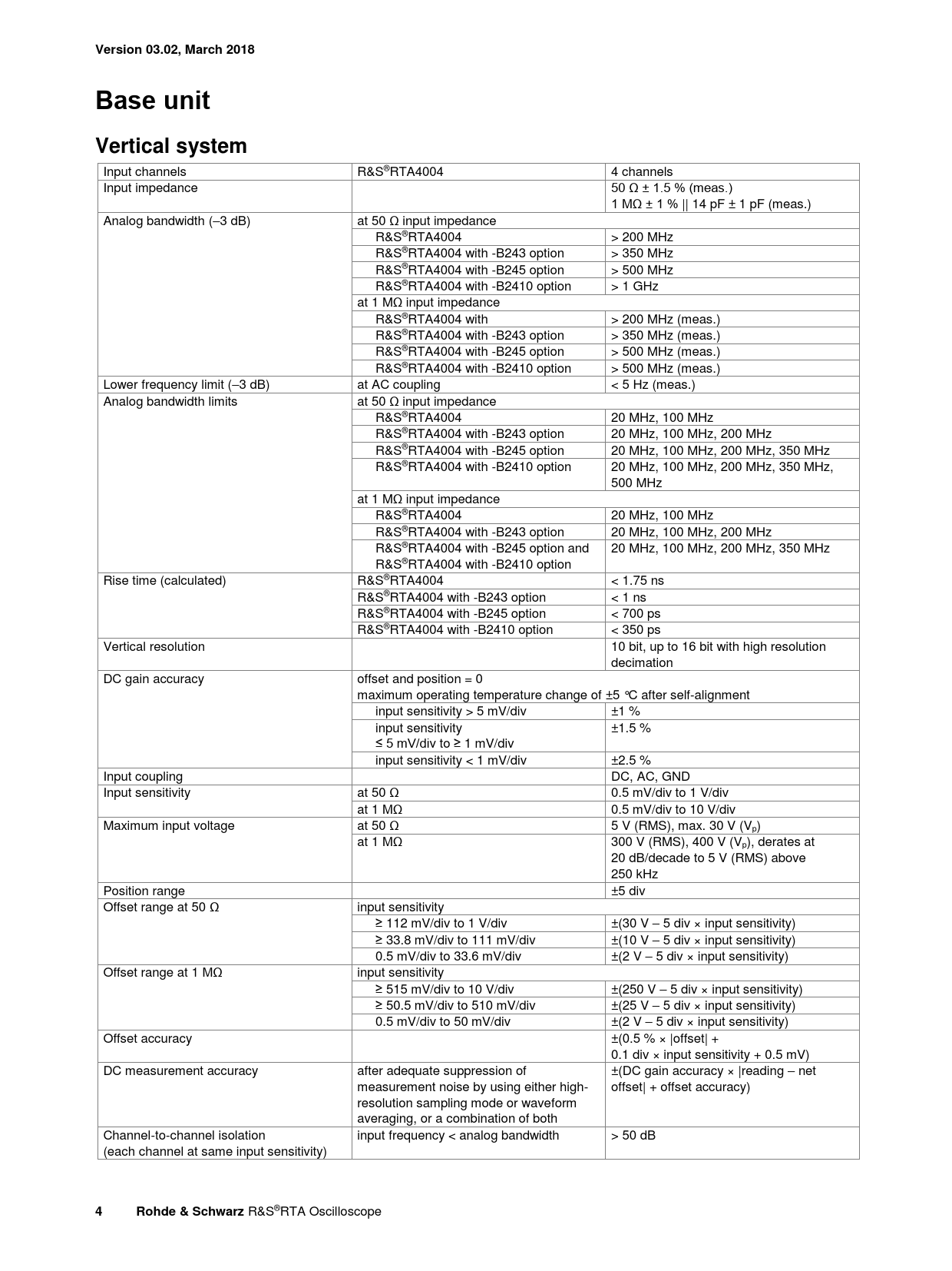 Version 03.02, March 2018Base unitVertical system Input channels R&S®RTA4004 4 channels Input impedance 50 Ω ± 1.5 % (meas.) 1 MΩ ± 1 % || 14 pF ± 1 pF (meas.) Analog bandwidth (–3 dB) at 50 Ω input impedance R&S®RTA4004 > 200 MHz R&S®RTA4004 with -B243 option > 350 MHz R&S®RTA4004 with -B245 option > 500 MHz R&S®RTA4004 with -B2410 option > 1 GHz at 1 MΩ input impedance R&S®RTA4004 with > 200 MHz (meas.) R&S®RTA4004 with -B243 option > 350 MHz (meas.) R&S®RTA4004 with -B245 option > 500 MHz (meas.) R&S®RTA4004 with -B2410 option > 500 MHz (meas.) Lower frequency limit (–3 dB) at AC coupling < 5 Hz (meas.) Analog bandwidth limits at 50 Ω input impedance R&S®RTA4004 20 MHz, 100 MHz R&S®RTA4004 with -B243 option 20 MHz, 100 MHz, 200 MHz R&S®RTA4004 with -B245 option 20 MHz, 100 MHz, 200 MHz, 350 MHz R&S®RTA4004 with -B2410 option 20 MHz, 100 MHz, 200 MHz, 350 MHz, 500 MHz at 1 MΩ input impedance R&S®RTA4004 20 MHz, 100 MHz R&S®RTA4004 with -B243 option 20 MHz, 100 MHz, 200 MHz R&S®RTA4004 with -B245 option and 20 MHz, 100 MHz, 200 MHz, 350 MHz R&S®RTA4004 with -B2410 option Rise time (calculated) R&S®RTA4004 < 1.75 ns R&S®RTA4004 with -B243 option < 1 ns R&S®RTA4004 with -B245 option < 700 ps R&S®RTA4004 with -B2410 option < 350 ps Vertical resolution 10 bit, up to 16 bit with high resolution decimation DC gain accuracy offset and position = 0 maximum operating temperature change of ±5 °C after self-alignment input sensitivity > 5 mV/div ±1 % input sensitivity ±1.5 % ≤ 5 mV/div to ≥ 1 mV/div input sensitivity < 1 mV/div ±2.5 % Input coupling DC, AC, GND Input sensitivity at 50 Ω 0.5 mV/div to 1 V/div at 1 MΩ 0.5 mV/div to 10 V/div Maximum input voltage at 50 Ω 5 V (RMS), max. 30 V (Vp) at 1 MΩ 300 V (RMS), 400 V (Vp), derates at 20 dB/decade to 5 V (RMS) above 250 kHz Position range ±5 div Offset range at 50 Ω input sensitivity ≥ 112 mV/div to 1 V/div ±(30 V – 5 div × input sensitivity) ≥ 33.8 mV/div to 111 mV/div ±(10 V – 5 div × input sensitivity) 0.5 mV/div to 33.6 mV/div ±(2 V – 5 div × input sensitivity) Offset range at 1 MΩ input sensitivity ≥ 515 mV/div to 10 V/div ±(250 V – 5 div × input sensitivity) ≥ 50.5 mV/div to 510 mV/div ±(25 V – 5 div × input sensitivity) 0.5 mV/div to 50 mV/div ±(2 V – 5 div × input sensitivity) Offset accuracy ±(0.5 % × |offset| + 0.1 div × input sensitivity + 0.5 mV) DC measurement accuracy after adequate suppression of ±(DC gain accuracy × |reading – net measurement noise by using either high- offset| + offset accuracy) resolution sampling mode or waveform averaging, or a combination of both Channel-to-channel isolation input frequency < analog bandwidth > 50 dB (each channel at same input sensitivity) 4Rohde & Schwarz R&S®RTA Oscilloscope