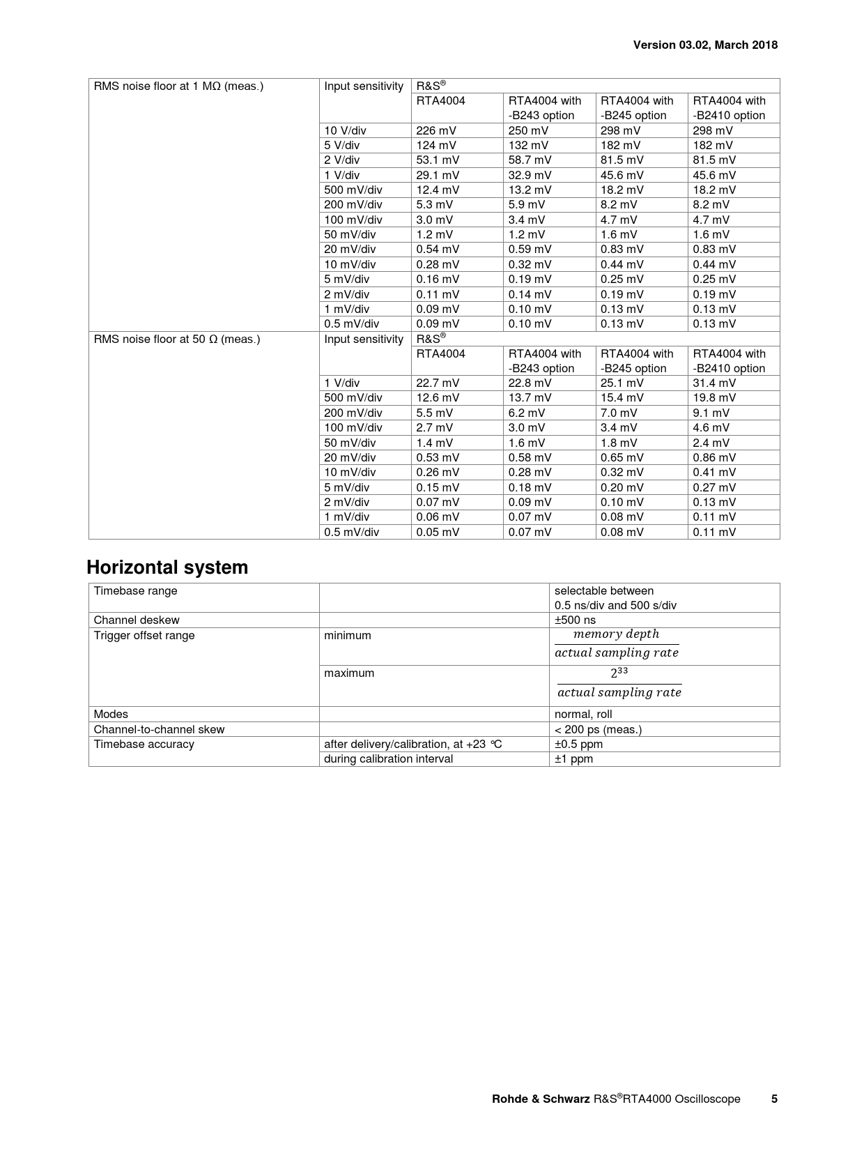 RMS noise floor at 1 MΩ (meas.) Input sensitivity R&S® RTA4004 RTA4004 with RTA4004 with RTA4004 with -B243 option -B245 option -B2410 option 10 V/div 226 mV 250 mV 298 mV 298 mV 5 V/div 124 mV 132 mV 182 mV 182 mV 2 V/div 53.1 mV 58.7 mV 81.5 mV 81.5 mV 1 V/div 29.1 mV 32.9 mV 45.6 mV 45.6 mV 500 mV/div 12.4 mV 13.2 mV 18.2 mV 18.2 mV 200 mV/div 5.3 mV 5.9 mV 8.2 mV 8.2 mV 100 mV/div 3.0 mV 3.4 mV 4.7 mV 4.7 mV 50 mV/div 1.2 mV 1.2 mV 1.6 mV 1.6 mV 20 mV/div 0.54 mV 0.59 mV 0.83 mV 0.83 mV 10 mV/div 0.28 mV 0.32 mV 0.44 mV 0.44 mV 5 mV/div 0.16 mV 0.19 mV 0.25 mV 0.25 mV 2 mV/div 0.11 mV 0.14 mV 0.19 mV 0.19 mV 1 mV/div 0.09 mV 0.10 mV 0.13 mV 0.13 mV 0.5 mV/div 0.09 mV 0.10 mV 0.13 mV 0.13 mV RMS noise floor at 50 Ω (meas.) Input sensitivity R&S® RTA4004 RTA4004 with RTA4004 with RTA4004 with -B243 option -B245 option -B2410 option 1 V/div 22.7 mV 22.8 mV 25.1 mV 31.4 mV 500 mV/div 12.6 mV 13.7 mV 15.4 mV 19.8 mV 200 mV/div 5.5 mV 6.2 mV 7.0 mV 9.1 mV 100 mV/div 2.7 mV 3.0 mV 3.4 mV 4.6 mV 50 mV/div 1.4 mV 1.6 mV 1.8 mV 2.4 mV 20 mV/div 0.53 mV 0.58 mV 0.65 mV 0.86 mV 10 mV/div 0.26 mV 0.28 mV 0.32 mV 0.41 mV 5 mV/div 0.15 mV 0.18 mV 0.20 mV 0.27 mV 2 mV/div 0.07 mV 0.09 mV 0.10 mV 0.13 mV 1 mV/div 0.06 mV 0.07 mV 0.08 mV 0.11 mV 0.5 mV/div 0.05 mV 0.07 mV 0.08 mV 0.11 mV