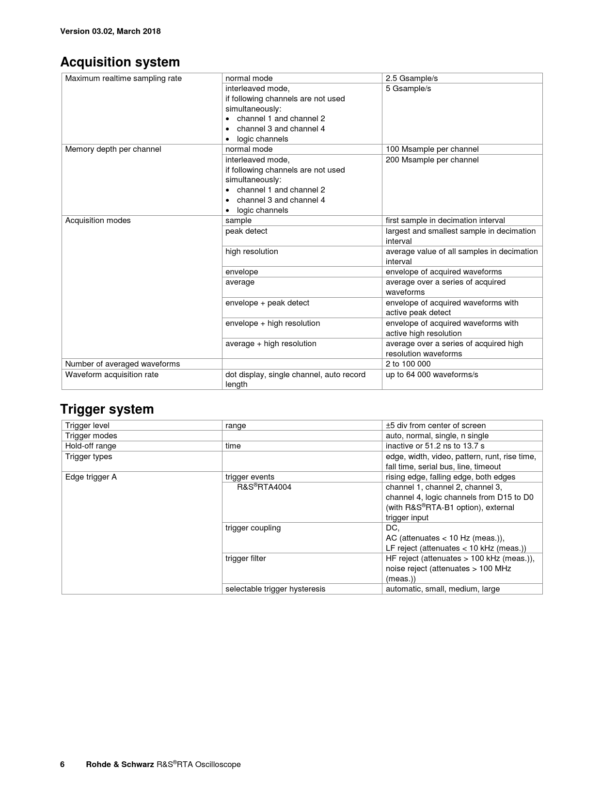 Version 03.02, March 2018Acquisition system Maximum realtime sampling rate normal mode 2.5 Gsample/s interleaved mode, 5 Gsample/s if following channels are not used simultaneously: channel 1 and channel 2 channel 3 and channel 4 logic channels Memory depth per channel normal mode 100 Msample per channel interleaved mode, 200 Msample per channel if following channels are not used simultaneously: channel 1 and channel 2 channel 3 and channel 4 logic channels Acquisition modes sample first sample in decimation interval peak detect largest and smallest sample in decimation interval high resolution average value of all samples in decimation interval envelope envelope of acquired waveforms average average over a series of acquired waveforms envelope + peak detect envelope of acquired waveforms with active peak detect envelope + high resolution envelope of acquired waveforms with active high resolution average + high resolution average over a series of acquired high resolution waveforms Number of averaged waveforms 2 to 100 000 Waveform acquisition rate dot display, single channel, auto record up to 64 000 waveforms/s length Trigger system Trigger level range ±5 div from center of screen Trigger modes auto, normal, single, n single Hold-off range time inactive or 51.2 ns to 13.7 s Trigger types edge, width, video, pattern, runt, rise time, fall time, serial bus, line, timeout Edge trigger A trigger events rising edge, falling edge, both edges R&S®RTA4004 channel 1, channel 2, channel 3, channel 4, logic channels from D15 to D0 (with R&S®RTA-B1 option), external trigger input trigger coupling DC, AC (attenuates < 10 Hz (meas.)), LF reject (attenuates < 10 kHz (meas.)) trigger filter HF reject (attenuates > 100 kHz (meas.)), noise reject (attenuates > 100 MHz (meas.)) selectable trigger hysteresis automatic, small, medium, large 6Rohde & Schwarz R&S®RTA Oscilloscope