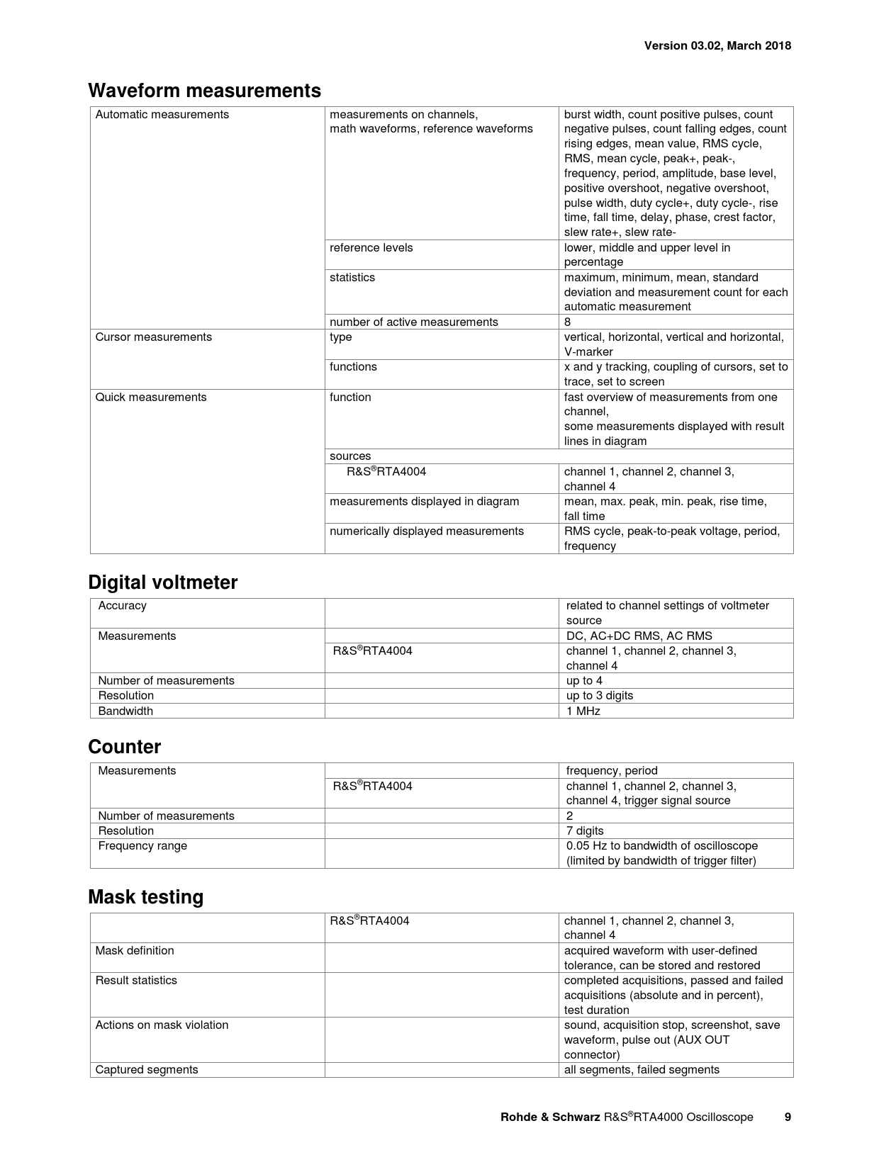 Version 03.02, March 2018Waveform measurements Automatic measurements measurements on channels, burst width, count positive pulses, count math waveforms, reference waveforms negative pulses, count falling edges, count rising edges, mean value, RMS cycle, RMS, mean cycle, peak+, peak-, frequency, period, amplitude, base level, positive overshoot, negative overshoot, pulse width, duty cycle+, duty cycle-, rise time, fall time, delay, phase, crest factor, slew rate+, slew rate- reference levels lower, middle and upper level in percentage statistics maximum, minimum, mean, standard deviation and measurement count for each automatic measurement number of active measurements 8 Cursor measurements type vertical, horizontal, vertical and horizontal, V-marker functions x and y tracking, coupling of cursors, set to trace, set to screen Quick measurements function fast overview of measurements from one channel, some measurements displayed with result lines in diagram sources R&S®RTA4004 channel 1, channel 2, channel 3, channel 4 measurements displayed in diagram mean, max. peak, min. peak, rise time, fall time numerically displayed measurements RMS cycle, peak-to-peak voltage, period, frequency Digital voltmeter Accuracy related to channel settings of voltmeter source Measurements DC, AC+DC RMS, AC RMS R&S®RTA4004 channel 1, channel 2, channel 3, channel 4 Number of measurements up to 4 Resolution up to 3 digits Bandwidth 1 MHz Counter Measurements frequency, period R&S®RTA4004 channel 1, channel 2, channel 3, channel 4, trigger signal source Number of measurements 2 Resolution 7 digits Frequency range 0.05 Hz to bandwidth of oscilloscope (limited by bandwidth of trigger filter) Mask testing R&S®RTA4004 channel 1, channel 2, channel 3, channel 4 Mask definition acquired waveform with user-defined tolerance, can be stored and restored Result statistics completed acquisitions, passed and failed acquisitions (absolute and in percent), test duration Actions on mask violation sound, acquisition stop, screenshot, save waveform, pulse out (AUX OUT connector) Captured segments all segments, failed segments Rohde & Schwarz R&S®RTA4000 Oscilloscope 9