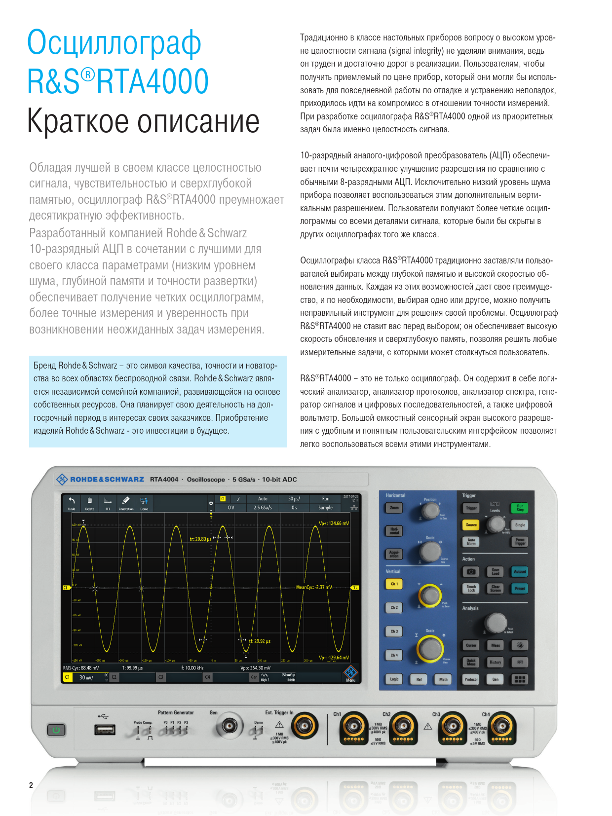 Осциллограф Традиционно в классе настольных приборов вопросу о высоком уров- не целостности сигнала (signal integrity) не уделяли внимания, ведь R&S®RTA4000 он труден и достаточно дорог в реализации. Пользователям, чтобы получить приемлемый по цене прибор, который они могли бы исполь- зовать для повседневной работы по отладке и устранению неполадок, Краткое описание приходилось идти на компромисс в отношении точности измерений. При разработке осциллографа R&S®RTA4000 одной из приоритетных задач была именно целостность сигнала. 10-разрядный аналого-цифровой преобразователь (АЦП) обеспечи- Обладая лучшей в своем классе целостностью вает почти четырехкратное улучшение разрешения по сравнению с сигнала, чувствительностью и сверхглубокой обычными 8-разрядными АЦП. Исключительно низкий уровень шума памятью, осциллограф R&S®RTA4000 преумножает прибора позволяет воспользоваться этим дополнительным верти- десятикратную эффективность. кальным разрешением. Пользователи получают более четкие осцил- лограммы со всеми деталями сигнала, которые были бы скрыты в Разработанный компанией Rohde & Schwarz других осциллографах того же класса. 10-разрядный АЦП в сочетании с лучшими для своего класса параметрами (низким уровнем Осциллографы класса R&S®RTA4000 традиционно заставляли пользо- шума, глубиной памяти и точности развертки) вателей выбирать между глубокой памятью и высокой скоростью об- новления данных. Каждая из этих возможностей дает свое преимуще- обеспечивает получение четких осциллограмм, ство, и по необходимости, выбирая одно или другое, можно получить более точные измерения и уверенность при неправильный инструмент для решения своей проблемы. Осциллограф возникновении неожиданных задач измерения. R&S®RTA4000 не ставит вас перед выбором; он обеспечивает высокую скорость обновления и сверхглубокую память, позволяя решить любые измерительные задачи, с которыми может столкнуться пользователь. Бренд Rohde & Schwarz – это символ качества, точности и новатор- ства во всех областях беспроводной связи. Rohde & Schwarz явля- R&S®RTA4000 – это не только осциллограф. Он содержит в себе логи- ется независимой семейной компанией, развивающейся на основе ческий анализатор, анализатор протоколов, анализатор спектра, гене- собственных ресурсов. Она планирует свою деятельность на дол- ратор сигналов и цифровых последовательностей, а также цифровой госрочный период в интересах своих заказчиков. Приобретение вольтметр. Большой емкостный сенсорный экран высокого разреше- изделий Rohde & Schwarz - это инвестиции в будущее. ния с удобным и понятным пользовательским интерфейсом позволяет легко воспользоваться всеми этими инструментами. 2 RTA4000_bro_ru_5215-1776-18_v0304.indd 2 15.03.2018 15:01:48