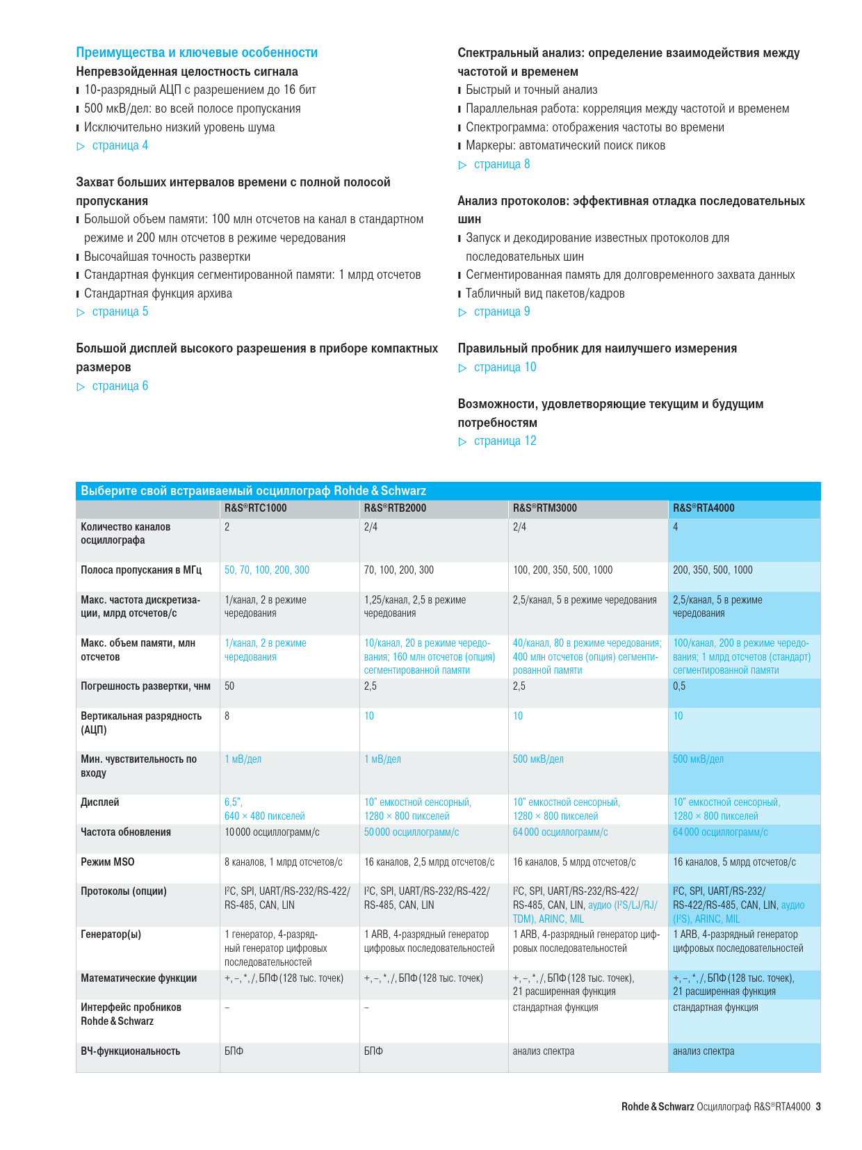 link to page 8 link to page 8 link to page 8 link to page 8 link to page 8 link to page 8 link to page 8 link to page 9 link to page 9 link to page 9 link to page 9 link to page 9 link to page 9 link to page 9 link to page 10 link to page 10 link to page 13 link to page 13 link to page 13 link to page 4 link to page 4 link to page 4 link to page 4 link to page 4 link to page 5 link to page 5 link to page 5 link to page 5 link to page 5 link to page 5 link to page 5 link to page 5 link to page 7 Преимущества и ключевые особенности Спектральный анализ: опреде ление взаимодей ствия между Непревзойденная целостность сигнала частотой и временем ❙ 10-разрядный АЦП с разрешением до 16 бит ❙Быстрый и точный анализ ❙ 500 мкВ/дел: во всей полосе пропускания ❙Параллельная работа: корреляция между частотой и временем ❙ Исключительно низкий уровень шума ❙Спектрограмма: отображения частоты во времени ▷ страница 4 ❙Маркеры: автоматический поиск пиков ▷ страница 8 Захват больших интервалов времени с полной полосой пропускания Анализ протоколов: эффективная отладка последовательных ❙ Большой объем памяти: 100 млн отсчетов на канал в стандартном шин режиме и 200 млн отсчетов в режиме чередования ❙Запуск и декодирование известных протоколов для ❙ Высочайшая точность развертки последовательных шин ❙ Стандартная функция сегментированной памяти: 1 млрд отсчетов ❙Сегментированная память для долговременного захвата данных ❙ Стандартная функция архива ❙Табличный вид пакетов/кадров ▷ страница 5 ▷ страница 9 Большой дисплей высокого разрешения в приборе компактных Правильный проб ник для наилучшего измерения размеров ▷ страница 10 ▷ страница 6 Возможности, удовлетворяющие текущим и будущим потребностям ▷ страница 12 Выберите свой встраиваемый осциллограф Rohde & Schwarz R&S®RTC1000 R&S®RTB2000 R&S®RTM3000 R&S®RTA4000 Количество каналов 2 2/4 2/4 4 осциллографа Полоса пропускания в МГц 50, 70, 100, 200, 300 70, 100, 200, 300 100, 200, 350, 500, 1000 200, 350, 500, 1000 Макс. частота дискретиза- 1/канал, 2 в режиме 1,25/канал, 2,5 в режиме 2,5/канал, 5 в режиме чередования 2,5/канал, 5 в режиме ции, млрд отсчетов/с чередования чередования чередования Макс. объем памяти, млн 1/канал, 2 в режиме 10/канал, 20 в режиме чередо- 40/канал, 80 в режиме чередования; 100/канал, 200 в режиме чередо- отсчетов чередования вания; 160 млн отсчетов (опция) 400 млн отсчетов (опция) сегменти- вания; 1 млрд отсчетов (стандарт) сегментированной памяти рованной памяти сегментированной памяти Погрешность развертки, чнм 50 2,5 2,5 0,5 Вертикальная разрядность 8 10 10 10 (АЦП) Мин. чувствительность по 1 мВ/дел 1 мВ/дел 500 мкВ/дел 500 мкВ/дел входу Дисплей 6,5", 10" емкостной сенсорный, 10" емкостной сенсорный, 10" емкостной сенсорный, 640 × 480 пикселей 1280 × 800 пикселей 1280 × 800 пикселей 1280 × 800 пикселей Частота обновления 10 000 осциллограмм/с 50 000 осциллограмм/с 64 000 осциллограмм/с 64 000 осциллограмм/с Режим MSO 8 каналов, 1 млрд отсчетов/с 16 каналов, 2,5 млрд отсчетов/с 16 каналов, 5 млрд отсчетов/с 16 каналов, 5 млрд отсчетов/с Протоколы (опции) I2C, SPI, UART/RS-232/RS-422/ I2C, SPI, UART/RS-232/RS-422/ I2C, SPI, UART/RS-232/RS-422/ I2C, SPI, UART/RS-232/ RS-485, CAN, LIN RS-485, CAN, LIN RS-485, CAN, LIN, аудио (I²S/LJ/RJ/ RS-422/RS-485, CAN, LIN, аудио TDM), ARINC, MIL (I²S), ARINC, MIL Генератор(ы) 1 генератор, 4-разряд- 1 ARB, 4-разрядный генератор 1 ARB, 4-разрядный генератор циф- 1 ARB, 4-разрядный генератор ный генератор цифровых цифровых последовательностей ровых последовательностей цифровых последовательностей последовательностей Математические функции +, –, *, /, БПФ (128 тыс. точек) +, –, *, /, БПФ (128 тыс. точек) +, –, *, /, БПФ (128 тыс. точек), +, –, *, /, БПФ (128 тыс. точек), 21 расширенная функция 21 расширенная функция Интерфейс пробников – – с