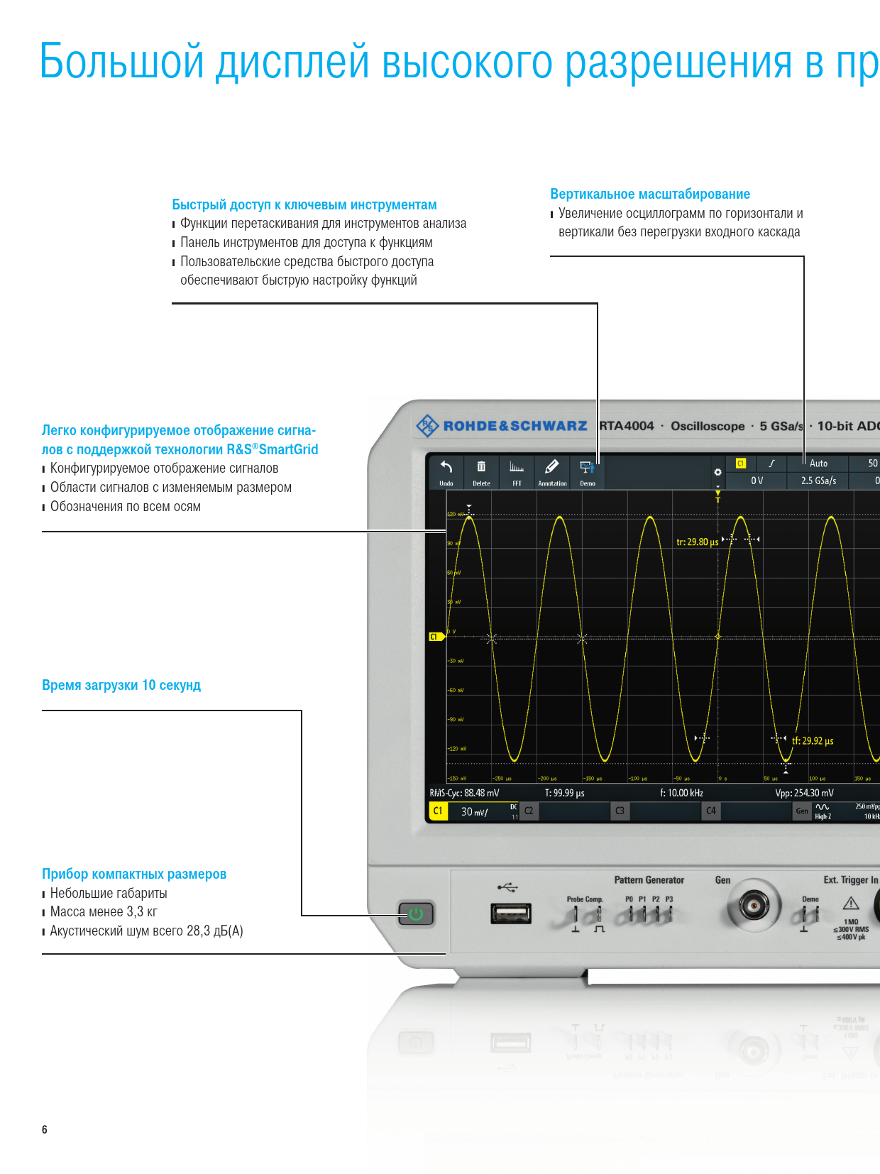 Большой дисплей высокого разрешения в приборе компактных размеров Вертикальное масштабирование Быстрый доступ к ключевым инструментам ❙Увеличение осциллограмм по горизонтали и ❙Функции перетаскивания для инструментов анализа вертикали без перегрузки входного каскада ❙Панель инструментов для доступа к функциям ❙Пользовательские средства быстрого доступа обеспечивают быструю настройку функций Легко конфигурируемое отображение сигна- лов с поддержкой технологии R&S®SmartGrid ❙Конфигурируемое отображение сигналов ❙Области сигналов с изменяемым размером ❙Обозначения по всем осям Время загрузки 10 секунд Прибор компактных размеров ❙Небольшие габариты ❙Масса менее 3,3 кг ❙Акустический шум всего 28,3 дБ(А) 6 RTA4000_bro_ru_5215-1776-18_v0304.indd 6 15.03.2018 15:01:53