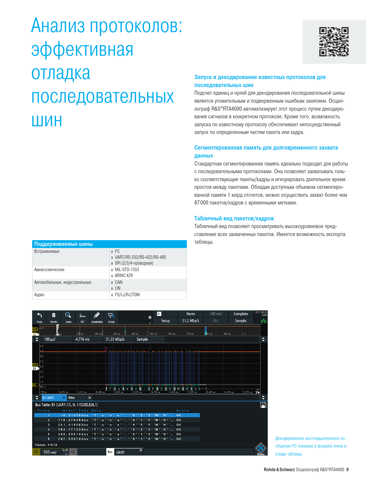 Анализ протоколов: эффективная отладка Запуск и декодирование известных протоколов для последовательных последовательных шин Подсчет единиц и нулей для декодирования последовательной шины является утомительным и подверженным ошибкам занятием. Осцил- шин лограф R&S®RTA4000 автоматизирует этот процесс путем декодиро- вания сигналов в конкретном протоколе. Кроме того, возможность запуска по известному протоколу обеспечивает непосредственный запуск по определенным частям пакета или кадра. Сегментированная память для долговременного захвата данных Стандартная сегментированная память идеально подходит для работы с последовательными протоколами. Она позволяет захватывать толь- ко соответствующие пакеты/кадры и игнорировать длительное время простоя между пакетами. Обладая доступным объемом сегментиро- ванной памяти 1 млрд отсчетов, можно осуществить захват более чем 87 000 пакетов/кадров с временными метками. Табличный вид пакетов/кадров Табличный вид позволяет просматривать высокоуровневое пред- ставление всех захваченных пакетов. Имеется возможность экспорта Поддерживаемые шины таблицы. Встраиваемые ❙ I2C ❙ UART/RS-232/RS-422/RS-485 ❙ SPI (2/3/4-проводная) Авиакосмические ❙ MIL-STD-1553 ❙ ARINC 429 Автомобильные, индустриальные ❙ CAN ❙ LIN Аудио ❙ I2S/LJ/RJ/TDM Декодированное шестнадцатеричное со- общение I²C показано в формате ячеек и в виде таблицы. Rohde & Schwarz Осциллограф R&S®RTA4000 9 RTA4000_bro_ru_5215-1776-18_v0304.indd 9 15.03.2018 15:01:54