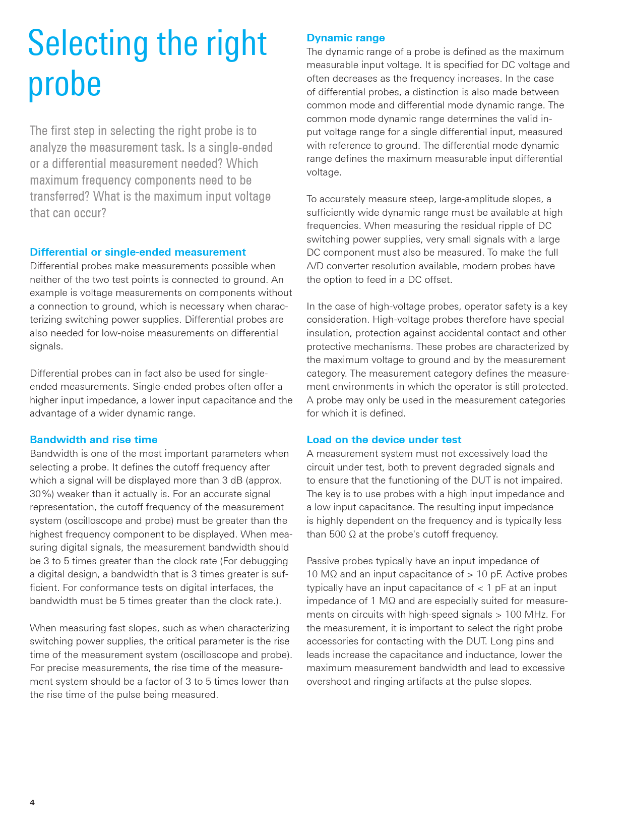 Dynamic range. Differential or single-ended measurement. Bandwidth and rise time. Load on the device under test