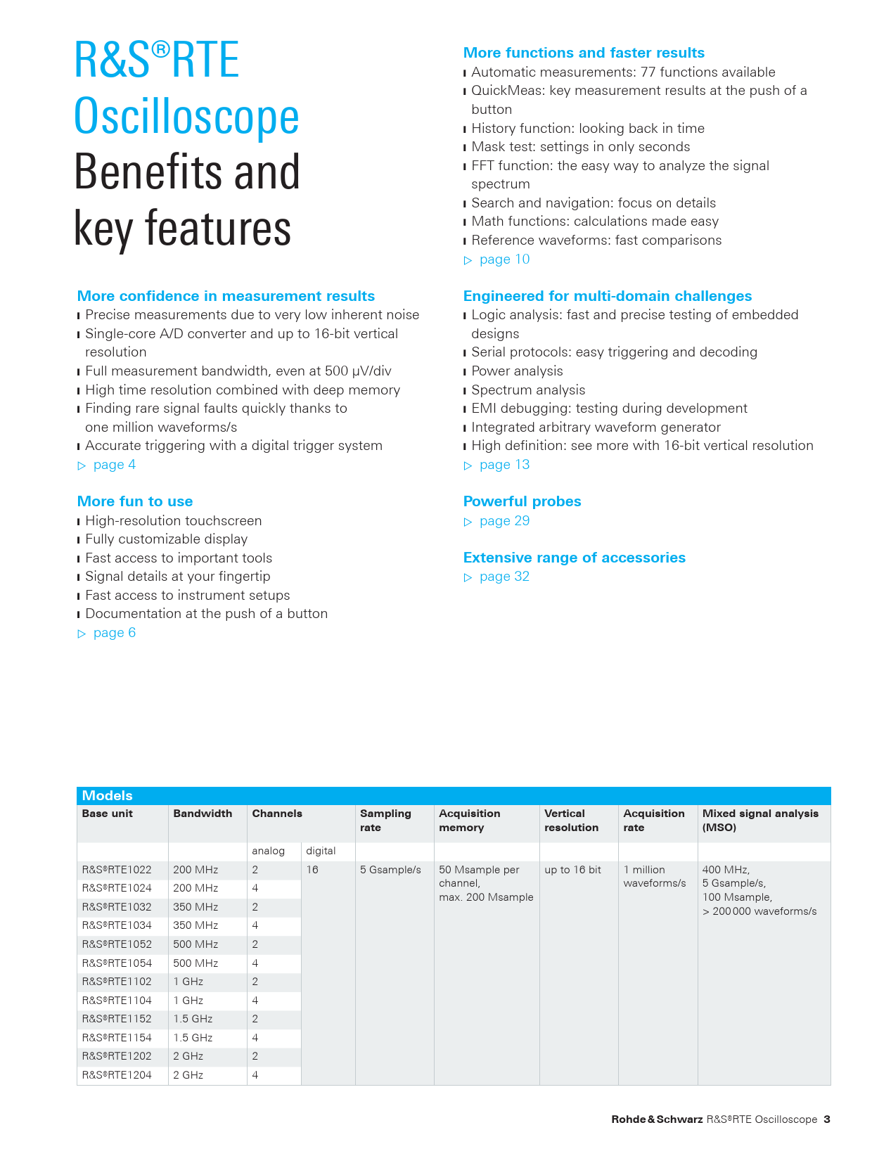 link to page 10 link to page 10 link to page 10 link to page 10 link to page 11 link to page 11 link to page 11 link to page 11 link to page 12 link to page 12 link to page 12 link to page 10 link to page 13 link to page 14 link to page 14 link to page 16 link to page 18 link to page 20 link to page 22 link to page 24 link to page 26 link to page 13 link to page 29 link to page 29 link to page 32 link to page 32 link to page 4 link to page 4 link to page 4 link to page 4 link to page 4 link to page 5 link to page 5 link to page 5 link to page 5 link to page 4 link to page 6 link to page 6 link to page 6 link to page 7 link to page 7 link to page 7 link to page 6 R&S®RTE More functions and faster results ❙Automatic measurements: 77 functions available Oscilloscope ❙QuickMeas: key measurement results at the push of a button ❙History function: looking back in time Benefits and ❙Mask test: settings in only seconds ❙FFT function: the easy way to analyze the signal spectrum key features ❙Search and navigation: focus on details ❙Math functions: calculations made easy ❙Reference waveforms: fast comparisons ▷ page 10 More confidence in measurement resultsEngineered for multi-domain challenges ❙Precise measurements due to very low inherent noise ❙Logic analysis: fast and precise testing of embedded ❙Single-core A/D converter and up to 16-bit vertical designs resolution ❙Serial protocols: easy triggering and decoding ❙Full measurement bandwidth, even at 500 µV/div ❙Power analysis ❙High time resolution combined with deep memory ❙Spectrum analysis ❙Finding rare signal faults quickly thanks to ❙EMI debugging: testing during development one million waveforms/s ❙Integrated arbitrary waveform generator ❙Accurate triggering with a digital trigger system ❙High definition: see more with 16-bit vertical resolution ▷ page 4 ▷ page 13 More fun to usePowerful probes ❙High-resolution touchscreen ▷ page 29 ❙Fully customizable display ❙Fast access to important tools Extensive range of accessories ❙Signal details at your fingertip ▷ page 32 ❙Fast access to instrument setups ❙Documentation at the push of a button ▷ page 6 Models Base unitBandwidthChannelsSamplingAcquisitionVerticalAcquisitionMixed signal analysisratememoryresolutionrate(MSO) analog digital R&S®RTE1022 200 MHz 2 16 5 Gsample/s 50 Msample per up to 16 bit 1 million 400 MHz, channel, waveforms/s 5 Gsample/s, R&S®RTE1024 200 MHz 4 max. 200 Msample 100 Msample, R&S®RTE1032 350 MHz 2 > 200 000 waveforms/s R&S®RTE1034 350 MHz 4 R&S®RTE1052 500 MHz 2 R&S®RTE1054 500 MHz 4 R&S®RTE1102 1 GHz 2 R&S®RTE1104 1 GHz 4 R&S®RTE1152 1.5 GHz 2 R&S®RTE1154 1.5 GHz 4 R&S®RTE1202 2 GHz 2 R&S®RTE1204 2 GHz 4 Rohde & Schwarz R&S®RTE Oscilloscope 3 RTE_bro_en_3606-9033-12_v1400.indd 3 11.06.2018 14:09:33