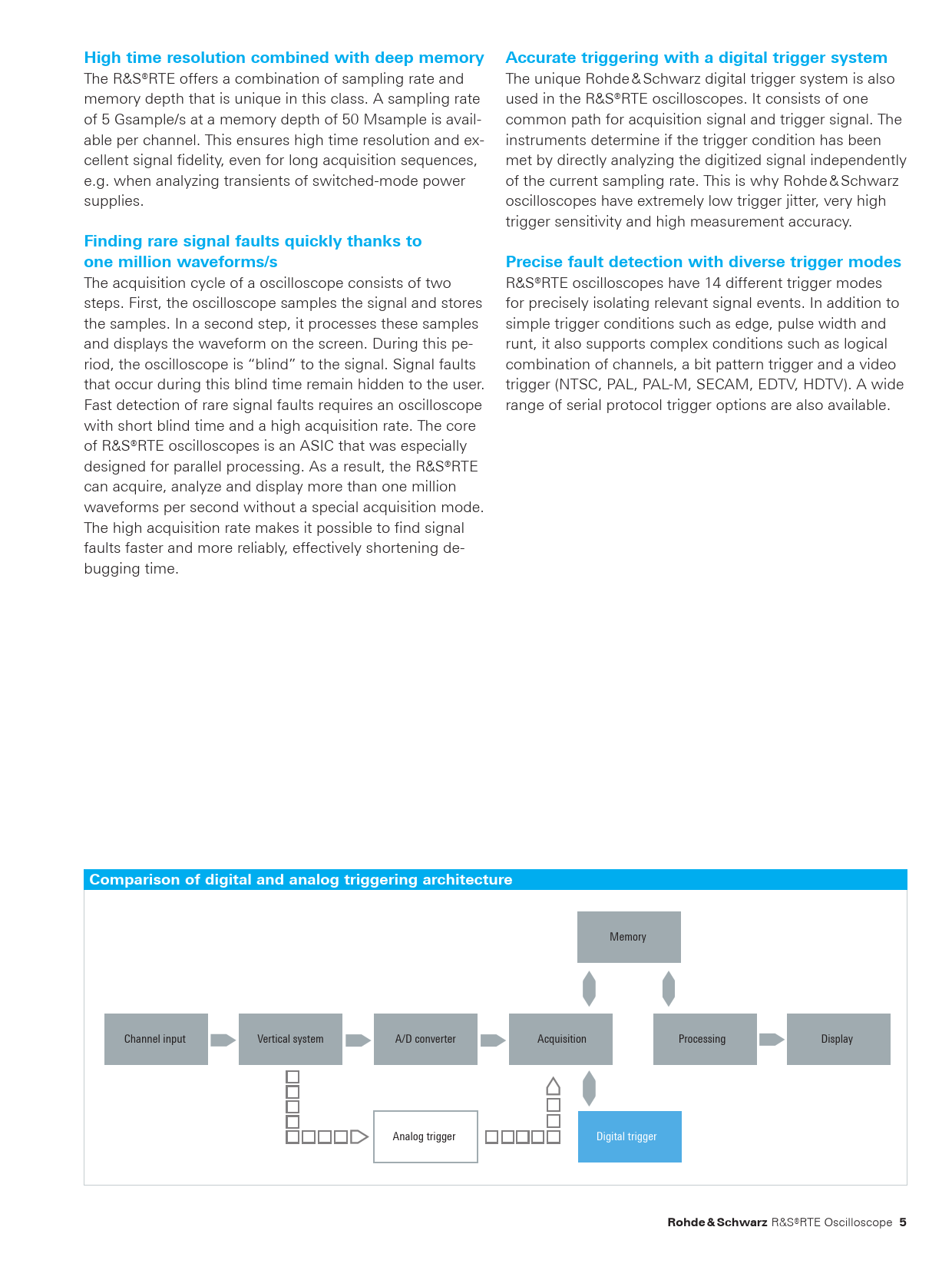 High time resolution combined with deep memoryAccurate triggering with a digital trigger system The R&S®RTE offers a combination of sampling rate and The unique Rohde & Schwarz digital trigger system is also memory depth that is unique in this class. A sampling rate used in the R&S®RTE oscilloscopes. It consists of one of 5 Gsample/s at a memory depth of 50 Msample is avail- common path for acquisition signal and trigger signal. The able per channel. This ensures high time resolution and ex- instruments determine if the trigger condition has been cellent signal fidelity, even for long acquisition sequences, met by directly analyzing the digitized signal independently e.g. when analyzing transients of switched-mode power of the current sampling rate. This is why Rohde & Schwarz supplies. oscilloscopes have extremely low trigger jitter, very high trigger sensitivity and high measurement accuracy. Finding rare signal faults quickly thanks to one million waveforms/sPrecise fault detection with diverse trigger modes The acquisition cycle of a oscilloscope consists of two R&S®RTE oscilloscopes have 14 different trigger modes steps. First, the oscilloscope samples the signal and stores for precisely isolating relevant signal events. In addition to the samples. In a second step, it processes these samples simple trigger conditions such as edge, pulse width and and displays the waveform on the screen. During this pe- runt, it also supports complex conditions such as logical riod, the oscilloscope is “blind” to the signal. Signal faults combination of channels, a bit pattern trigger and a video that occur during this blind time remain hidden to the user. trigger (NTSC, PAL, PAL-M, SECAM, EDTV, HDTV). A wide Fast detection of rare signal faults requires an oscilloscope range of serial protocol trigger options are also available. with short blind time and a high acquisition rate. The core of R&S®RTE oscilloscopes is an ASIC that was especially designed for parallel processing. As a result, the R&S®RTE can acquire, analyze and display more than one million waveforms per second without a special acquisition mode. The high acquisition rate makes it possible to find signal faults faster and more reliably, effectively shortening de- bugging time. Comparison of digital and analog triggering architecture Memory Channel input Vertical system A/D converter Acquisition Processing Display Analog trigger Digital trigger Rohde & Schwarz R&S®RTE Oscilloscope 5 RTE_bro_en_3606-9033-12_v1400.indd 5 11.06.2018 14:09:33