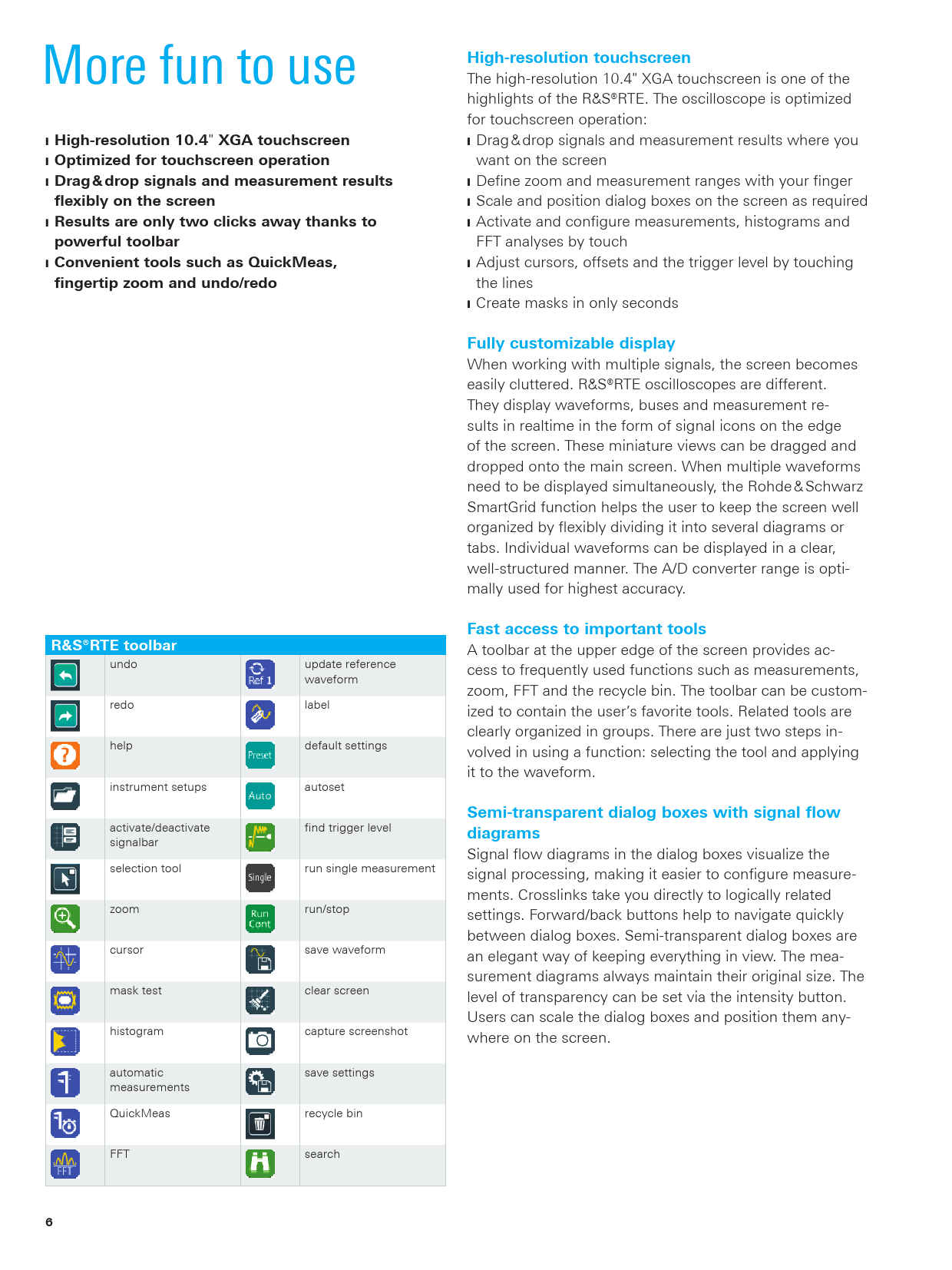 High-resolution touchscreen More fun to use The high-resolution 10.4" XGA touchscreen is one of the highlights of the R&S®RTE. The oscilloscope is optimized for touchscreen operation: ❙ High-resolution 10.4 " XGA touchscreen ❙Drag & drop signals and measurement results where you ❙ Optimized for touchscreen operation want on the screen ❙ Drag & drop signals and measurement results ❙Define zoom and measurement ranges with your finger flexibly on the screen ❙Scale and position dialog boxes on the screen as required ❙ Results are only two clicks away thanks to ❙Activate and configure measurements, histograms and powerful toolbar FFT analyses by touch ❙ Convenient tools such as QuickMeas, ❙Adjust cursors, offsets and the trigger level by touching fingertip zoom and undo/redo the lines ❙Create masks in only seconds Fully customizable display When working with multiple signals, the screen becomes easily cluttered. R&S®RTE oscilloscopes are different. They display waveforms, buses and measurement re- sults in realtime in the form of signal icons on the edge of the screen. These miniature views can be dragged and dropped onto the main screen. When multiple waveforms need to be displayed simultaneously, the Rohde & Schwarz SmartGrid function helps the user to keep the screen well organized by flexibly dividing it into several diagrams or tabs. Individual waveforms can be displayed in a clear, well-structured manner. The A/D converter range is opti- mally used for highest accuracy. Fast access to important toolsR&S®RTE toolbar A toolbar at the upper edge of the screen provides ac- undo update reference cess to frequently used functions such as measurements, waveform zoom, FFT and the recycle bin. The toolbar can be custom- redo label ized to contain the user’s favorite tools. Related tools are clearly organized in groups. There are just two steps in- help default settings volved in using a function: selecting the tool and applying it to the waveform. instrument setups autoset Semi-transparent dialog boxes with signal flow activate/deactivate find trigger level diagrams signalbar Signal flow diagrams in the dialog boxes visualize the selection tool run single measurement signal processing, making it easier to configure measure- ments. Crosslinks take you directly to logically related zoom run/stop settings. Forward/back buttons help to navigate quickly between dialog boxes. Semi-transparent dialog boxes are cursor save waveform an elegant way of keeping everything in view. The mea- surement diagrams always maintain their original size. The mask test clear screen level of transparency can be set via the intensity button. Users can scale the dialog boxes and position them any- histogram capture screenshot where on the screen. automatic save settings measurements QuickMeas recycle bin FFT search 6 RTE_bro_en_3606-9033-12_v1400.indd 6 11.06.2018 14:09:34
