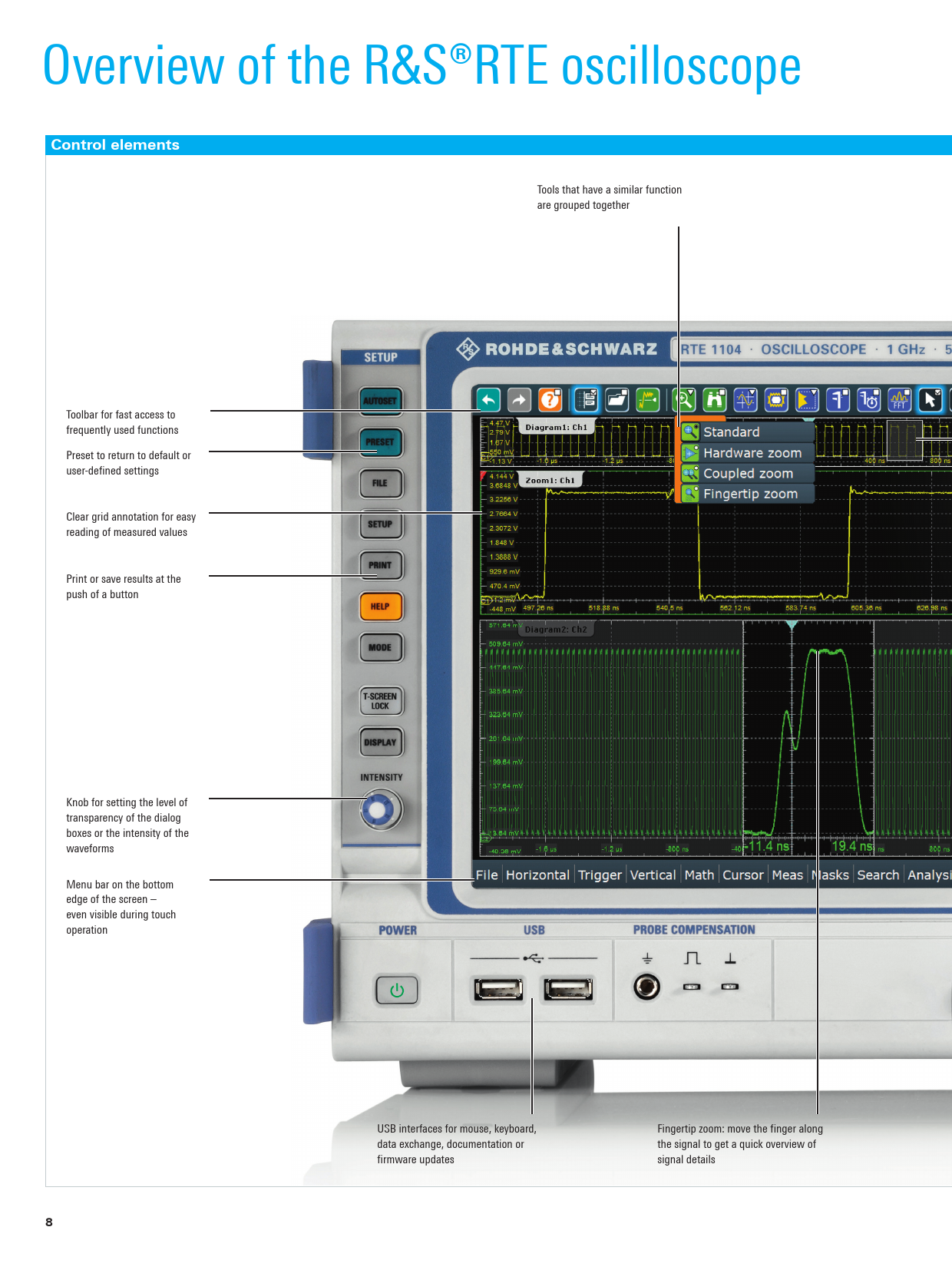 Overview of the R&S ® RTE oscilloscope Control elements Tools that have a similar function are grouped together Toolbar for fast access to frequently used functions Preset to return to default or user-defined settings Clear grid annotation for easy reading of measured values Print or save results at the push of a button Knob for setting the level of transparency of the dialog boxes or the intensity of the waveforms Menu bar on the bottom edge of the screen – even visible during touch operation USB interfaces for mouse, keyboard, Fingertip zoom: move the finger along data exchange, documentation or the signal to get a quick overview of firmware updates signal details 8 RTE_bro_en_3606-9033-12_v1400.indd 8 11.06.2018 14:09:36