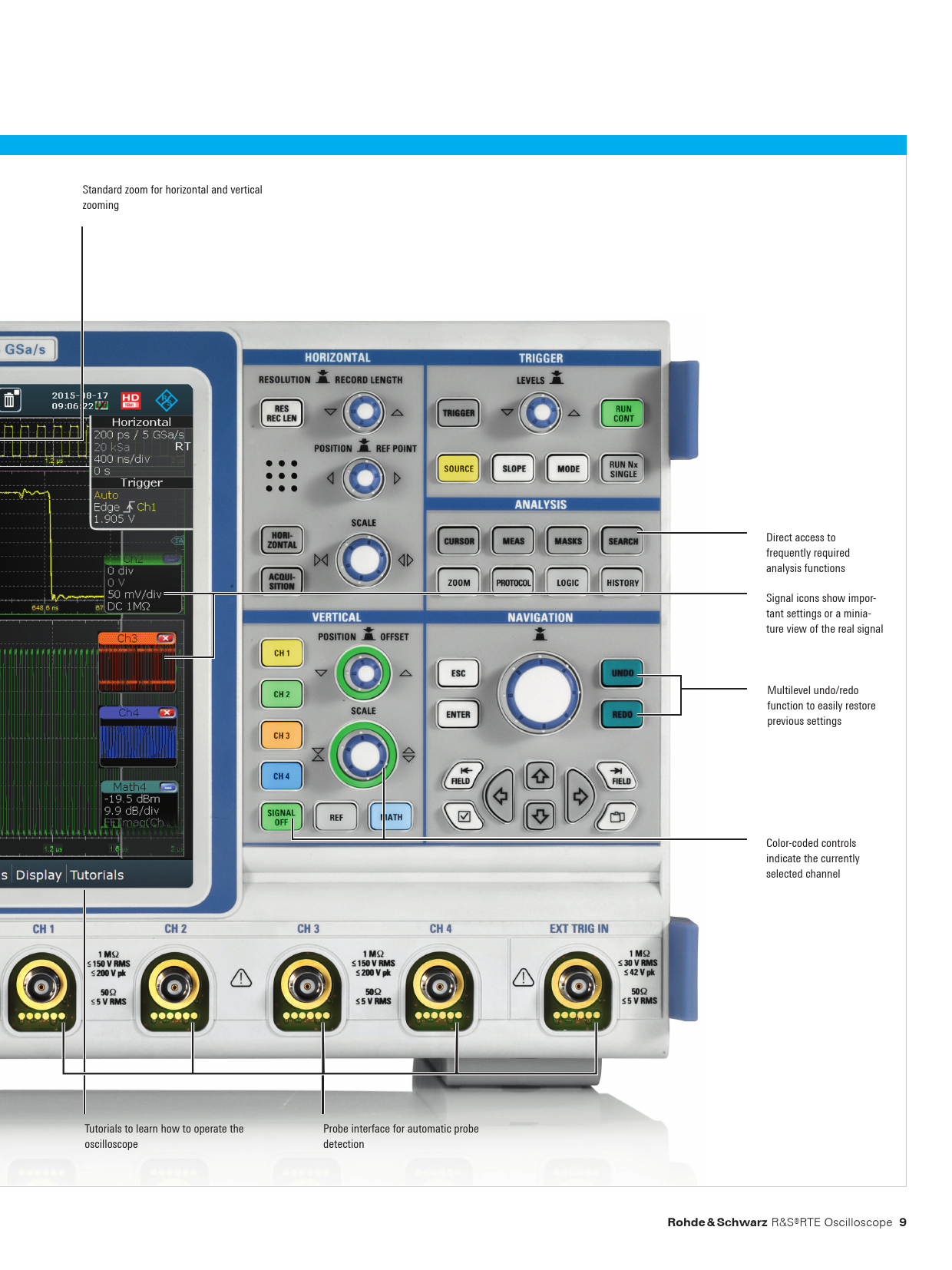 Control elements Standard zoom for horizontal and vertical zooming Direct access to frequently required analysis functions Signal icons show impor- tant settings or a minia- ture view of the real signal Multilevel undo/redo function to easily restore previous settings Color-coded controls indicate the currently selected channel Tutorials to learn how to operate the Probe interface for automatic probe oscilloscope detection Rohde & Schwarz R&S®RTE Oscilloscope 9 RTE_bro_en_3606-9033-12_v1400.indd 9 11.06.2018 14:09:38