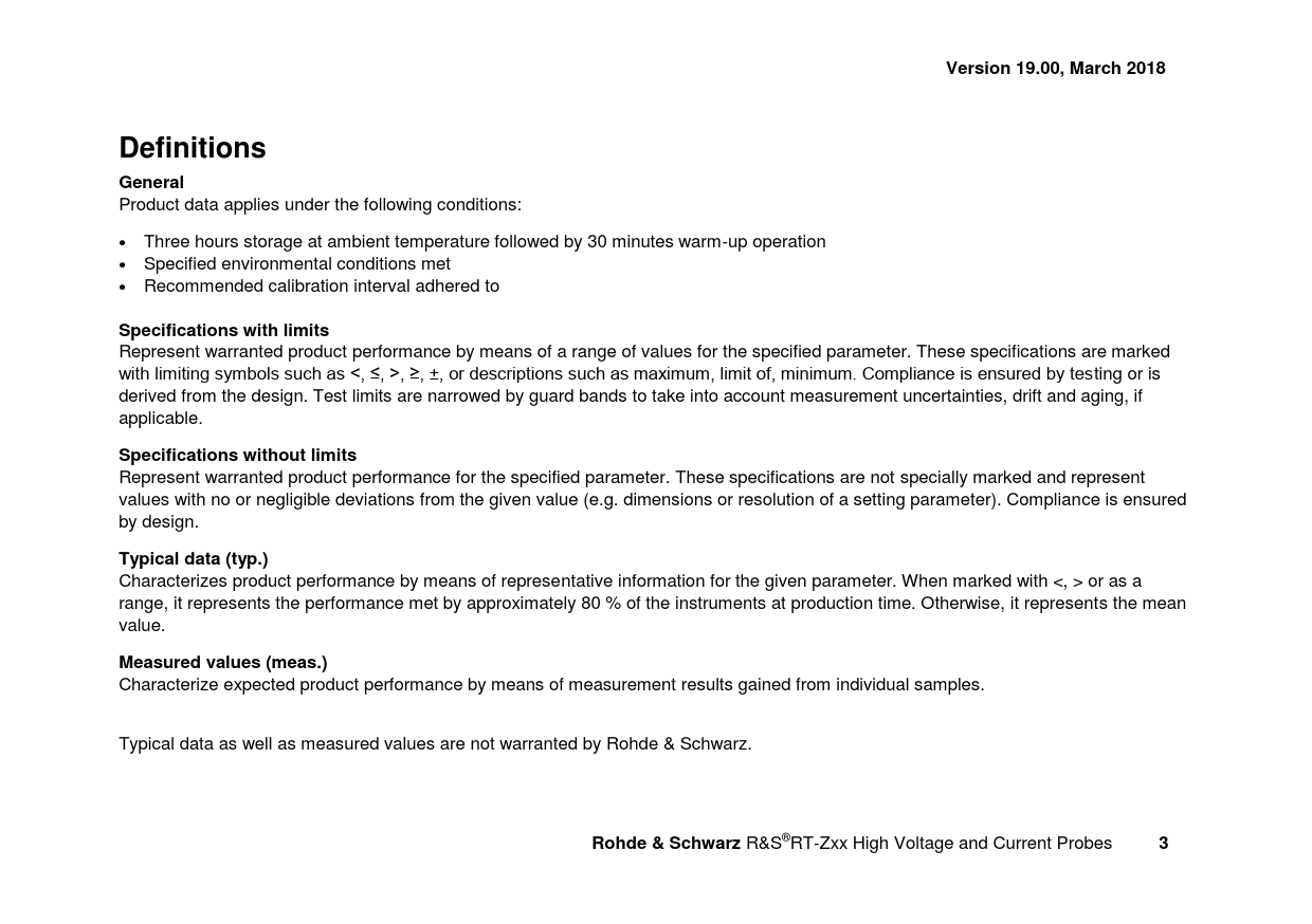 Version 19.00, March 2018Definitions General Product data applies under the following conditions: Three hours storage at ambient temperature followed by 30 minutes warm-up operation Specified environmental conditions met Recommended calibration interval adhered to Specifications with limits Represent warranted product performance by means of a range of values for the specified parameter. These specifications are marked with limiting symbols such as <, ≤, >, ≥, ±, or descriptions such as maximum, limit of, minimum. Compliance is ensured by testing or is derived from the design. Test limits are narrowed by guard bands to take into account measurement uncertainties, drift and aging, if applicable. Specifications without limits Represent warranted product performance for the specified parameter. These specifications are not specially marked and represent values with no or negligible deviations from the given value (e.g. dimensions or resolution of a setting parameter). Compliance is ensured by design. Typical data (typ.) Characterizes product performance by means of representative information for the given parameter. When marked with <, > or as a range, it represents the performance met by approximately 80 % of the instruments at production time. Otherwise, it represents the mean value. Measured values (meas.) Characterize expected product performance by means of measurement results gained from individual samples. Typical data as well as measured values are not warranted by Rohde & Schwarz. Rohde & Schwarz R&S®RT-Zxx High Voltage and Current Probes 3