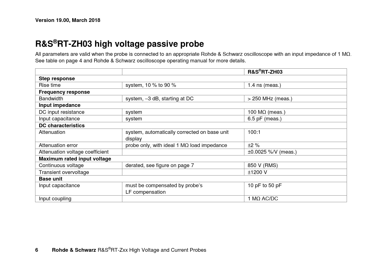 link to page 4 link to page 7 Version 19.00, March 2018R&S®RT-ZH03 high voltage passive probe All parameters are valid when the probe is connected to an appropriate Rohde & Schwarz oscilloscope with an input impedance of 1 MΩ. See table on page 4 and Rohde & Schwarz oscilloscope operating manual for more details. R&S®RT-ZH03Step response Rise time system, 10 % to 90 % 1.4 ns (meas.) Frequency response Bandwidth system, –3 dB, starting at DC > 250 MHz (meas.) Input impedance DC input resistance system 100 MΩ (meas.) Input capacitance system 6.5 pF (meas.) DC characteristics Attenuation system, automatically corrected on base unit 100:1 display Attenuation error probe only, with ideal 1 MΩ load impedance ±2 % Attenuation voltage coefficient ±0.0025 %/V (meas.) Maximum rated input voltage Continuous voltage derated, see figure on page 7 850 V (RMS) Transient overvoltage ±1200 V Base unit Input capacitance must be compensated by probe’s 10 pF to 50 pF LF compensation Input coupling 1 MΩ AC/DC 6Rohde & Schwarz R&S®RT-Zxx High Voltage and Current Probes