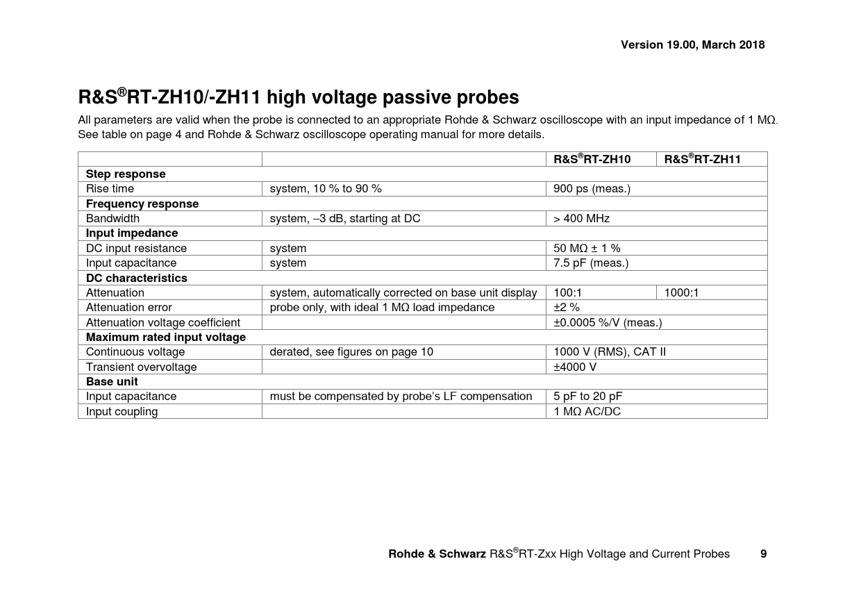 link to page 4 link to page 10 Version 19.00, March 2018R&S®RT-ZH10/-ZH11 high voltage passive probes All parameters are valid when the probe is connected to an appropriate Rohde & Schwarz oscilloscope with an input impedance of 1 MΩ. See table on page 4 and Rohde & Schwarz oscilloscope operating manual for more details. R&S®RT-ZH10R&S®RT-ZH11Step response Rise time system, 10 % to 90 % 900 ps (meas.) Frequency response Bandwidth system, –3 dB, starting at DC > 400 MHz Input impedance DC input resistance system 50 MΩ ± 1 % Input capacitance system 7.5 pF (meas.) DC characteristics Attenuation system, automatically corrected on base unit display 100:1 1000:1 Attenuation error probe only, with ideal 1 MΩ load impedance ±2 % Attenuation voltage coefficient ±0.0005 %/V (meas.) Maximum rated input voltage Continuous voltage derated, see figures on page 10 1000 V (RMS), CAT II Transient overvoltage ±4000 V Base unit Input capacitance must be compensated by probe’s LF compensation 5 pF to 20 pF Input coupling 1 MΩ AC/DC Rohde & Schwarz R&S®RT-Zxx High Voltage and Current Probes 9