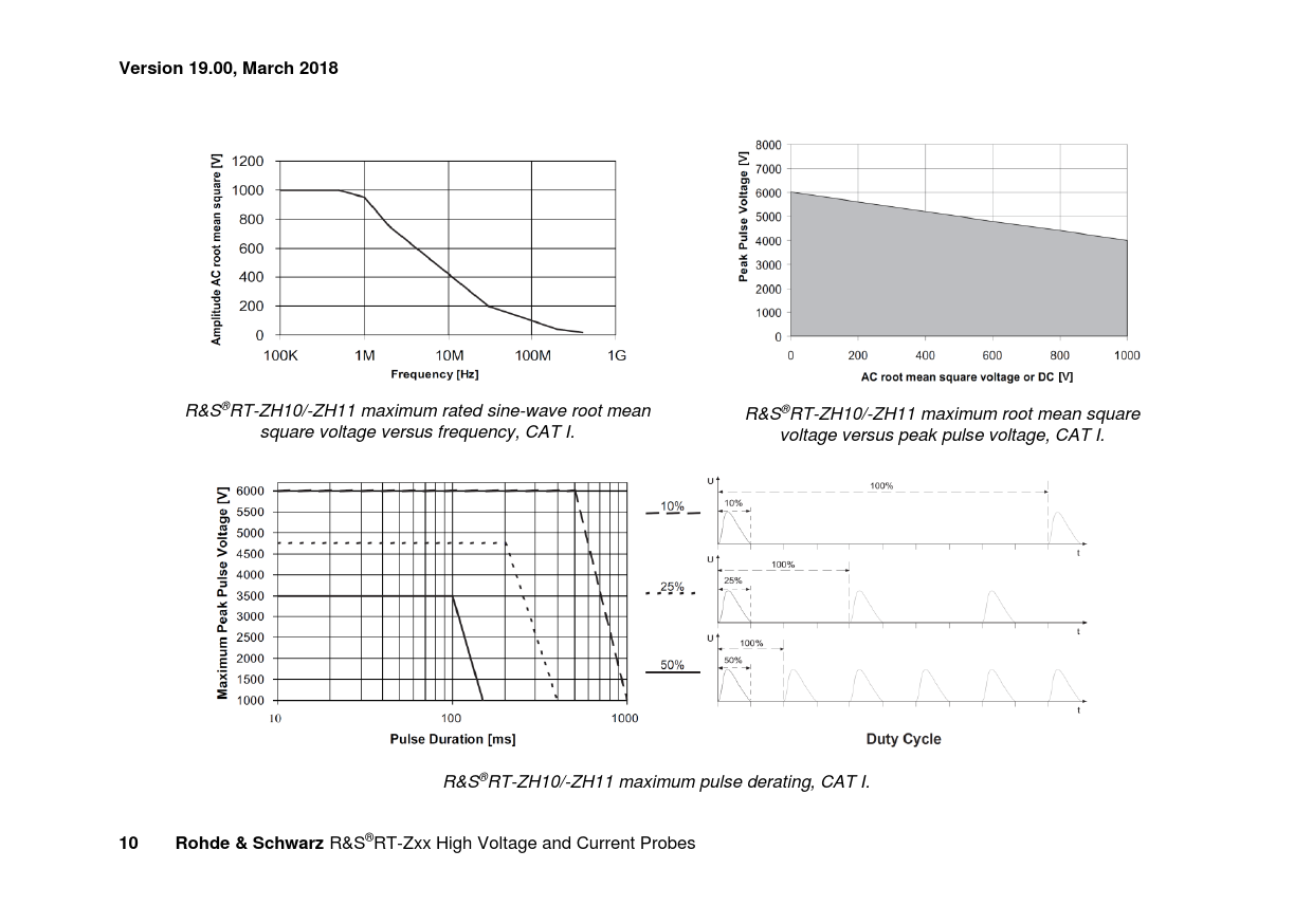 Version 19.00, March 2018 R&S®RT-ZH10/-ZH11 maximum rated sine-wave root mean R&S®RT-ZH10/-ZH11 maximum root mean square square voltage versus frequency, CAT I. voltage versus peak pulse voltage, CAT I. R&S®RT-ZH10/-ZH11 maximum pulse derating, CAT I. 10Rohde & Schwarz R&S®RT-Zxx High Voltage and Current Probes