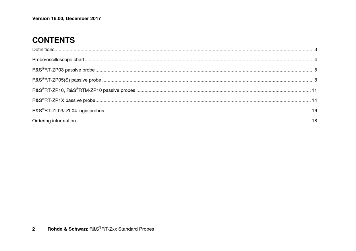link to page 3 link to page 4 link to page 5 link to page 8 link to page 11 link to page 14 link to page 16 link to page 18 Version 18.00, December 2017CONTENTS Definitions.. 3 Probe/oscilloscope chart .. 4 R&S®RT-ZP03 passive probe .. 5 R&S®RT-ZP05(S) passive probe ... 8 R&S®RT-ZP10, R&S®RTM-ZP10 passive probes .. 11 R&S®RT-ZP1X passive probe .. 14 R&S®RT-ZL03/-ZL04 logic probes ... 16 Ordering information .. 18 2Rohde & Schwarz R&S®RT-Zxx Standard Probes