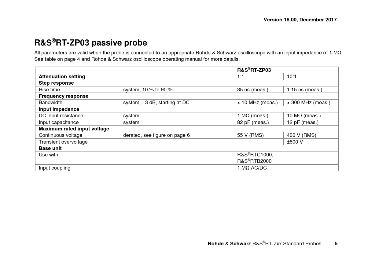 link to page 4 link to page 6 Version 18.00, December 2017R&S®RT-ZP03 passive probe All parameters are valid when the probe is connected to an appropriate Rohde & Schwarz oscilloscope with an input impedance of 1 MΩ. See table on page 4 and Rohde & Schwarz oscilloscope operating manual for more details. R&S®RT-ZP03Attenuation setting 1:1 10:1 Step response Rise time system, 10 % to 90 % 35 ns (meas.) 1.15 ns (meas.) Frequency response Bandwidth system, –3 dB, starting at DC > 10 MHz (meas.) > 300 MHz (meas.) Input impedance DC input resistance system 1 MΩ (meas.) 10 MΩ (meas.) Input capacitance system 82 pF (meas.) 12 pF (meas.) Maximum rated input voltage Continuous voltage derated, see figure on page 6 55 V (RMS) 400 V (RMS) Transient overvoltage ±600 V Base unit Use with R&S®RTC1000, R&S®RTB2000 Input coupling 1 MΩ AC/DC Rohde & Schwarz R&S®RT-Zxx Standard Probes 5