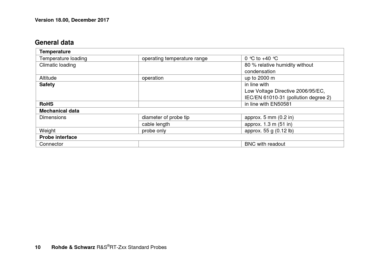 Version 18.00, December 2017General dataTemperature Temperature loading operating temperature range 0 °C to +40 °C Climatic loading 80 % relative humidity without condensation Altitude operation up to 2000 m Safety in line with Low Voltage Directive 2006/95/EC, IEC/EN 61010-31 (pollution degree 2) RoHS in line with EN50581 Mechanical data Dimensions diameter of probe tip approx. 5 mm (0.2 in) cable length approx. 1.3 m (51 in) Weight probe only approx. 55 g (0.12 lb) Probe interface Connector BNC with readout 10Rohde & Schwarz R&S®RT-Zxx Standard Probes