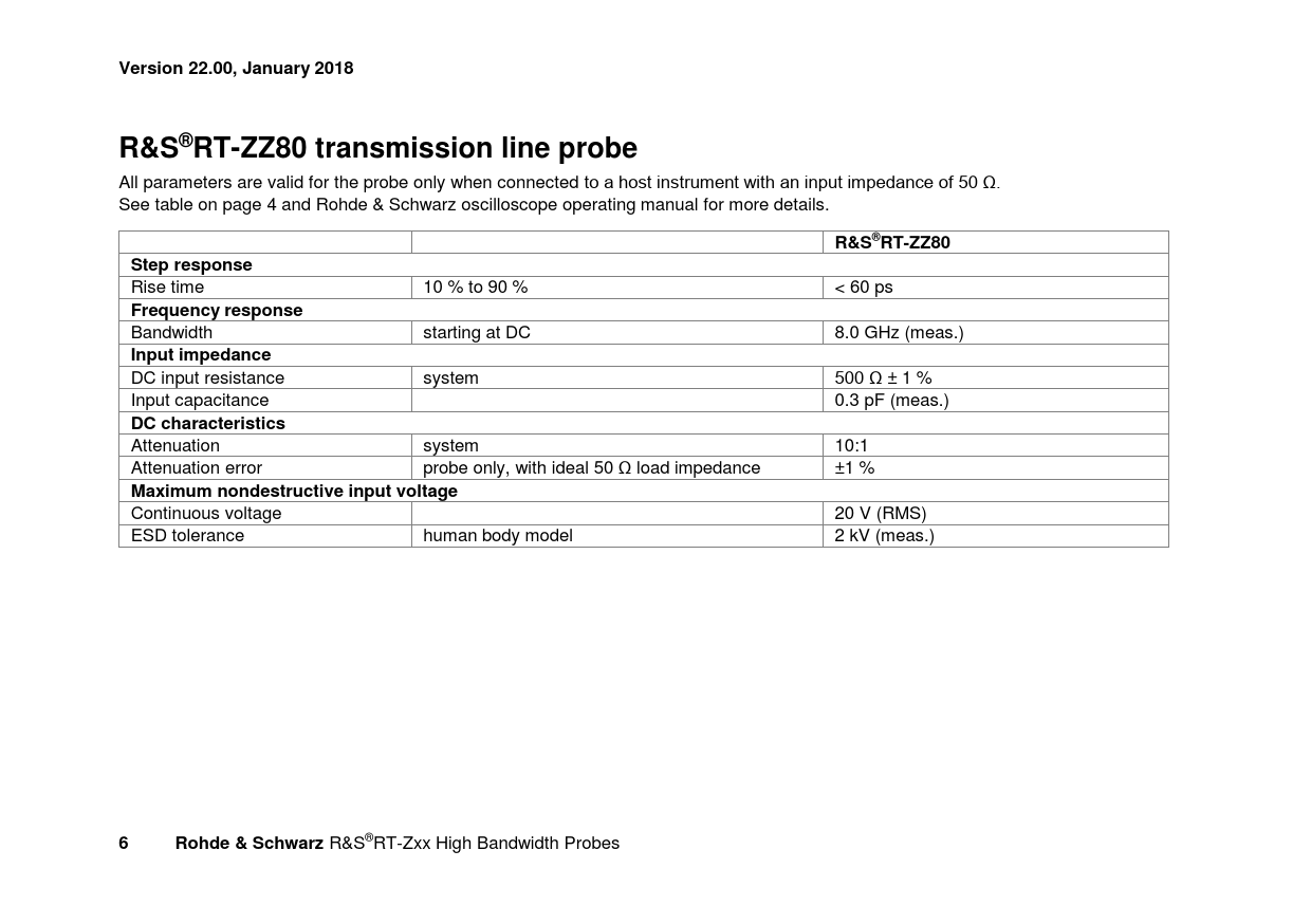 link to page 4 Version 22.00, January 2018R&S®RT-ZZ80 transmission line probe All parameters are valid for the probe only when connected to a host instrument with an input impedance of 50 Ω. See table on page 4 and Rohde & Schwarz oscilloscope operating manual for more details. R&S®RT-ZZ80Step response Rise time 10 % to 90 % < 60 ps Frequency response Bandwidth starting at DC 8.0 GHz (meas.) Input impedance DC input resistance system 500 Ω ± 1 % Input capacitance 0.3 pF (meas.) DC characteristics Attenuation system 10:1 Attenuation error probe only, with ideal 50 Ω load impedance ±1 % Maximum nondestructive input voltage Continuous voltage 20 V (RMS) ESD tolerance human body model 2 kV (meas.) 6Rohde & Schwarz R&S®RT-Zxx High Bandwidth Probes