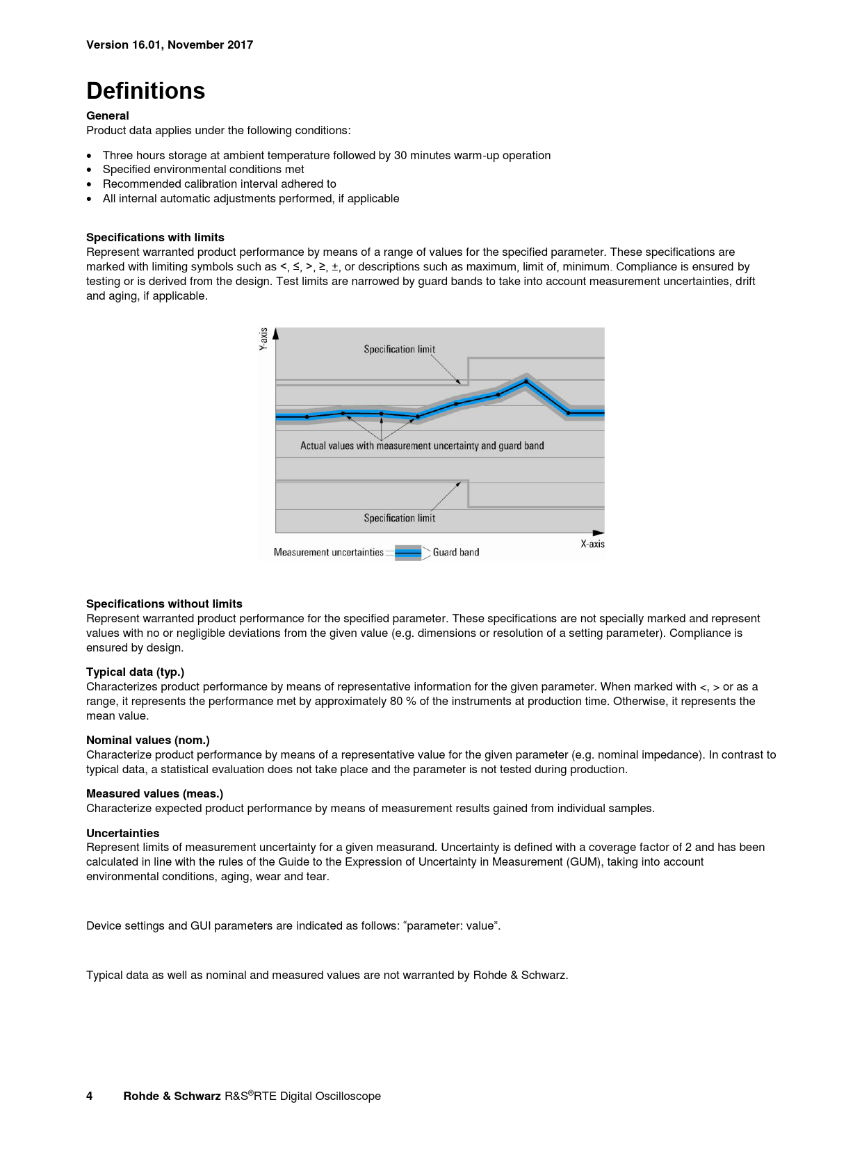 Version 16.01, November 2017Definitions General Product data applies under the following conditions: Three hours storage at ambient temperature followed by 30 minutes warm-up operation Specified environmental conditions met Recommended calibration interval adhered to All internal automatic adjustments performed, if applicable Specifications with limits Represent warranted product performance by means of a range of values for the specified parameter. These specifications are marked with limiting symbols such as <, ≤, >, ≥, ±, or descriptions such as maximum, limit of, minimum. Compliance is ensured by testing or is derived from the design. Test limits are narrowed by guard bands to take into account measurement uncertainties, drift and aging, if applicable. Specifications without limits Represent warranted product performance for the specified parameter. These specifications are not specially marked and represent values with no or negligible deviations from the given value (e.g. dimensions or resolution of a setting parameter). Compliance is ensured by design. Typical data (typ.) Characterizes product performance by means of representative information for the given parameter. When marked with <, > or as a range, it represents the performance met by approximately 80 % of the instruments at production time. Otherwise, it represents the mean value. Nominal values (nom.) Characterize product performance by means of a representative value for the given parameter (e.g. nominal impedance). In contrast to typical data, a statistical evaluation does not take place and the parameter is not tested during production. Measured values (meas.) Characterize expected product performance by means of measurement results gained from individual samples. Uncertainties Represent limits of measurement uncertainty for a given measurand. Uncertainty is defined with a coverage factor of 2 and has been calculated in line with the rules of the Guide to the Expression of Uncertainty in Measurement (GUM), taking into account environmental conditions, aging, wear and tear. Device settings and GUI parameters are indicated as follows: “parameter: value”. Typical data as well as nominal and measured values are not warranted by Rohde & Schwarz. 4Rohde & Schwarz R&S®RTE Digital Oscilloscope