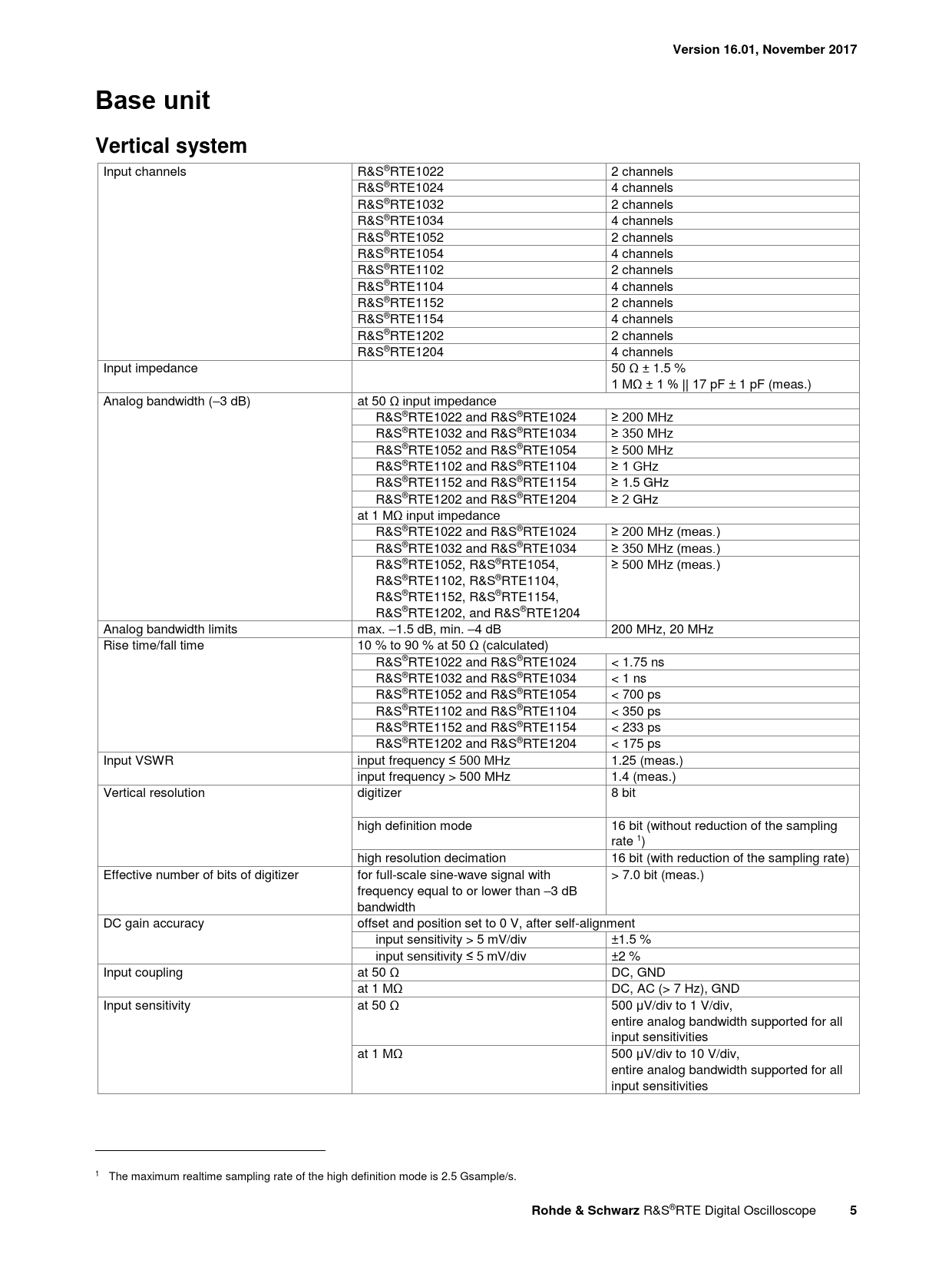 Version 16.01, November 2017Base unitVertical system Input channels R&S®RTE1022 2 channels R&S®RTE1024 4 channels R&S®RTE1032 2 channels R&S®RTE1034 4 channels R&S®RTE1052 2 channels R&S®RTE1054 4 channels R&S®RTE1102 2 channels R&S®RTE1104 4 channels R&S®RTE1152 2 channels R&S®RTE1154 4 channels R&S®RTE1202 2 channels R&S®RTE1204 4 channels Input impedance 50 Ω ± 1.5 % 1 MΩ ± 1 % || 17 pF ± 1 pF (meas.) Analog bandwidth (–3 dB) at 50 Ω input impedance R&S®RTE1022 and R&S®RTE1024 ≥ 200 MHz R&S®RTE1032 and R&S®RTE1034 ≥ 350 MHz R&S®RTE1052 and R&S®RTE1054 ≥ 500 MHz R&S®RTE1102 and R&S®RTE1104 ≥ 1 GHz R&S®RTE1152 and R&S®RTE1154 ≥ 1.5 GHz R&S®RTE1202 and R&S®RTE1204 ≥ 2 GHz at 1 MΩ input impedance R&S®RTE1022 and R&S®RTE1024 ≥ 200 MHz (meas.) R&S®RTE1032 and R&S®RTE1034 ≥ 350 MHz (meas.) R&S®RTE1052, R&S®RTE1054, ≥ 500 MHz (meas.) R&S®RTE1102, R&S®RTE1104, R&S®RTE1152, R&S®RTE1154, R&S®RTE1202, and R&S®RTE1204 Analog bandwidth limits max. –1.5 dB, min. –4 dB 200 MHz, 20 MHz Rise time/fall time 10 % to 90 % at 50 Ω (calculated) R&S®RTE1022 and R&S®RTE1024 < 1.75 ns R&S®RTE1032 and R&S®RTE1034 < 1 ns R&S®RTE1052 and R&S®RTE1054 < 700 ps R&S®RTE1102 and R&S®RTE1104 < 350 ps R&S®RTE1152 and R&S®RTE1154 < 233 ps R&S®RTE1202 and R&S®RTE1204 < 175 ps Input VSWR input frequency ≤ 500 MHz 1.25 (meas.) input frequency > 500 MHz 1.4 (meas.) Vertical resolution digitizer 8 bit high definition mode 16 bit (without reduction of the sampling rate 1) high resolution decimation 16 bit (with reduction of the sampling rate) Effective number of bits of digitizer for full-scale sine-wave signal with > 7.0 bit (meas.) frequency equal to or lower than –3 dB bandwidth DC gain accuracy offset and position set to 0 V, after self-alignment input sensitivity > 5 mV/div ±1.5 % input sensitivity ≤ 5 mV/div ±2 % Input coupling at 50 Ω DC, GND at 1 MΩ DC, AC (> 7 Hz), GND Input sensitivity at 50 Ω 500 μV/div to 1 V/div, entire analog bandwidth supported for all input sensitivities at 1 MΩ 500 μV/div to 10 V/div, entire analog bandwidth supported for all input sensitivities 1 The maximum realtime sampling rate of the high definition mode is 2.5 Gsample/s. Rohde & Schwarz R&S®RTE Digital Oscilloscope 5