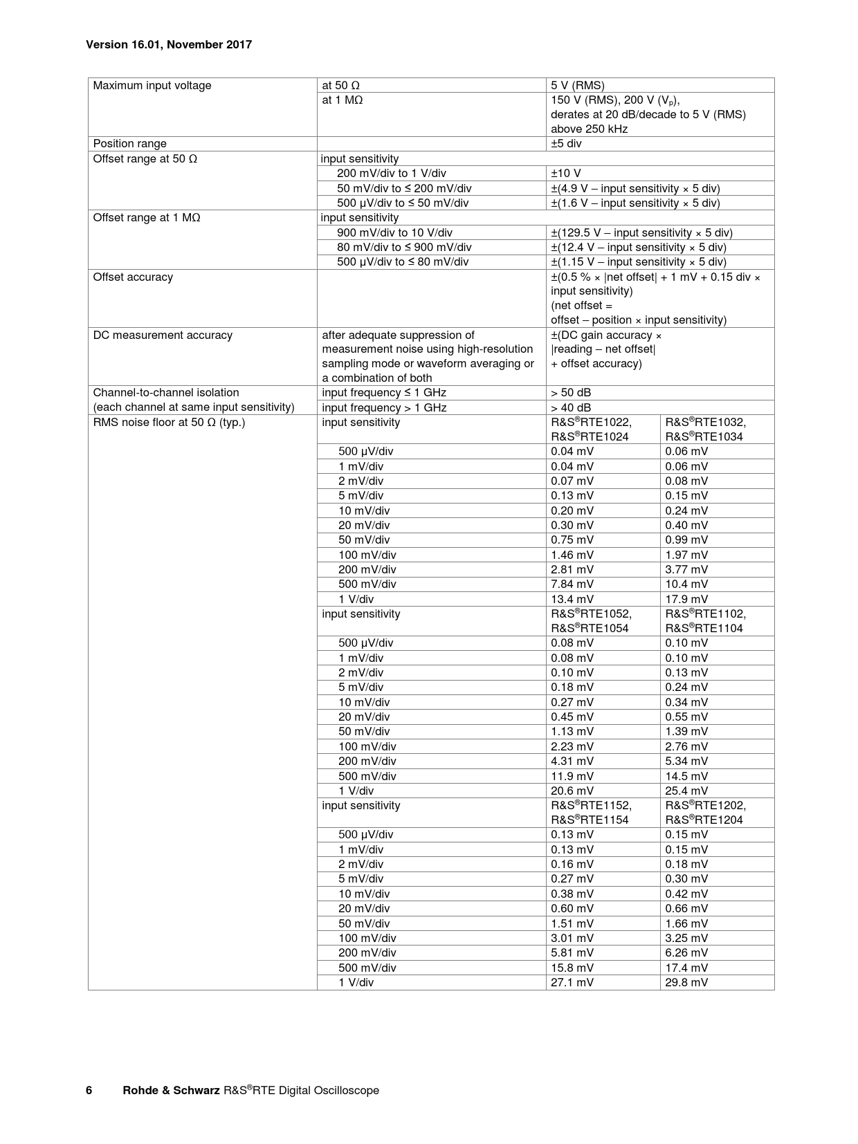 Maximum input voltage at 50 Ω 5 V (RMS) at 1 MΩ 150 V (RMS), 200 V (Vp), derates at 20 dB/decade to 5 V (RMS) above 250 kHz Position range ±5 div Offset range at 50 Ω input sensitivity 200 mV/div to 1 V/div ±10 V 50 mV/div to ≤ 200 mV/div ±(4.9 V – input sensitivity × 5 div) 500 μV/div to ≤ 50 mV/div ±(1.6 V – input sensitivity × 5 div) Offset range at 1 MΩ input sensitivity 900 mV/div to 10 V/div ±(129.5 V – input sensitivity × 5 div) 80 mV/div to ≤ 900 mV/div ±(12.4 V – input sensitivity × 5 div) 500 μV/div to ≤ 80 mV/div ±(1.15 V – input sensitivity × 5 div) Offset accuracy ±(0.5 % × |net offset| + 1 mV + 0.15 div × input sensitivity) (net offset = offset – position × input sensitivity) DC measurement accuracy after adequate suppression of ±(DC gain accuracy × measurement noise using high-resolution |reading – net offset| sampling mode or waveform averaging or + offset accuracy) a combination of both Channel-to-channel isolation input frequency ≤ 1 GHz > 50 dB (each channel at same input sensitivity) input frequency > 1 GHz > 40 dB RMS noise floor at 50 Ω (typ.) input sensitivity R&S®RTE1022, R&S®RTE1032, R&S®RTE1024 R&S®RTE1034 500 μV/div 0.04 mV 0.06 mV 1 mV/div 0.04 mV 0.06 mV 2 mV/div 0.07 mV 0.08 mV 5 mV/div 0.13 mV 0.15 mV 10 mV/div 0.20 mV 0.24 mV 20 mV/div 0.30 mV 0.40 mV 50 mV/div 0.75 mV 0.99 mV 100 mV/div 1.46 mV 1.97 mV 200 mV/div 2.81 mV 3.77 mV 500 mV/div 7.84 mV 10.4 mV 1 V/div 13.4 mV 17.9 mV input sensitivity R&S®RTE1052, R&S®RTE1102, R&S®RTE1054 R&S®RTE1104 500 μV/div 0.08 mV 0.10 mV 1 mV/div 0.08 mV 0.10 mV 2 mV/div 0.10 mV 0.13 mV 5 mV/div 0.18 mV 0.24 mV 10 mV/div 0.27 mV 0.34 mV 20 mV/div 0.45 mV 0.55 mV 50 mV/div 1.13 mV 1.39 mV 100 mV/div 2.23 mV 2.76 mV 200 mV/div 4.31 mV 5.34 mV 500 mV/div 11.9 mV 14.5 mV 1 V/div 20.6 mV 25.4 mV input sensitivity R&S®RTE1152, R&S®RTE1202, R&S®RTE1154 R&S®RTE1204 500 μV/div 0.13 mV 0.15 mV 1 mV/div 0.13 mV 0.15 mV 2 mV/div 0.16 mV 0.18 mV 5 mV/div 0.27 mV 0.30 mV 10 mV/div 0.38 mV 0.42 mV 20 mV/div 0.60 mV 0.66 mV 50 mV/div 1.51 mV 1.66 mV 100 mV/div 3.01 mV 3.25 mV 200 mV/div 5.81 mV 6.26 mV 500 mV/div 15.8 mV 17.4 mV 1 V/div 27.1 mV 29.8 mV