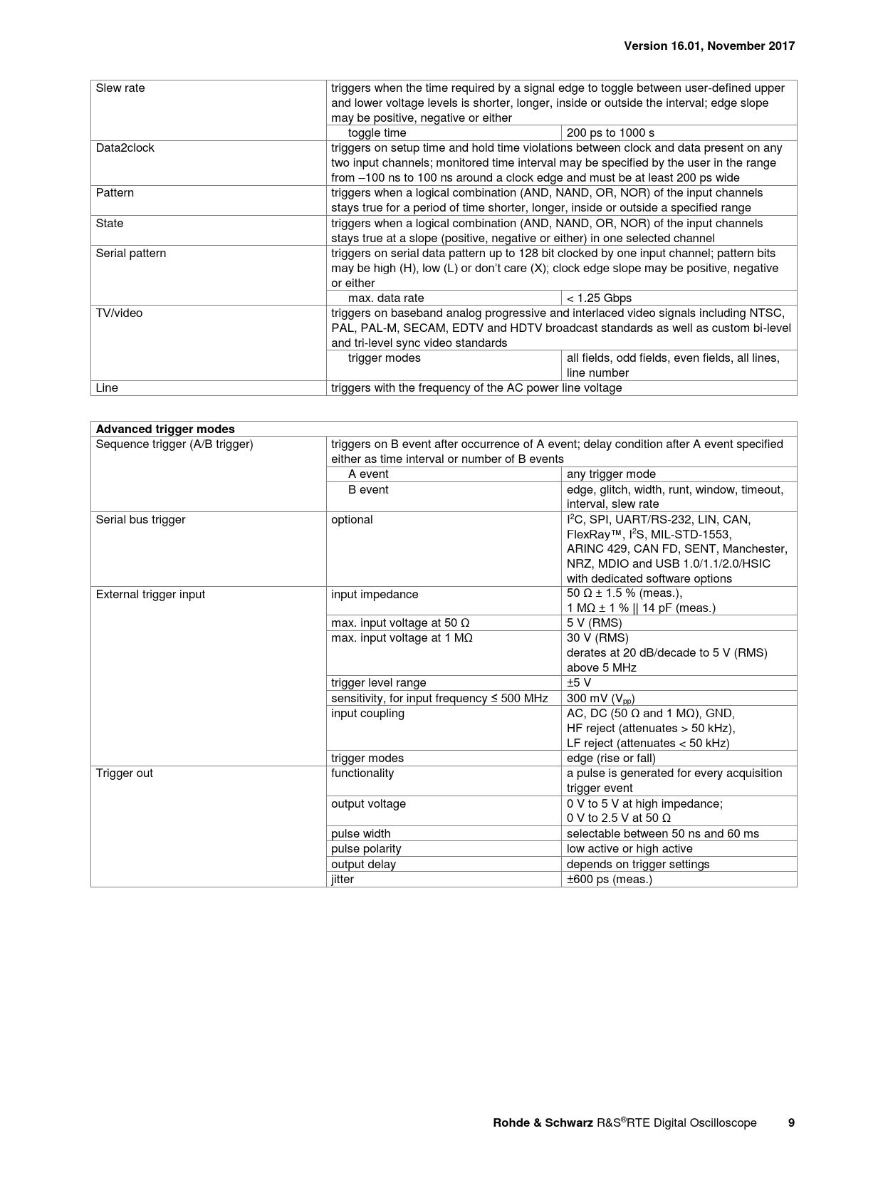 Version 16.01, November 2017 Slew rate triggers when the time required by a signal edge to toggle between user-defined upper and lower voltage levels is shorter, longer, inside or outside the interval; edge slope may be positive, negative or either toggle time 200 ps to 1000 s Data2clock triggers on setup time and hold time violations between clock and data present on any two input channels; monitored time interval may be specified by the user in the range from –100 ns to 100 ns around a clock edge and must be at least 200 ps wide Pattern triggers when a logical combination (AND, NAND, OR, NOR) of the input channels stays true for a period of time shorter, longer, inside or outside a specified range State triggers when a logical combination (AND, NAND, OR, NOR) of the input channels stays true at a slope (positive, negative or either) in one selected channel Serial pattern triggers on serial data pattern up to 128 bit clocked by one input channel; pattern bits may be high (H), low (L) or don’t care (X); clock edge slope may be positive, negative or either max. data rate < 1.25 Gbps TV/video triggers on baseband analog progressive and interlaced video signals including NTSC, PAL, PAL-M, SECAM, EDTV and HDTV broadcast standards as well as custom bi-level and tri-level sync video standards trigger modes all fields, odd fields, even fields, all lines, line number Line triggers with the frequency of the AC power line voltage Advanced trigger modes Sequence trigger (A/B trigger) triggers on B event after occurrence of A event; delay condition after A event specified either as time interval or number of B events A event any trigger mode B event edge, glitch, width, runt, window, timeout, interval, slew rate Serial bus trigger optional I2C, SPI, UART/RS-232, LIN, CAN, FlexRay™, I2S, MIL-STD-1553, ARINC 429, CAN FD, SENT, Manchester, NRZ, MDIO and USB 1.0/1.1/2.0/HSIC with dedicated software options External trigger input input impedance 50 Ω ± 1.5 % (meas.), 1 MΩ ± 1 % || 14 pF (meas.) max. input voltage at 50 Ω 5 V (RMS) max. input voltage at 1 MΩ 30 V (RMS) derates at 20 dB/decade to 5 V (RMS) above 5 MHz trigger level range ±5 V sensitivity, for input frequency ≤ 500 MHz 300 mV (Vpp) input coupling AC, DC (50 Ω and 1 MΩ), GND, HF reject (attenuates > 50 kHz), LF reject (attenuates < 50 kHz) trigger modes edge (rise or fall) Trigger out functionality a pulse is generated for every acquisition trigger event output voltage 0 V to 5 V at high impedance; 0 V to 2.5 V at 50 Ω pulse width selectable between 50 ns and 60 ms pulse polarity low active or high active output delay depends on trigger settings jitter ±600 ps (meas.) Rohde & Schwarz R&S®RTE Digital Oscilloscope 9