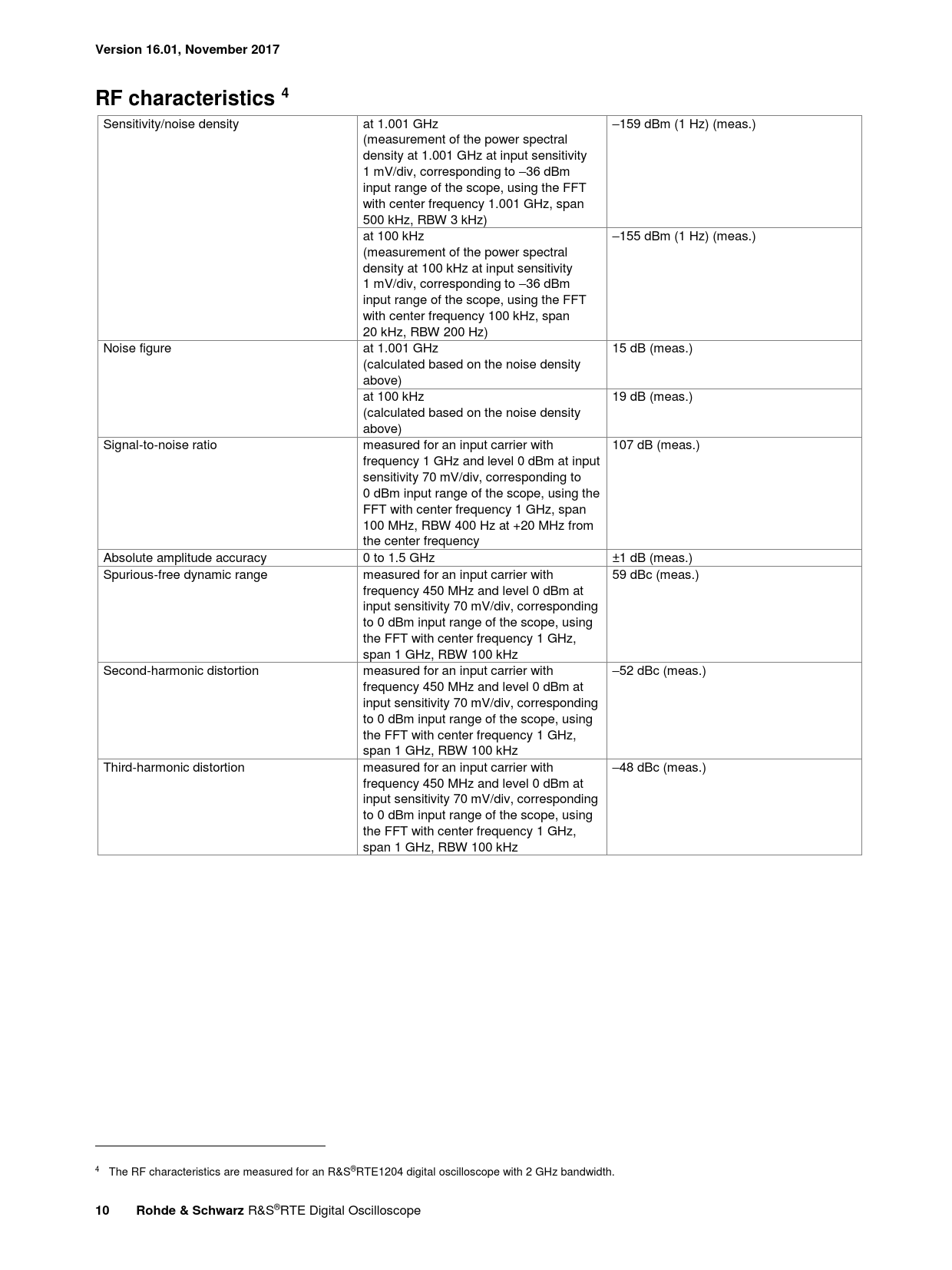 Version 16.01, November 2017RF characteristics 4 Sensitivity/noise density at 1.001 GHz –159 dBm (1 Hz) (meas.) (measurement of the power spectral density at 1.001 GHz at input sensitivity 1 mV/div, corresponding to –36 dBm input range of the scope, using the FFT with center frequency 1.001 GHz, span 500 kHz, RBW 3 kHz) at 100 kHz –155 dBm (1 Hz) (meas.) (measurement of the power spectral density at 100 kHz at input sensitivity 1 mV/div, corresponding to –36 dBm input range of the scope, using the FFT with center frequency 100 kHz, span 20 kHz, RBW 200 Hz) Noise figure at 1.001 GHz 15 dB (meas.) (calculated based on the noise density above) at 100 kHz 19 dB (meas.) (calculated based on the noise density above) Signal-to-noise ratio measured for an input carrier with 107 dB (meas.) frequency 1 GHz and level 0 dBm at input sensitivity 70 mV/div, corresponding to 0 dBm input range of the scope, using the FFT with center frequency 1 GHz, span 100 MHz, RBW 400 Hz at +20 MHz from the center frequency Absolute amplitude accuracy 0 to 1.5 GHz ±1 dB (meas.) Spurious-free dynamic range measured for an input carrier with 59 dBc (meas.) frequency 450 MHz and level 0 dBm at input sensitivity 70 mV/div, corresponding to 0 dBm input range of the scope, using the FFT with center frequency 1 GHz, span 1 GHz, RBW 100 kHz Second-harmonic distortion measured for an input carrier with –52 dBc (meas.) frequency 450 MHz and level 0 dBm at input sensitivity 70 mV/div, corresponding to 0 dBm input range of the scope, using the FFT with center frequency 1 GHz, span 1 GHz, RBW 100 kHz Third-harmonic distortion measured for an input carrier with –48 dBc (meas.) frequency 450 MHz and level 0 dBm at input sensitivity 70 mV/div, corresponding to 0 dBm input range of the scope, using the FFT with center frequency 1 GHz, span 1 GHz, RBW 100 kHz 4 The RF characteristics are measured for an R&S®RTE1204 digital oscilloscope with 2 GHz bandwidth. 10Rohde & Schwarz R&S®RTE Digital Oscilloscope