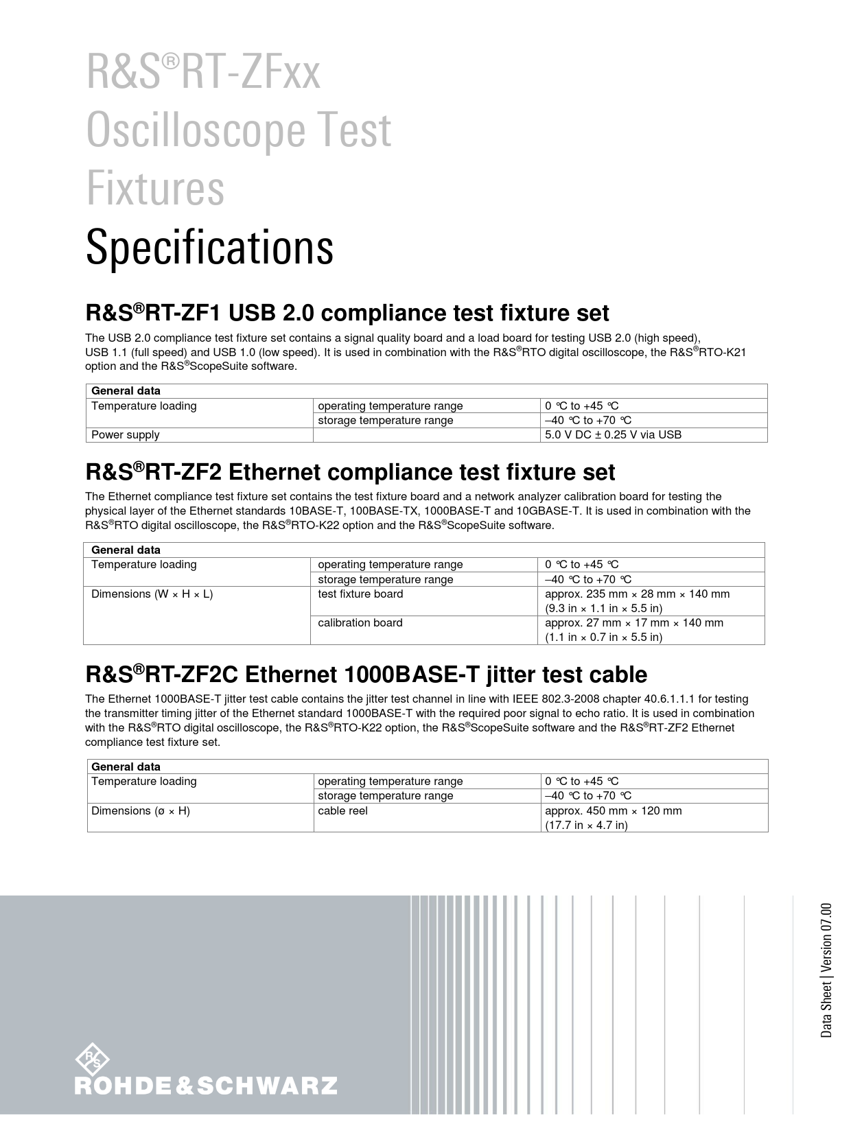 R&S®RT -ZFxx Oscillosc ope Test Fixture s Specifica tions R&S®RT-ZF1 USB 2.0 compliance test fixture set The USB 2.0 compliance test fixture set contains a signal quality board and a load board for testing USB 2.0 (high speed), USB 1.1 (full speed) and USB 1.0 (low speed). It is used in combination with the R&S®RTO digital oscilloscope, the R&S®RTO-K21 option and the R&S®ScopeSuite software. General data Temperature loading operating temperature range 0 °C to +45 °C storage temperature range –40 °C to +70 °C Power supply 5.0 V DC ± 0.25 V via USB R&S®RT-ZF2 Ethernet compliance test fixture set The Ethernet compliance test fixture set contains the test fixture board and a network analyzer calibration board for testing the physical layer of the Ethernet standards 10BASE-T, 100BASE-TX, 1000BASE-T and 10GBASE-T. It is used in combination with the R&S®RTO digital oscilloscope, the R&S®RTO-K22 option and the R&S®ScopeSuite software. General data Temperature loading operating temperature range 0 °C to +45 °C storage temperature range –40 °C to +70 °C Dimensions (W × H × L) test fixture board approx. 235 mm × 28 mm × 140 mm (9.3 in × 1.1 in × 5.5 in) calibration board approx. 27 mm × 17 mm × 140 mm (1.1 in × 0.7 in × 5.5 in) R&S®RT-ZF2C Ethernet 1000BASE-T jitter test cable The Ethernet 1000BASE-T jitter test cable contains the jitter test channel in line with IEEE 802.3-2008 chapter 40.6.1.1.1 for testing the transmitter timing jitter of the Ethernet standard 1000BASE-T with the required poor signal to echo ratio. It is used in combination with the R&S®RTO digital oscilloscope, the R&S®RTO-K22 option, the R&S®ScopeSuite software and the R&S®RT-ZF2 Ethernet compliance test fixture set. General data Temperature loading operating temperature range 0 °C to +45 °C storage temperature range –40 °C to +70 °C Dimensions (ø × H) cable reel approx. 450 mm × 120 mm (17.7 in × 4.7 in) .00 07 rsion Ve t | hee S ata D