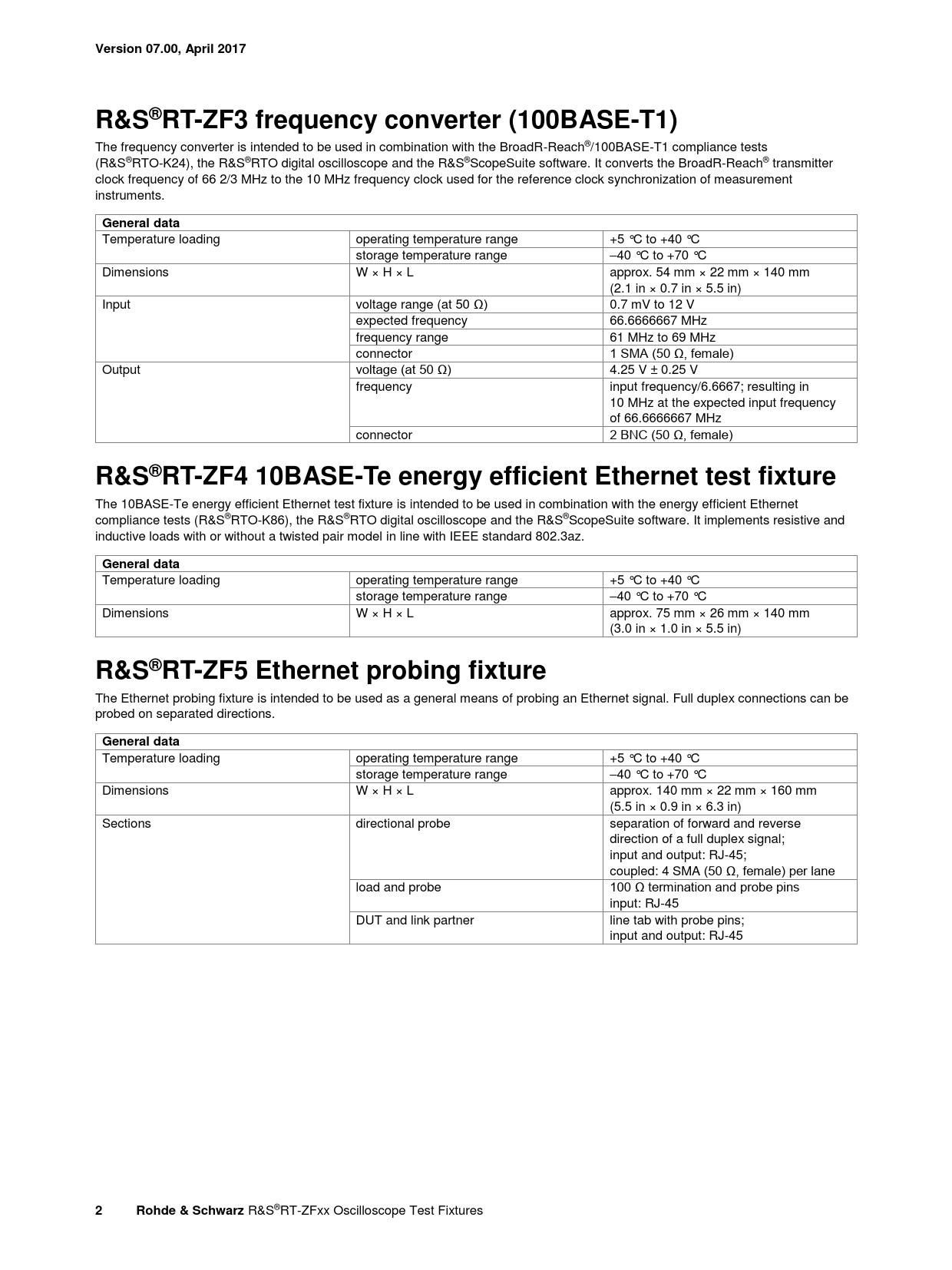 Version 07.00, April 2017R&S®RT-ZF3 frequency converter (100BASE-T1) The frequency converter is intended to be used in combination with the BroadR-Reach®/100BASE-T1 compliance tests (R&S®RTO-K24), the R&S®RTO digital oscilloscope and the R&S®ScopeSuite software. It converts the BroadR-Reach® transmitter clock frequency of 66 2/3 MHz to the 10 MHz frequency clock used for the reference clock synchronization of measurement instruments. General data Temperature loading operating temperature range +5 °C to +40 °C storage temperature range –40 °C to +70 °C Dimensions W × H × L approx. 54 mm × 22 mm × 140 mm (2.1 in × 0.7 in × 5.5 in) Input voltage range (at 50 Ω) 0.7 mV to 12 V expected frequency 66.6666667 MHz frequency range 61 MHz to 69 MHz connector 1 SMA (50 Ω, female) Output voltage (at 50 Ω) 4.25 V ± 0.25 V frequency input frequency/6.6667; resulting in 10 MHz at the expected input frequency of 66.6666667 MHz connector 2 BNC (50 Ω, female) R&S®RT-ZF4 10BASE-Te energy efficient Ethernet test fixture The 10BASE-Te energy efficient Ethernet test fixture is intended to be used in combination with the energy efficient Ethernet compliance tests (R&S®RTO-K86), the R&S®RTO digital oscilloscope and the R&S®ScopeSuite software. It implements resistive and inductive loads with or without a twisted pair model in line with IEEE standard 802.3az. General data Temperature loading operating temperature range +5 °C to +40 °C storage temperature range –40 °C to +70 °C Dimensions W × H × L approx. 75 mm × 26 mm × 140 mm (3.0 in × 1.0 in × 5.5 in) R&S®RT-ZF5 Ethernet probing fixture The Ethernet probing fixture is intended to be used as a general means of probing an Ethernet signal. Full duplex connections can be probed on separated directions. General data Temperature loading operating temperature range +5 °C to +40 °C storage temperature range –40 °C to +70 °C Dimensions W × H × L approx. 140 mm × 22 mm × 160 mm (5.5 in × 0.9 in × 6.3 in) Sections directional probe separation of forward and reverse direction of a full duplex signal; input and output: RJ-45; coupled: 4 SMA (50 Ω, female) per lane load and probe 100 Ω termination and probe pins input: RJ-45 DUT and link partner line tab with probe pins; input and output: RJ-45 2Rohde & Schwarz R&S®RT-ZFxx Oscilloscope Test Fixtures
