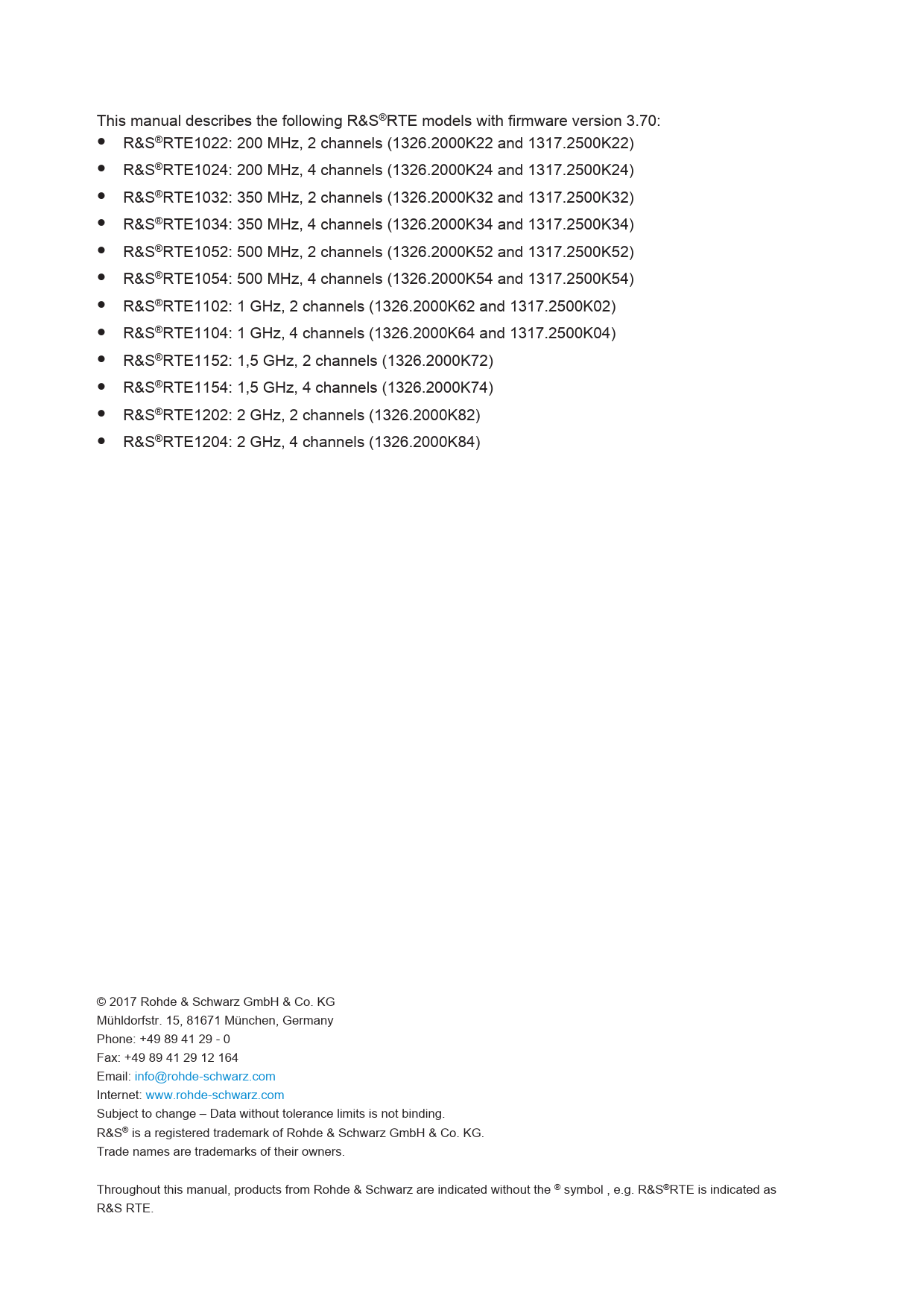 This. manual. describes. the. following. R&S®RTE. models. with. firmware. version. 3.70:. ●. R&S®RTE1022:. 200. MHz,. 2. channels. (1326.2000K22