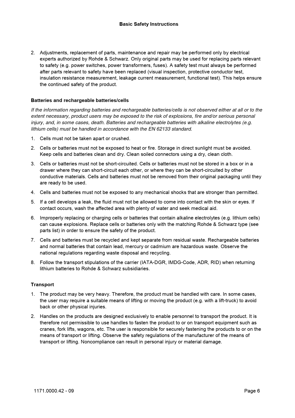 Basic Safety Instructions 2. Adjustments, replacement of parts, maintenance and repair may be performed only by electrical experts authorized by Rohde & Schwarz. Only original parts may be used for replacing parts relevant to safety (e.g. power switches, power transformers, fuses). A safety test must always be performed after parts relevant to safety have been replaced (visual inspection, protective conductor test, insulation resistance measurement, leakage current measurement, functional test). This helps ensure the continued safety of the product. Batteries and rechargeable batteries/cells If the information regarding batteries and rechargeable batteries/cells is not observed either at all or to the extent necessary, product users may be exposed to the risk of explosions, fire and/or serious personal injury, and, in some cases, death. Batteries and rechargeable batteries with alkaline electrolytes (e.g. lithium cells) must be handled in accordance with the EN 62133 standard. 1. Cells must not be taken apart or crushed. 2. Cells or batteries must not be exposed to heat or fire. Storage in direct sunlight must be avoided. Keep cells and batteries clean and dry. Clean soiled connectors using a dry, clean cloth. 3. Cells or batteries must not be short-circuited. Cells or batteries must not be stored in a box or in a drawer where they can short-circuit each other, or where they can be short-circuited by other conductive materials. Cel s and batteries must not be removed from their original packaging until they are ready to be used. 4. Cells and batteries must not be exposed to any mechanical shocks that are stronger than permitted. 5. If a cell develops a leak, the fluid must not be al owed to come into contact with the skin or eyes. If contact occurs, wash the affected area with plenty of water and seek medical aid. 6. Improperly replacing or charging cel s or batteries that contain alkaline electrolytes (e.g. lithium cells) can cause explosions. Replace cells or batteries only with the matching Rohde & Schwarz type (see parts list) in order to ensure the safety of the product. 7. Cells and batteries must be recycled and kept separate from residual waste. Rechargeable batteries and normal batteries that contain lead, mercury or cadmium are hazardous waste. Observe the national regulations regarding waste disposal and recycling. 8. Follow the transport stipulations of the carrier (IATA-DGR, IMDG-Code, ADR, RID) when returning lithium batteries to Rohde & Schwarz subsidiaries. Transport 1. The product may be very heavy. Therefore, the product must be handled with care. In some cases, the user may require a suitable means of lifting or moving the product (e.g. with a lift-truck) to avoid back or other physical injuries. 2. Handles on the products are designed exclusively to enable personnel to transport the product. It is therefore not permissible to use handles to fasten the product to or on transport equipment such as cranes, fork lifts, wagons, etc. The user is responsible for securely fastening the products to or on the means of transport or lifting. Observe the safety regulations of the manufacturer of the means of transport or lifting. Noncompliance can result in personal injury or material damage. 1171.0000.42 - 09 Page 6 Document Outline Cover Basic Safety Instructions Customer Support Contents 1 Preface 1.1 Key Features 1.2 Documentation Overview 1.2.1 Manuals and Instrument Help 1.2.2 Data Sheet and Brochure 1.2.3 Release Notes, Open Source Acknowledgment 1.2.4 Calibration Certificate 1.2.5 Application notes, Application cards, Videos 1.3 Options Described in this Document 1.4 Conventions Used in the Documentation 1.4.1 Typographical Conventions 1.4.2 Conventions for Procedure Descriptions 2 Getting Started 2.1 Preparing for Use 2.1.1 Unpacking and Checking the Instrument 2.1.2 Positioning the Instrument 2.1.2.1 Bench Top Operation 2.1.2.2 Rackmounting 2.1.3 Starting the Instrument 2.1.3.1 Powering On 2.1.3.2 Starting Up and Shutting Down 2.1.3.3 Powering Off 2.1.3.4 EMI Suppression 2.1.4 Connecting External Devices 2.1.4.1 Connecting USB Devices 2.1.4.2 Connecting an External Monitor 2.2 Instrument Tour 2.2.1 Front Panel 2.2.1.1 Input Connectors 2.2.1.2 Other Front Panel Connectors 2.2.2 Rear Panel 2.2.3 Keys and Controls 2.2.3.1 SETUP Controls 2.2.3.2 HORIZONTAL Controls 2.2.3.3 VERTICAL Controls 2.2.3.4 TRIGGER Controls 2.2.3.5 ANALYSIS Keys 2.2.3.6 NAVIGATION Controls 2.2.3.7 POWER Key 2.3 Trying Out the Instrument 2.3.1 Displaying a Basic Signal 2.3.2 Acquiring Data 2.3.3 Changing the Waveform Scaling and Position 2.3.4 Zooming into the Display 2.3.4.1 Using the Standard Zoom 2.3.4.2 Using the Fingertip Zoom 2.3.5 Displaying the Waveform History 2.3.6 Showing Basic Measurement Results 2.3.6.1 Performing a Cursor Measurement 2.3.6.2 Performing Automatic Amplitude Measurements 2.3.6.3 Performing and Configuring the Quick Measurement 2.3.6.4 Displaying a Histogram 2.3.7 Performing a Basic FFT Analysis 2.3.8 Performing Mathematical Calculations 2.3.9 Performing a Search 2.3.10 Performing a Mask Test 2.3.11 Printing and Saving Screenshots 2.3.12 Saving Data 2.4 Operating the Instrument 2.4.1 Means of Manual Interaction 2.4.2 Touchscreen Display 2.4.2.1 Information on the Display 2.4.2.2 Control Elements on the Touchscreen 2.4.3 App Cockpit 2.4.4 Working with Waveforms 2.4.5 Using the Signal bar 2.4.6 Toolbar 2.4.6.1 Using the Toolbar 2.4.6.2 Configuring the Toolbar 2.4.6.3 Toolbar Functions 2.4.7 Displaying Results 2.4.8 Using Dialog Boxes 2.4.9 Entering Data 2.4.10 Messages 2.4.11 Getting Information and Help 2.4.11.1 Displaying Tutorials 2.4.11.2 Displaying Help 2.4.11.3 Using the Help Window 3 Instrument Setup 3.1 System Setup 3.1.1 System Settings 3.1.2 Setting the Display Language 3.2 Screen Setup 3.2.1 Screen Settings 3.2.2 Aligning the Touchscreen 3.3 Frontpanel Setup 3.3.1 Setup: Luminosity Settings 3.3.2 Hardkeys: Function Assignment 3.3.3 Knobs 3.4 Display Configuration 3.