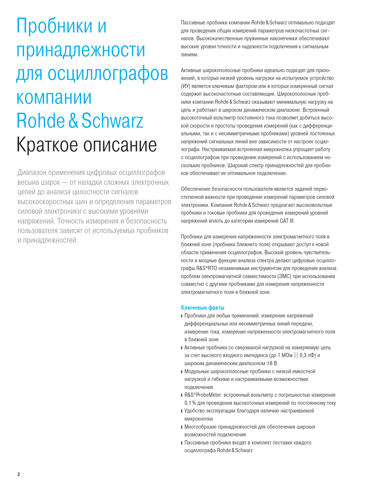 Пробники и Пассивные пробники компании Rohde & Schwarz оптимально подходят для проведения общих измерений параметров низкочастотных сиг- принадлежности налов. Высококачественные пружинные наконечники обеспечивают высокие уровни точности и надежности подключения к сигнальным линиям. для осциллографов Активные широкополосные пробники идеально подходят для прило- жений, в которых низкий уровень нагрузки на испытуемое устройство компании (ИУ) является ключевым фактором или в которых измеренный сигнал содержит высокочастотные составляющие. Широкополосные проб- ники компании Rohde & Schwarz оказывают минимальную нагрузку на Rohde & Schwarz цепь и работают в широком динамическом диапазоне. Встроенный высокоточный вольтметр постоянного тока позволяет добиться высо- кой скорости и простоты проведения измерений (как с дифференци- Краткое описание альными, так и с несимметричными пробниками) уровней постоянных напряжений сигнальных линий вне зависимости от настроек осцил- лографа. Настраиваемая встроенная микрокнопка упрощает работу с осциллографом при проведении измерений с использованием не- скольких пробников. Широкий спектр принадлежностей для пробни- Диапазон применения цифровых осциллографов ков обеспечивает их оптимальное подключение. весьма широк — от наладки сложных электронных цепей до анализа целостности сигналов Обеспечение безопасности пользователя является задачей перво- высокоскоростных шин и определения параметров степенной важности при проведении измерений параметров силовой электроники. Компания Rohde & Schwarz предлагает высоковольтные силовой электроники с высокими уровнями пробники и токовые пробники для проведения измерений уровней напряжений. Точность измерения и безопасность напряжений вплоть до категории измерений CAT III. пользователя зависят от используемых пробников и принадлежностей. Пробники для измерения напряженности электромагнитного поля в ближней зоне (пробники ближнего поля) открывают доступ к новой области применения осциллографов. Высокий уровень чувствитель- ности и мощные функции анализа спектра делают цифровые осцилло- графы R&S®RTO незаменимым инструментом для проведения анализа проблем электромагнитной совместимости (ЭМС) при использовании совместно с другими пробниками для измерения напряженности электромагнитного поля в ближней зоне. Ключевые факты ❙ Пробники для любых применений: измерение напряжений дифференциальных или несимметричных линий передачи, измерение тока, измерение напряженности электромагнитного поля в ближней зоне ❙ Активные пробники со сверхмалой нагрузкой на измеряемую цепь за счет высокого входного импеданса (до 1 МОм || 0,3 пФ) и широким динамическим диапазоном ±8 В ❙ Модульные широкополосные пробники с низкой емкостной нагрузкой и гибкими и настраиваемыми возможностями подключения ❙ R&S®ProbeMeter: встроенный вольтметр с погрешностью измерения 0,1 % для проведения высокоточных измерений по постоянному току ❙ Удобство эксплуатации благодаря наличию настраиваемой микрокнопки ❙ Многообразие принадлежностей для обеспечения широких возможностей подключения ❙ Пассивные пробники входят в комплект поставки каждого осциллографа Rohde & Schwarz 2 Probes_accessories_bro_ru_3606-8866-18_v1200.indd 2 12.04.2018 08:16:58