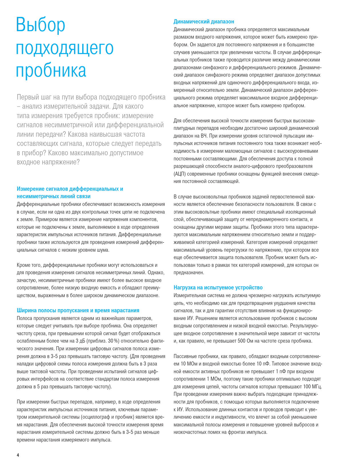 Динамический диапазон Выбор Динамический диапазон пробника определяется максимальным размахом входного напряжения, которое может быть измерено при- бором. Он задается для постоянного напряжения и в большинстве подходящего случаев уменьшается при увеличении частоты. В случае дифференци- альных пробников также проводится различие между динамическими диапазонами синфазного и дифференциального режимов. Динамиче- пробника ский диапазон синфазного режима определяет диапазон допустимых входных напряжений для одиночного дифференциального входа, из- меренный относительно земли. Динамический диапазон дифферен- Первый шаг на пути выбора подходящего пробника циального режима определяет максимальное входное дифференци- альное напряжение, которое может быть измерено прибором. – анализ измерительной задачи. Для какого типа измерения требуется пробник: измерение Для обеспечения высокой точности измерения быстрых высокоам- сигналов несимметричной или дифференциальной плитудных перепадов необходим достаточно широкий динамический линии передачи? Какова наивысшая частота диапазон на ВЧ. При измерении уровня остаточной пульсации им- составляющих сигнала, которые следует передать пульсных источников питания постоянного тока также возникает необ- ходимость в измерении маломощных сигналов с высокоуровневыми в прибор? Каково максимально допустимое постоянными составляющими. Для обеспечения доступа к полной входное напряжение? разрешающей способности аналого-цифрового преобразователя (АЦП) современные пробники оснащены функцией внесения смеще- ния постоянной составляющей. Измерение сигналов дифференциальных и несимметричных линий связи В случае высоковольтных пробников задачей первостепенной важ- Дифференциальные пробники обеспечивают возможность измерения ности является обеспечение безопасности пользователя. В связи с в случае, если ни одна из двух контрольных точек цепи не подключена этим высоковольтные пробники имеют специальный изоляционный к земле. Примером является измерение напряжения компонентов, слой, обеспечивающий защиту от непреднамеренного контакта, и которые не подключены к земле, выполняемое в ходе определения оснащены другими мерами защиты. Пробники этого типа характери- характеристик импульсных источников питания. Дифференциальные зуются максимальным напряжением относительно земли и поддер- пробники также используются для проведения измерений дифферен- живаемой категорией измерений. Категория измерений определяет циальных сигналов с низким уровнем шума. максимальный уровень перегрузки по напряжению, при котором все еще обеспечивается защита пользователя. Пробник может быть ис- Кроме того, дифференциальные пробники могут использоваться и пользован только в рамках тех категорий измерений, для которых он для проведения измерения сигналов несимметричных линий. Однако, предназначен. зачастую, несимметричные пробники имеют более высокое входное сопротивление, более низкую входную емкость и обладают преиму- Нагрузка на испытуемое устройство ществом, выраженным в более широком динамическом диапазоне. Измерительная система не должна чрезмерно нагружать испытуемую цепь, что необходимо как для предотвращения ухудшения качества Ширина полосы пропускания и время нарастания сигна