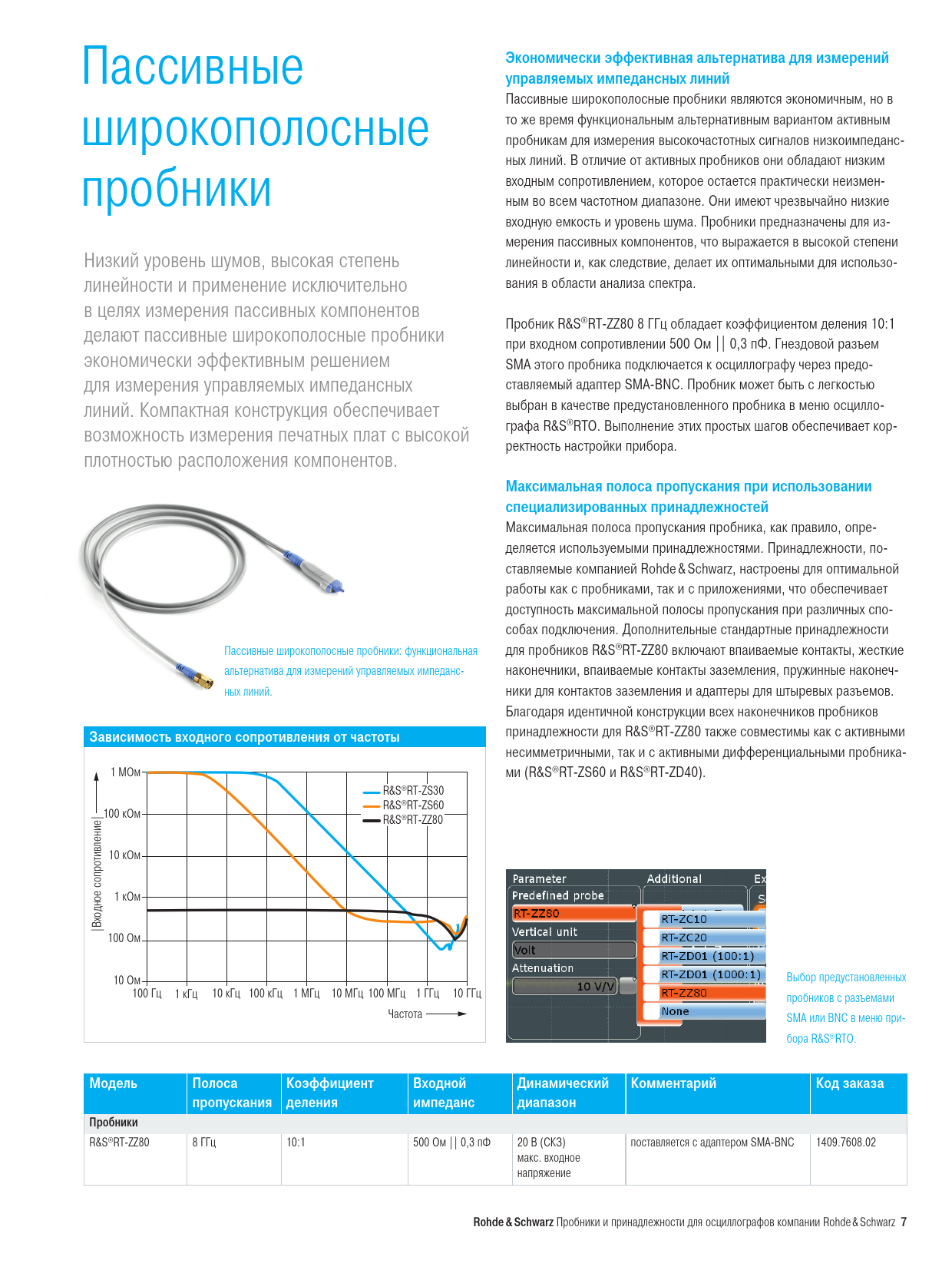 Экономически эффективная альтернатива для измерений Пассивные управляемых импедансных линий Пассивные широкополосные пробники являются экономичным, но в то же время функциональным альтернативным вариантом активным широкополосные пробникам для измерения высокочастотных сигналов низкоимпеданс- ных линий. В отличие от активных пробников они обладают низким входным сопротивлением, которое остается практически неизмен- пробники ным во всем частотном диапазоне. Они имеют чрезвычайно низкие входную емкость и уровень шума. Пробники предназначены для из- мерения пассивных компонентов, что выражается в высокой степени Низкий уровень шумов, высокая степень линейности и, как следствие, делает их оптимальными для использо- вания в области анализа спектра. линейности и применение исключительно в целях измерения пассивных компонентов Пробник R&S®RT-ZZ80 8 ГГц обладает коэффициентом деления 10:1 делают пассивные широкополосные пробники при входном сопротивлении 500 Ом || 0,3 пФ. Гнездовой разъем экономически эффективным решением SMA этого пробника подключается к осциллографу через предо- для измерения управляемых импедансных ставляемый адаптер SMA-BNC. Пробник может быть с легкостью выбран в качестве предустановленного пробника в меню осцилло- линий. Компактная конструкция обеспечивает графа R&S®RTO. Выполнение этих простых шагов обеспечивает кор- возможность измерения печатных плат с высокой ректность настройки прибора. плотностью расположения компонентов. Максимальная полоса пропускания при использовании специализированных принадлежностей Максимальная полоса пропускания пробника, как правило, опре- деляется используемыми принадлежностями. Принадлежности, по- ставляемые компанией Rohde & Schwarz, настроены для оптимальной работы как с пробниками, так и с приложениями, что обеспечивает доступность максимальной полосы пропускания при различных спо- собах подключения. Дополнительные стандартные принадлежности Пассивные широкополосные пробники: функциональная для пробников R&S®RT-ZZ80 включают впаиваемые контакты, жесткие альтернатива для измерений управляемых импеданс- наконечники, впаиваемые контакты заземления, пружинные наконеч- ных линий. ники для контактов заземления и адаптеры для штыревых разъемов. Благодаря идентичной конструкции всех наконечников пробников принадлежности для R&S®RT-ZZ80 также совместимы как с активными Зависимость входного сопротивления от частоты несимметричными, так и с активными дифференциальными пробника- 1 МОм ми (R&S®RT-ZS60 и R&S®RT-ZD40). R&S®RT-ZS30 R&S®RT-ZS60 100 кОм R&S®RT-ZZ80 10 кОм 1 кОм |Входное сопротивление| 100 Ом 10 Ом Выбор предустановленных 100 Гц 1 кГц 10 кГц 100 кГц 1 МГц 10 МГц 100 МГц 1 ГГц 10 ГГц пробников с разъемами Частота SMA или BNC в меню при- бора R&S®RTO. Модель Полоса Коэффициент Входной Динамический Комментарий Код заказа пропускания деления импеданс диапазон Пробники R&S®RT-ZZ80 8 ГГц 10:1 500 Ом || 0,3 пФ 20 В (СКЗ) поставляется с адаптером SMA-BNC 1409.7608.02 макс. входное напряжение Rohde & Schwarz Пробники и принадлежности для осциллографов компании Rohde & Schwarz 7 Probes_accessories_bro_ru_3606-8866-18_v1200.indd 7 12.04.2018 08:17:06