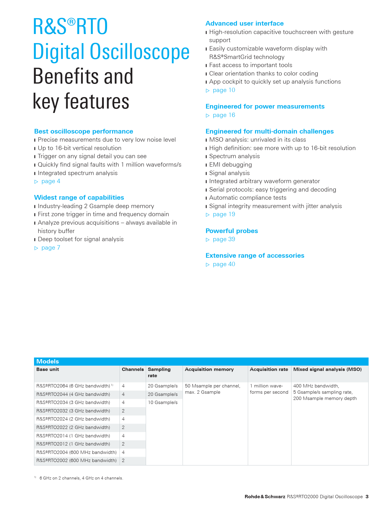 R&S®RTO Advanced user interface ❙High-resolution capacitive touchscreen with gesture Digital Oscilloscope support ❙Easily customizable waveform display with R&S®SmartGrid technology Benefits and ❙Fast access to important tools ❙Clear orientation thanks to color coding ❙App cockpit to quickly set up analysis functions key features ▷ page 10 Engineered for power measurements ▷ page 16 Best oscilloscope performanceEngineered for multi-domain challenges ❙Precise measurements due to very low noise level ❙MSO analysis: unrivaled in its class ❙Up to 16-bit vertical resolution ❙High definition: see more with up to 16-bit resolution ❙Trigger on any signal detail you can see ❙Spectrum analysis ❙Quickly find signal faults with 1 million waveforms/s ❙EMI debugging ❙Integrated spectrum analysis ❙Signal analysis ▷ page 4 ❙Integrated arbitrary waveform generator ❙Serial protocols: easy triggering and decoding Widest range of capabilities ❙Automatic compliance tests ❙Industry-leading 2 Gsample deep memory ❙Signal integrity measurement with jitter analysis ❙First zone trigger in time and frequency domain ▷ page 19 ❙Analyze previous acquisitions – always available in history buffer Powerful probes ❙Deep toolset for signal analysis ▷ page 39 ▷ page 7 Extensive range of accessories ▷ page 40 Models Base unitChannels SamplingAcquisition memoryAcquisition rate Mixed signal analysis (MSO)rate R&S®RTO2064 (6 GHz bandwidth) 1) 4 20 Gsample/s 50 Msample per channel, 1 million wave- 400 MHz bandwidth, max. 2 Gsample forms per second 5 Gsample/s sampling rate, R&S®RTO2044 (4 GHz bandwidth) 4 20 Gsample/s 200 Msample memory depth R&S®RTO2034 (3 GHz bandwidth) 4 10 Gsample/s R&S®RTO2032 (3 GHz bandwidth) 2 R&S®RTO2024 (2 GHz bandwidth) 4 R&S®RTO2022 (2 GHz bandwidth) 2 R&S®RTO2014 (1 GHz bandwidth) 4 R&S®RTO2012 (1 GHz bandwidth) 2 R&S®RTO2004 (600 MHz bandwidth) 4 R&S®RTO2002 (600 MHz bandwidth) 2 1) 6 GHz on 2 channels, 4 GHz on 4 channels. Rohde & Schwarz R&S®RTO2000 Digital Oscilloscope 3 RTO2000_bro_en_3607-2684-12_v0901.indd 3 23.11.2017 14:54:09
