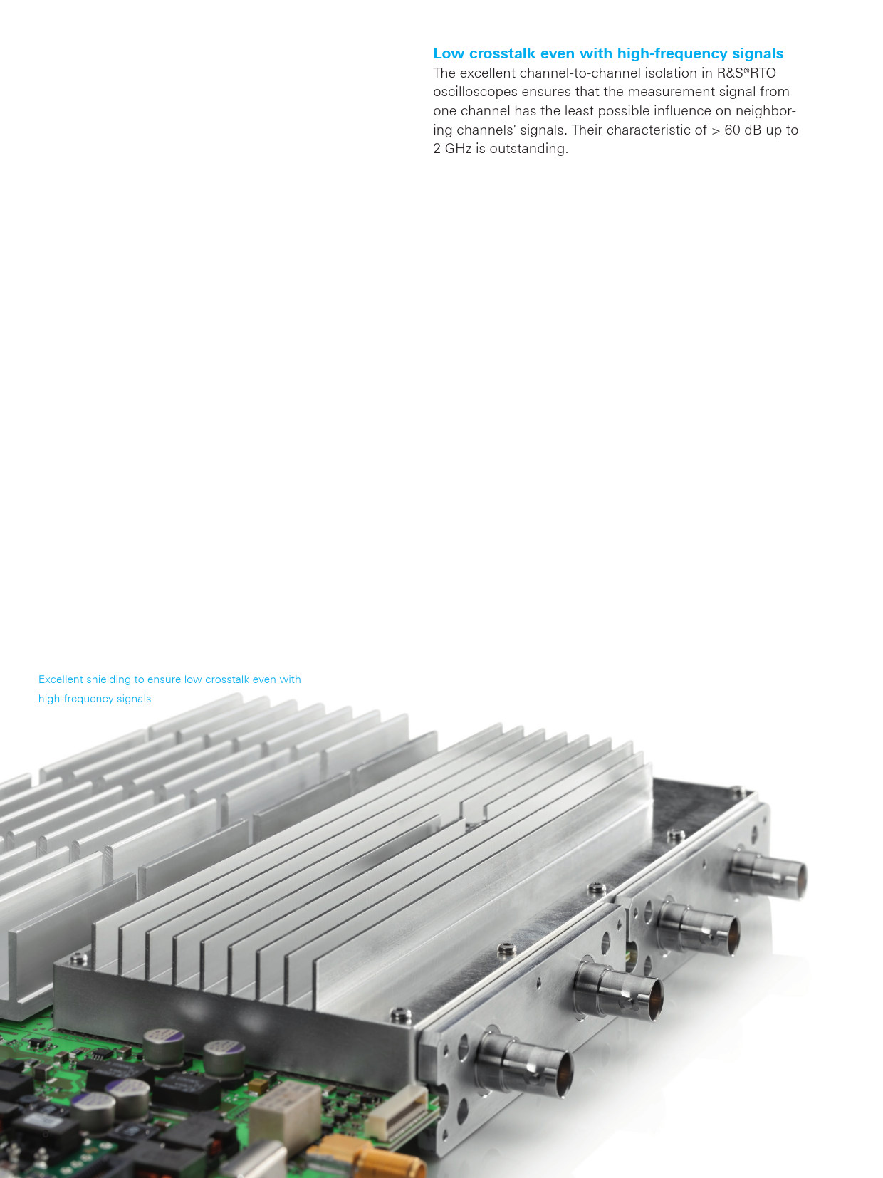 Low crosstalk even with high-frequency signals The excellent channel-to-channel isolation in R&S®RTO oscilloscopes ensures that the measurement signal from one channel has the least possible influence on neighbor- ing channels' signals. Their characteristic of > 60 dB up to 2 GHz is outstanding. Excellent shielding to ensure low crosstalk even with high-frequency signals. 6 RTO2000_bro_en_3607-2684-12_v0901.indd 6 23.11.2017 14:54:12
