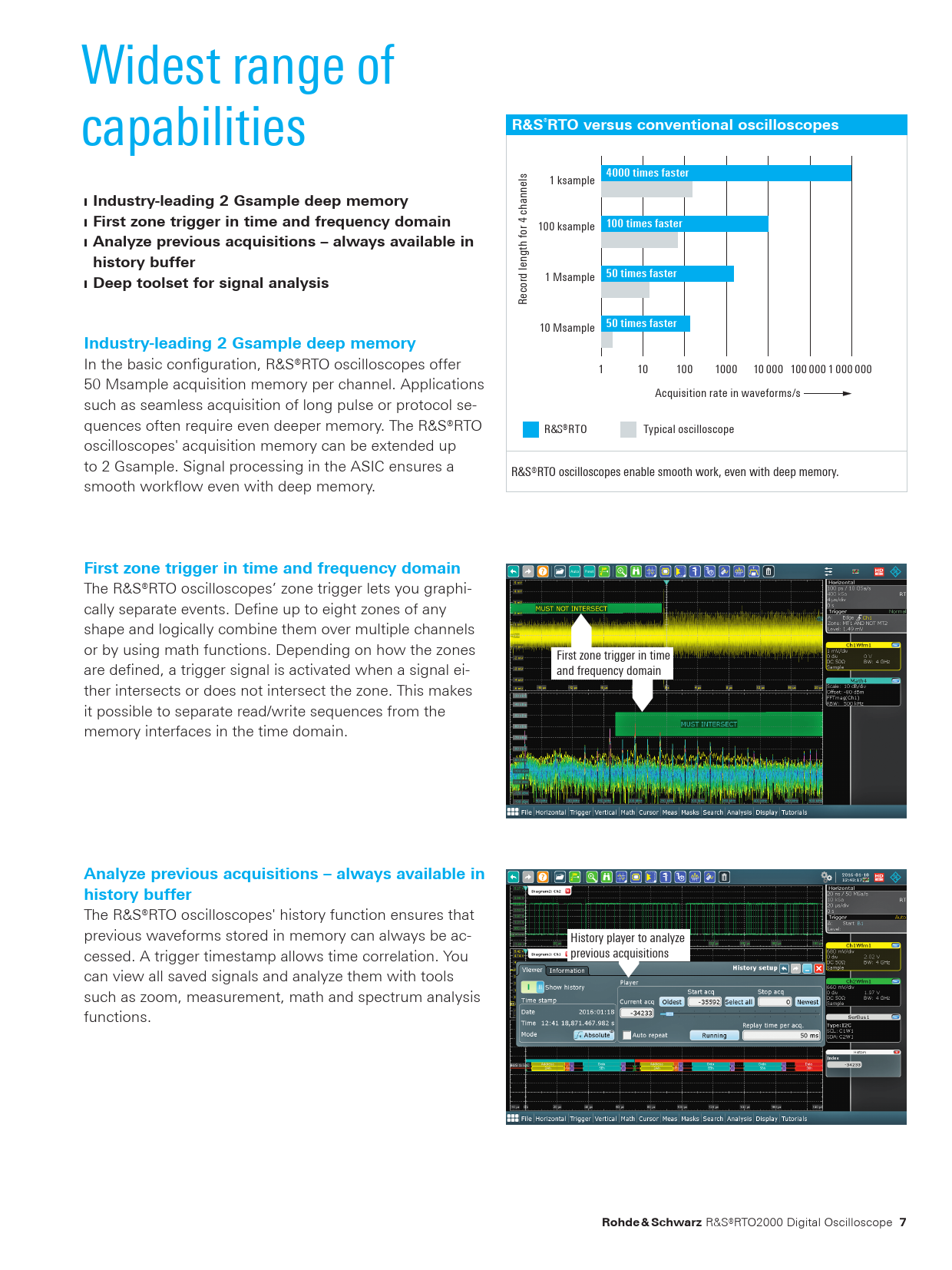 Widest range of capabilities R&S®RTO versus conventional oscilloscopes4000 times faster 1 ksample ❙ Industry-leading 2 Gsample deep memory hannels c ❙ First zone trigger in time and frequency domain 4 100 ksample 100 times faster ❙ Analyze previous acquisitions – always available in ngth for history buffer d le 50 times faster 1 Msample ❙ Deep toolset for signal analysis cor Re 10 Msample 50 times fasterIndustry-leading 2 Gsample deep memory In the basic configuration, R&S®RTO oscilloscopes offer 1 10 100 1000 10 000 100 000 1 000 000 50 Msample acquisition memory per channel. Applications Acquisition rate in waveforms/s such as seamless acquisition of long pulse or protocol se- quences often require even deeper memory. The R&S®RTO ¸RTO Typical oscil oscope oscilloscopes' acquisition memory can be extended up to 2 Gsample. Signal processing in the ASIC ensures a R&S®RTO oscilloscopes enable smooth work, even with deep memory. smooth workflow even with deep memory. First zone trigger in time and frequency domain The R&S®RTO oscilloscopes’ zone trigger lets you graphi- cally separate events. Define up to eight zones of any shape and logically combine them over multiple channels or by using math functions. Depending on how the zones First zone trigger in time are defined, a trigger signal is activated when a signal ei- and frequency domain ther intersects or does not intersect the zone. This makes it possible to separate read/write sequences from the memory interfaces in the time domain. Analyze previous acquisitions – always available in history buffer The R&S®RTO oscilloscopes' history function ensures that previous waveforms stored in memory can always be ac- History player to analyze previous acquisitions cessed. A trigger timestamp allows time correlation. You can view all saved signals and analyze them with tools such as zoom, measurement, math and spectrum analysis functions. Rohde & Schwarz R&S®RTO2000 Digital Oscilloscope 7 RTO2000_bro_en_3607-2684-12_v0901.indd 7 23.11.2017 14:54:12