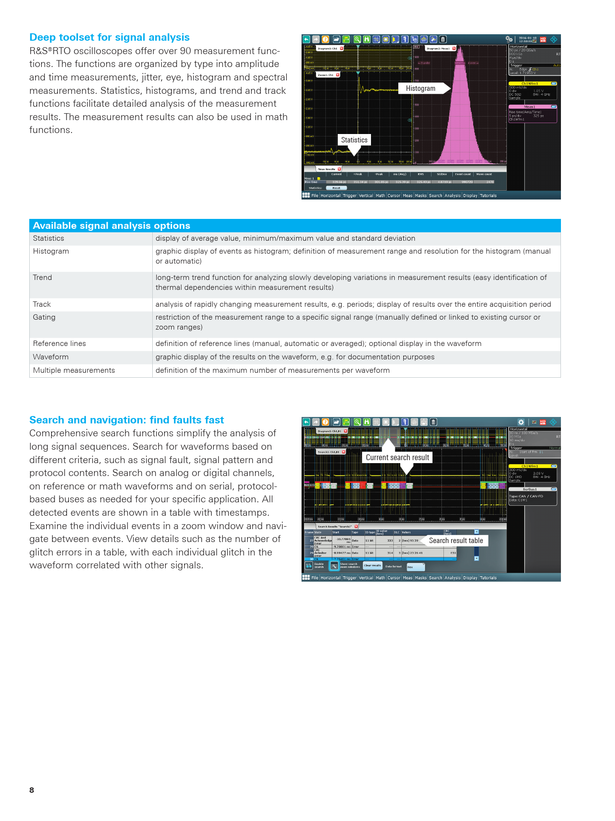 Deep toolset for signal analysis R&S®RTO oscilloscopes offer over 90 measurement func- tions. The functions are organized by type into amplitude and time measurements, jitter, eye, histogram and spectral Histogram measurements. Statistics, histograms, and trend and track functions facilitate detailed analysis of the measurement results. The measurement results can also be used in math functions. Statistics Available signal analysis options Statistics display of average value, minimum/maximum value and standard deviation Histogram graphic display of events as histogram; definition of measurement range and resolution for the histogram (manual or automatic) Trend long-term trend function for analyzing slowly developing variations in measurement results (easy identification of thermal dependencies within measurement results) Track analysis of rapidly changing measurement results, e.g. periods; display of results over the entire acquisition period Gating restriction of the measurement range to a specific signal range (manually defined or linked to existing cursor or zoom ranges) Reference lines definition of reference lines (manual, automatic or averaged); optional display in the waveform Waveform graphic display of the results on the waveform, e.g. for documentation purposes Multiple measurements definition of the maximum number of measurements per waveform Search and navigation: find faults fast Comprehensive search functions simplify the analysis of long signal sequences. Search for waveforms based on Current search result different criteria, such as signal fault, signal pattern and protocol contents. Search on analog or digital channels, on reference or math waveforms and on serial, protocol- based buses as needed for your specific application. All detected events are shown in a table with timestamps. Examine the individual events in a zoom window and navi- gate between events. View details such as the number of Search result table glitch errors in a table, with each individual glitch in the waveform correlated with other signals. 8 RTO2000_bro_en_3607-2684-12_v0901.indd 8 23.11.2017 14:54:13