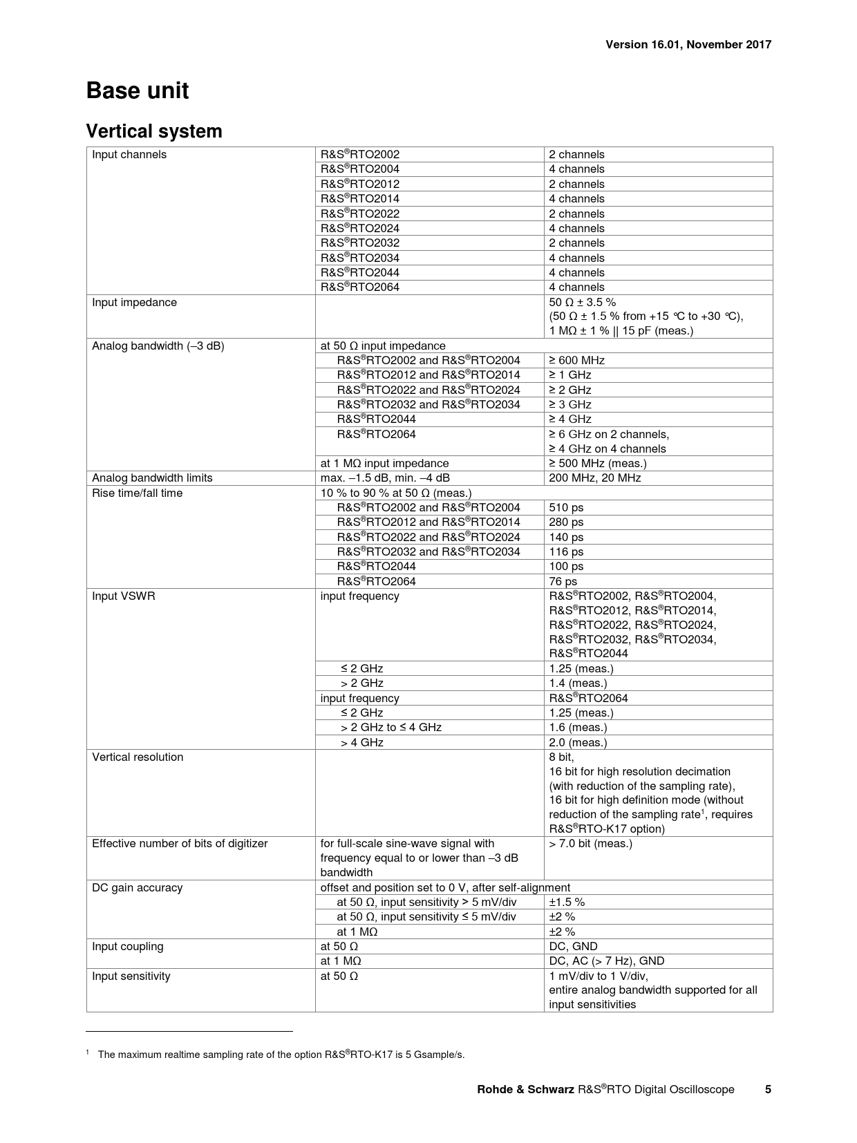 Version 16.01, November 2017Base unitVertical system Input channels R&S®RTO2002 2 channels R&S®RTO2004 4 channels R&S®RTO2012 2 channels R&S®RTO2014 4 channels R&S®RTO2022 2 channels R&S®RTO2024 4 channels R&S®RTO2032 2 channels R&S®RTO2034 4 channels R&S®RTO2044 4 channels R&S®RTO2064 4 channels Input impedance 50 Ω ± 3.5 % (50 Ω ± 1.5 % from +15 °C to +30 °C), 1 MΩ ± 1 % || 15 pF (meas.) Analog bandwidth (–3 dB) at 50 Ω input impedance R&S®RTO2002 and R&S®RTO2004 ≥ 600 MHz R&S®RTO2012 and R&S®RTO2014 ≥ 1 GHz R&S®RTO2022 and R&S®RTO2024 ≥ 2 GHz R&S®RTO2032 and R&S®RTO2034 ≥ 3 GHz R&S®RTO2044 ≥ 4 GHz R&S®RTO2064 ≥ 6 GHz on 2 channels, ≥ 4 GHz on 4 channels at 1 MΩ input impedance ≥ 500 MHz (meas.) Analog bandwidth limits max. –1.5 dB, min. –4 dB 200 MHz, 20 MHz Rise time/fall time 10 % to 90 % at 50 Ω (meas.) R&S®RTO2002 and R&S®RTO2004 510 ps R&S®RTO2012 and R&S®RTO2014 280 ps R&S®RTO2022 and R&S®RTO2024 140 ps R&S®RTO2032 and R&S®RTO2034 116 ps R&S®RTO2044 100 ps R&S®RTO2064 76 ps Input VSWR input frequency R&S®RTO2002, R&S®RTO2004, R&S®RTO2012, R&S®RTO2014, R&S®RTO2022, R&S®RTO2024, R&S®RTO2032, R&S®RTO2034, R&S®RTO2044 ≤ 2 GHz 1.25 (meas.) > 2 GHz 1.4 (meas.) input frequency R&S®RTO2064 ≤ 2 GHz 1.25 (meas.) > 2 GHz to ≤ 4 GHz 1.6 (meas.) > 4 GHz 2.0 (meas.) Vertical resolution 8 bit, 16 bit for high resolution decimation (with reduction of the sampling rate), 16 bit for high definition mode (without reduction of the sampling rate1, requires R&S®RTO-K17 option) Effective number of bits of digitizer for full-scale sine-wave signal with > 7.0 bit (meas.) frequency equal to or lower than –3 dB bandwidth DC gain accuracy offset and position set to 0 V, after self-alignment at 50 Ω, input sensitivity > 5 mV/div ±1.5 % at 50 Ω, input sensitivity ≤ 5 mV/div ±2 % at 1 MΩ ±2 % Input coupling at 50 Ω DC, GND at 1 MΩ DC, AC (> 7 Hz), GND Input sensitivity at 50 Ω 1 mV/div to 1 V/div, entire analog bandwidth supported for all input sensitivities 1 The maximum realtime sampling rate of the option R&S®RTO-K17 is 5 Gsample/s. Rohde & Schwarz R&S®RTO Digital Oscilloscope 5
