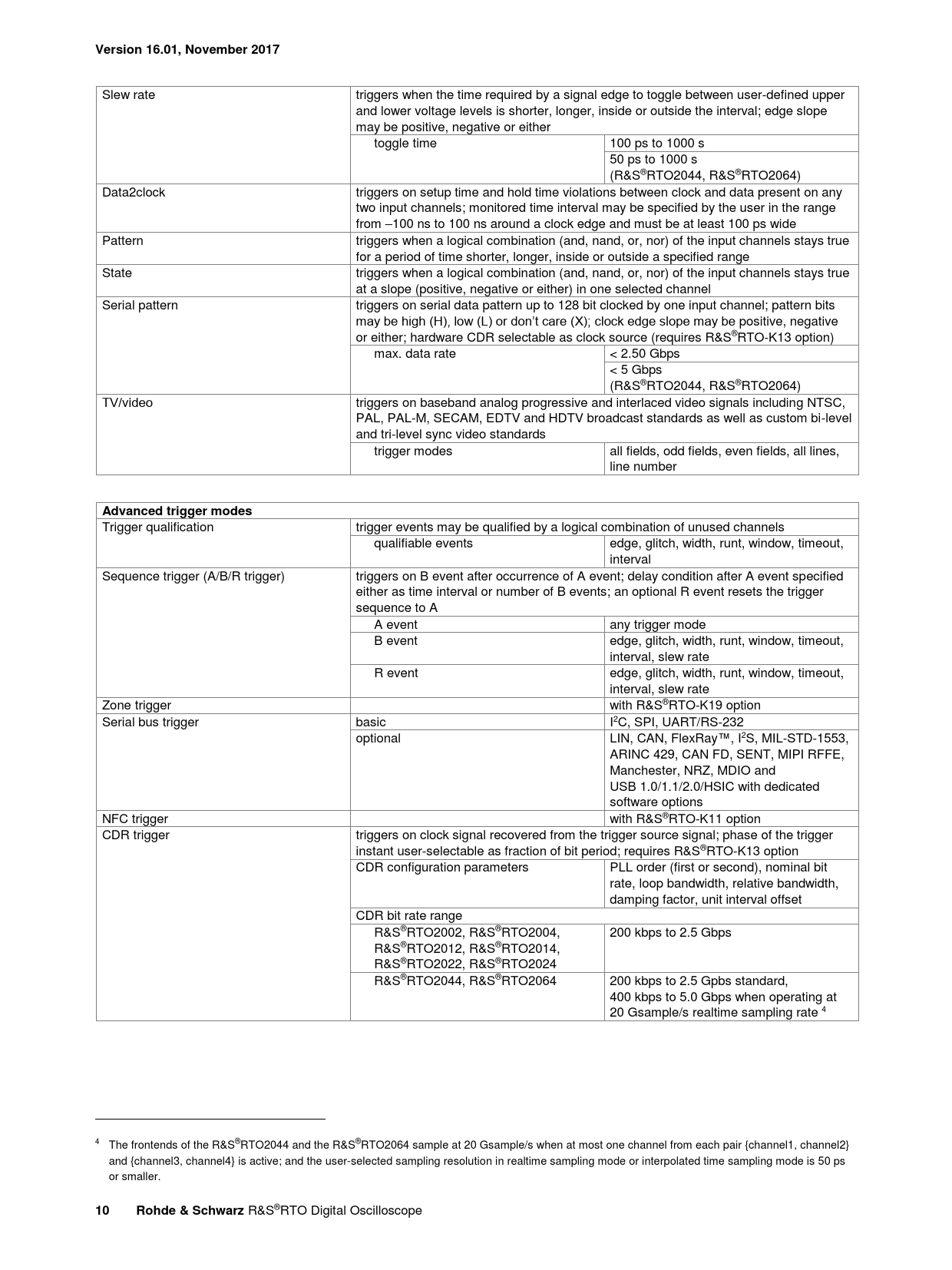 Version 16.01, November 2017 Slew rate triggers when the time required by a signal edge to toggle between user-defined upper and lower voltage levels is shorter, longer, inside or outside the interval; edge slope may be positive, negative or either toggle time 100 ps to 1000 s 50 ps to 1000 s (R&S®RTO2044, R&S®RTO2064) Data2clock triggers on setup time and hold time violations between clock and data present on any two input channels; monitored time interval may be specified by the user in the range from –100 ns to 100 ns around a clock edge and must be at least 100 ps wide Pattern triggers when a logical combination (and, nand, or, nor) of the input channels stays true for a period of time shorter, longer, inside or outside a specified range State triggers when a logical combination (and, nand, or, nor) of the input channels stays true at a slope (positive, negative or either) in one selected channel Serial pattern triggers on serial data pattern up to 128 bit clocked by one input channel; pattern bits may be high (H), low (L) or don’t care (X); clock edge slope may be positive, negative or either; hardware CDR selectable as clock source (requires R&S®RTO-K13 option) max. data rate < 2.50 Gbps < 5 Gbps (R&S®RTO2044, R&S®RTO2064) TV/video triggers on baseband analog progressive and interlaced video signals including NTSC, PAL, PAL-M, SECAM, EDTV and HDTV broadcast standards as well as custom bi-level and tri-level sync video standards trigger modes all fields, odd fields, even fields, all lines, line number Advanced trigger modes Trigger qualification trigger events may be qualified by a logical combination of unused channels qualifiable events edge, glitch, width, runt, window, timeout, interval Sequence trigger (A/B/R trigger) triggers on B event after occurrence of A event; delay condition after A event specified either as time interval or number of B events; an optional R event resets the trigger sequence to A A event any trigger mode B event edge, glitch, width, runt, window, timeout, interval, slew rate R event edge, glitch, width, runt, window, timeout, interval, slew rate Zone trigger with R&S®RTO-K19 option Serial bus trigger basic I2C, SPI, UART/RS-232 optional LIN, CAN, FlexRay™, I2S, MIL-STD-1553, ARINC 429, CAN FD, SENT, MIPI RFFE, Manchester, NRZ, MDIO and USB 1.0/1.1/2.0/HSIC with dedicated software options NFC trigger with R&S®RTO-K11 option CDR trigger triggers on clock signal recovered from the trigger source signal; phase of the trigger instant user-selectable as fraction of bit period; requires R&S®RTO-K13 option CDR configuration parameters PLL order (first or second), nominal bit rate, loop bandwidth, relative bandwidth, damping factor, unit interval offset CDR bit rate range R&S®RTO2002, R&S®RTO2004, 200 kbps to 2.5 Gbps R&S®RTO2012, R&S®RTO2014, R&S®RTO2022, R&S®RTO2024 R&S®RTO2044, R&S®RTO2064 200 kbps to 2.5 Gpbs standard, 400 kbps to 5.0 Gbps when operating at 20 Gsample/s realtime sampling rate 4 4 The frontends of the R&S®RTO2044 and the R&S®RTO2064 sample at 20 Gsample/s when at most one channel from each pair {channel1, channel2} and {channel3, channel4} is active; and the user-selected sampling resolution in realtime sampling mode or interpolated time sampling mode is 50 ps or smaller. 10Rohde & Schwarz R&S®RTO Digital Oscilloscope
