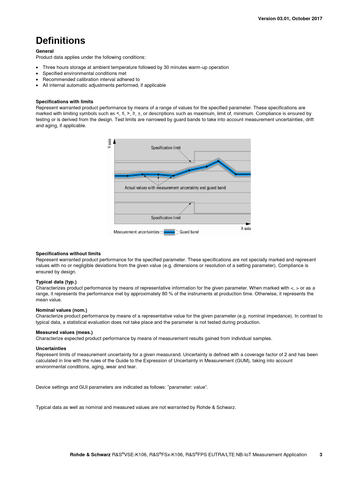 Version 03.01, October 2017Definitions General Product data applies under the following conditions: Three hours storage at ambient temperature followed by 30 minutes warm-up operation Specified environmental conditions met Recommended calibration interval adhered to All internal automatic adjustments performed, if applicable Specifications with limits Represent warranted product performance by means of a range of values for the specified parameter. These specifications are marked with limiting symbols such as <, ≤, >, ≥, ±, or descriptions such as maximum, limit of, minimum. Compliance is ensured by testing or is derived from the design. Test limits are narrowed by guard bands to take into account measurement uncertainties, drift and aging, if applicable. Specifications without limits Represent warranted product performance for the specified parameter. These specifications are not specially marked and represent values with no or negligible deviations from the given value (e.g. dimensions or resolution of a setting parameter). Compliance is ensured by design. Typical data (typ.) Characterizes product performance by means of representative information for the given parameter. When marked with <, > or as a range, it represents the performance met by approximately 80 % of the instruments at production time. Otherwise, it represents the mean value. Nominal values (nom.) Characterize product performance by means of a representative value for the given parameter (e.g. nominal impedance). In contrast to typical data, a statistical evaluation does not take place and the parameter is not tested during production. Measured values (meas.) Characterize expected product performance by means of measurement results gained from individual samples. Uncertainties Represent limits of measurement uncertainty for a given measurand. Uncertainty is defined with a coverage factor of 2 and has been calculated in line with the rules of the Guide to the Expression of Uncertainty in Measurement (GUM), taking into account environmental conditions, aging, wear and tear. Device settings and GUI parameters are indicated as follows: “parameter: value”. Typical data as well as nominal and measured values are not warranted by Rohde & Schwarz. Rohde & Schwarz R&S®VSE-K106, R&S®FSx-K106, R&S®FPS EUTRA/LTE NB-IoT Measurement Application 3