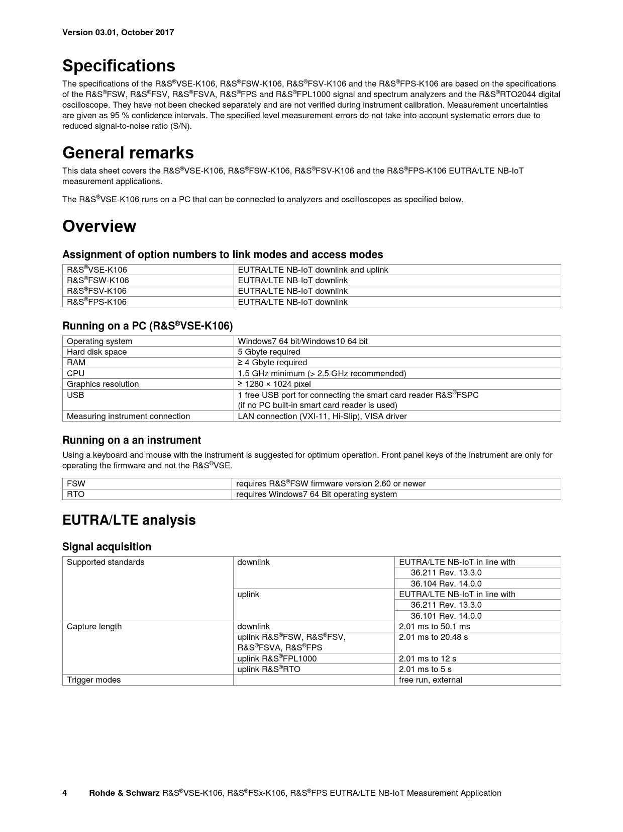 Version 03.01, October 2017Specifications The specifications of the R&S®VSE-K106, R&S®FSW-K106, R&S®FSV-K106 and the R&S®FPS-K106 are based on the specifications of the R&S®FSW, R&S®FSV, R&S®FSVA, R&S®FPS and R&S®FPL1000 signal and spectrum analyzers and the R&S®RTO2044 digital oscilloscope. They have not been checked separately and are not verified during instrument calibration. Measurement uncertainties are given as 95 % confidence intervals. The specified level measurement errors do not take into account systematic errors due to reduced signal-to-noise ratio (S/N). General remarks This data sheet covers the R&S®VSE-K106, R&S®FSW-K106, R&S®FSV-K106 and the R&S®FPS-K106 EUTRA/LTE NB-IoT measurement applications. The R&S®VSE-K106 runs on a PC that can be connected to analyzers and oscilloscopes as specified below. OverviewAssignment of option numbers to link modes and access modes R&S®VSE-K106 EUTRA/LTE NB-IoT downlink and uplink R&S®FSW-K106 EUTRA/LTE NB-IoT downlink R&S®FSV-K106 EUTRA/LTE NB-IoT downlink R&S®FPS-K106 EUTRA/LTE NB-IoT downlink Running on a PC (R&S®VSE-K106) Operating system Windows7 64 bit/Windows10 64 bit Hard disk space 5 Gbyte required RAM ≥ 4 Gbyte required CPU 1.5 GHz minimum (> 2.5 GHz recommended) Graphics resolution ≥ 1280 × 1024 pixel USB 1 free USB port for connecting the smart card reader R&S®FSPC (if no PC built-in smart card reader is used) Measuring instrument connection LAN connection (VXI-11, Hi-Slip), VISA driver Running on a an instrument Using a keyboard and mouse with the instrument is suggested for optimum operation. Front panel keys of the instrument are only for operating the firmware and not the R&S®VSE. FSW requires R&S®FSW firmware version 2.60 or newer RTO requires Windows7 64 Bit operating system EUTRA/LTE analysisSignal acquisition Supported standards downlink EUTRA/LTE NB-IoT in line with 36.211 Rev. 13.3.0 36.104 Rev. 14.0.0 uplink EUTRA/LTE NB-IoT in line with 36.211 Rev. 13.3.0 36.101 Rev. 14.0.0 Capture length downlink 2.01 ms to 50.1 ms uplink R&S®FSW, R&S®FSV, 2.01 ms to 20.48 s R&S®FSVA, R&S®FPS uplink R&S®FPL1000 2.01 ms to 12 s uplink R&S®RTO 2.01 ms to 5 s Trigger modes free run, external 4Rohde & Schwarz R&S®VSE-K106, R&S®FSx-K106, R&S®FPS EUTRA/LTE NB-IoT Measurement Application